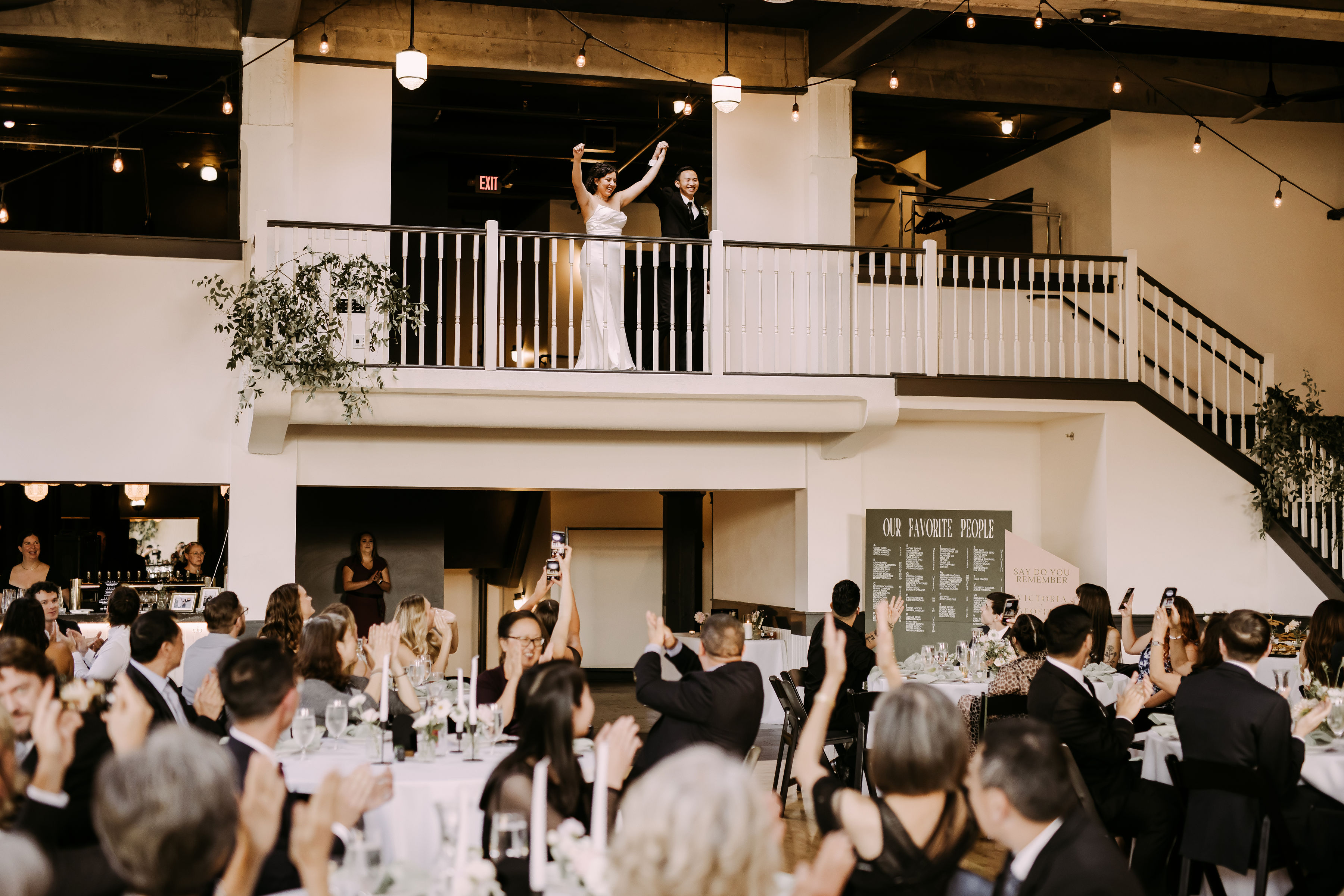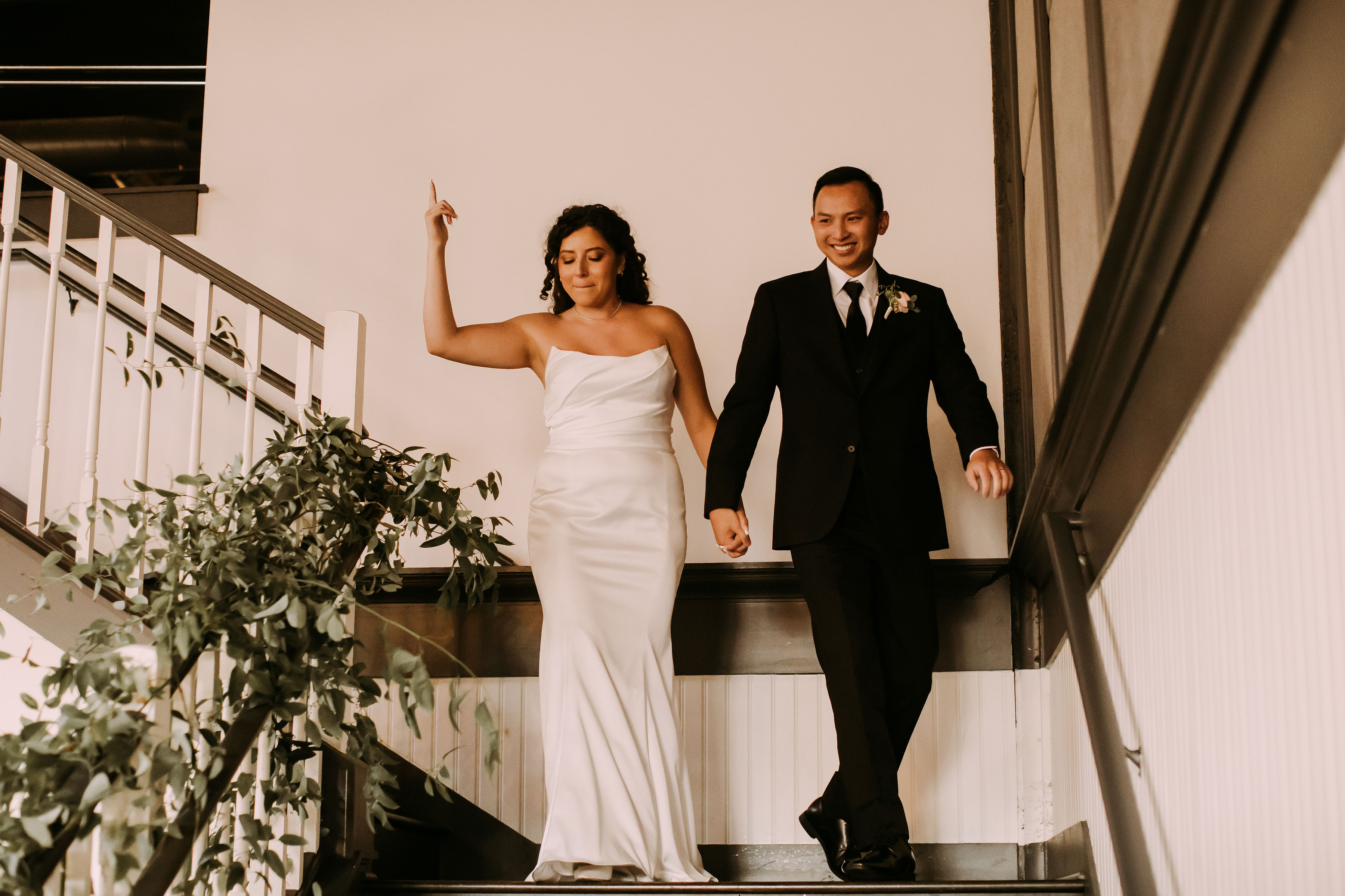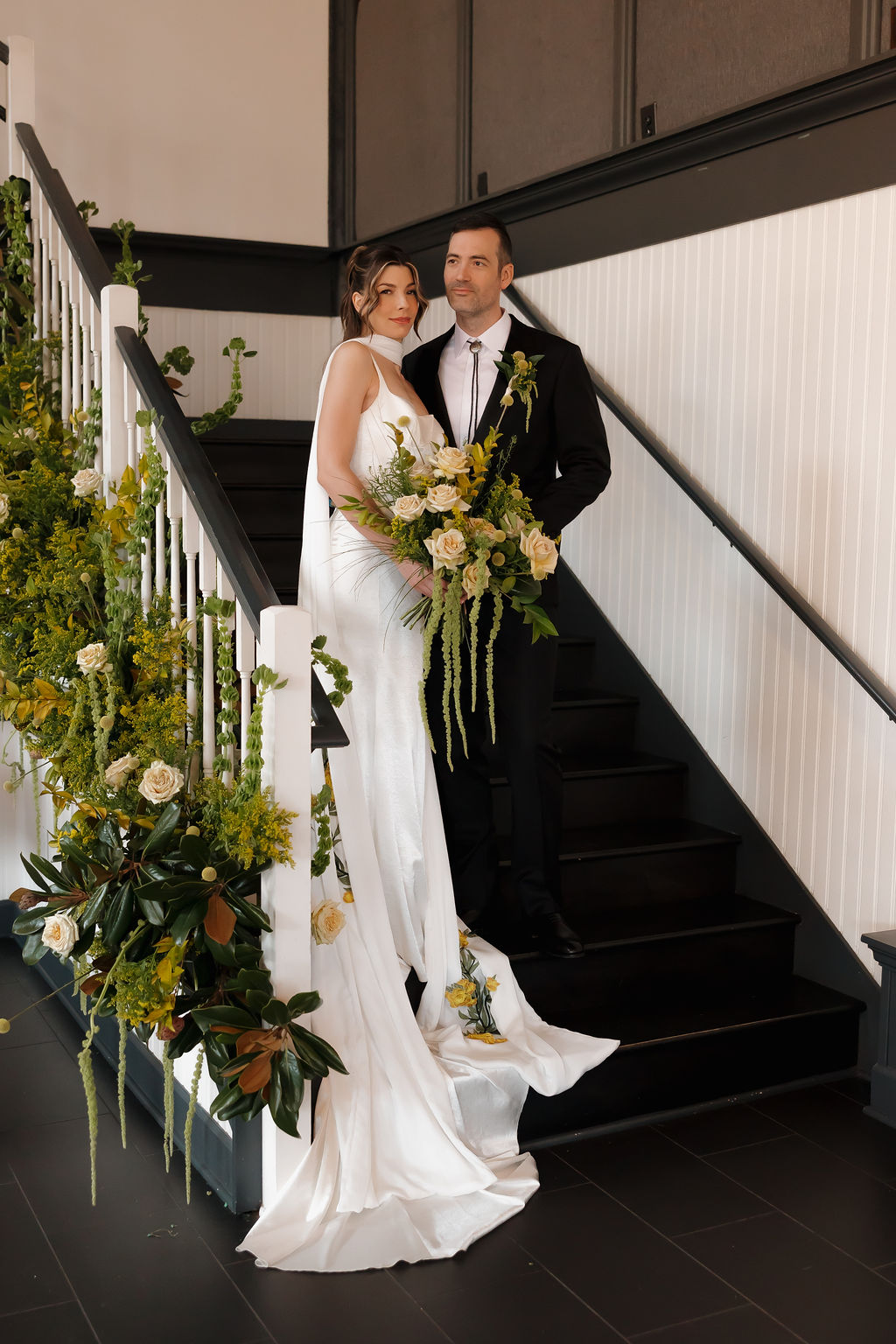 A staircase, especially one that will get use during your ceremony or reception, is a great place to add floral. Opt for a voluminous swath of florals and foliage or keep it simple with garland or vining greenery.