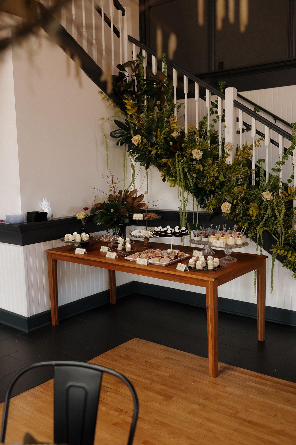 You may also consider moving flowers from your ceremony to some place near your dessert table - like how we set the deconstructed arbor behind the table below. If you have large, upgrowing pieces, we can move them to sit in front of the dessert stand or table. Or opt to decorate with a medium arrangement or bud vases.