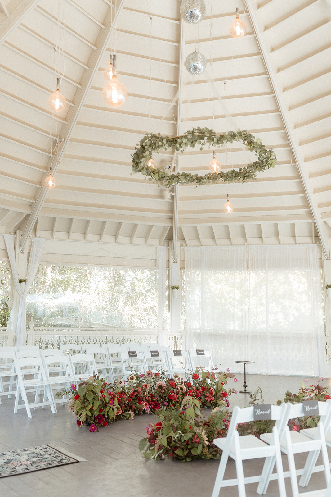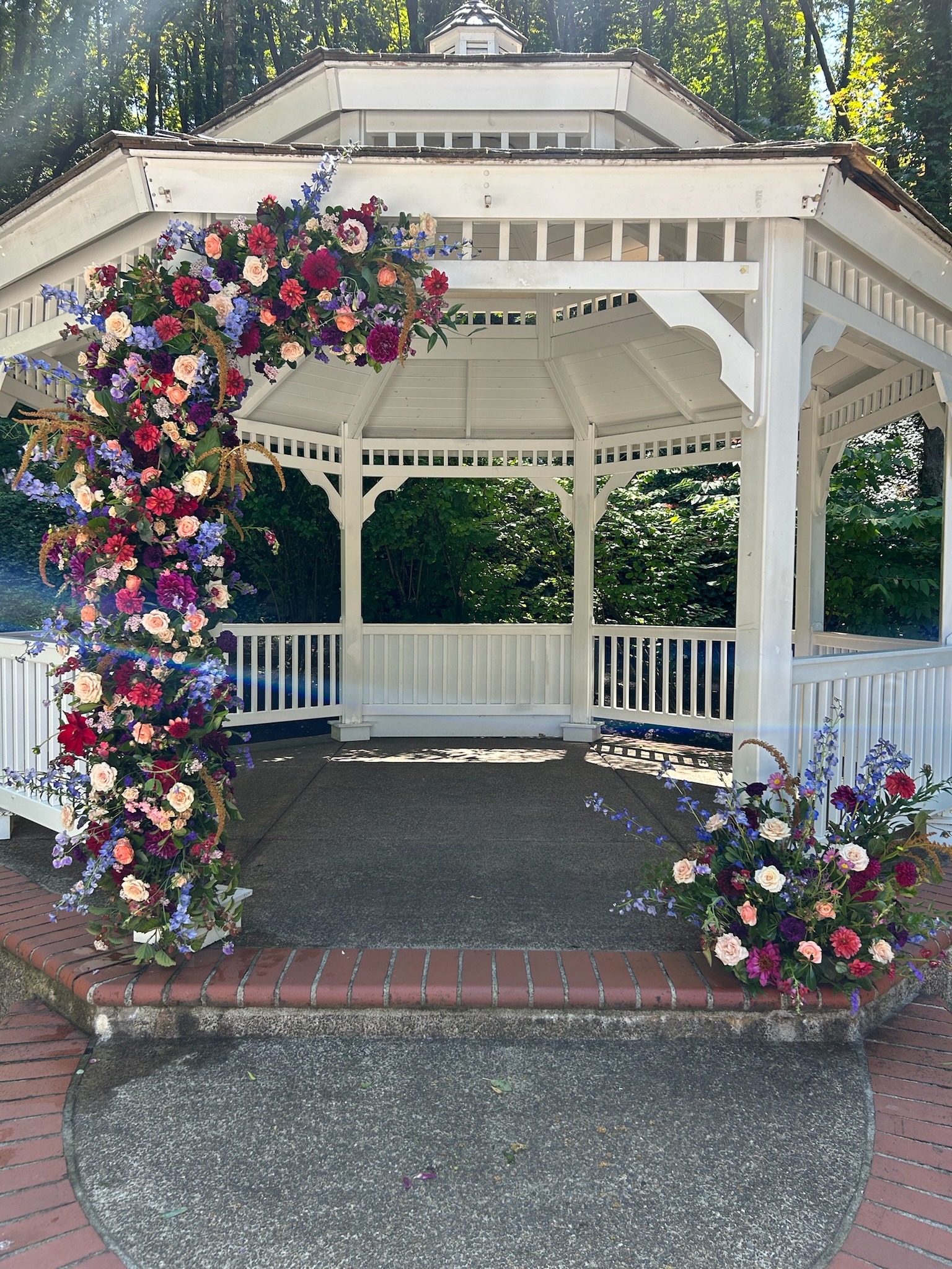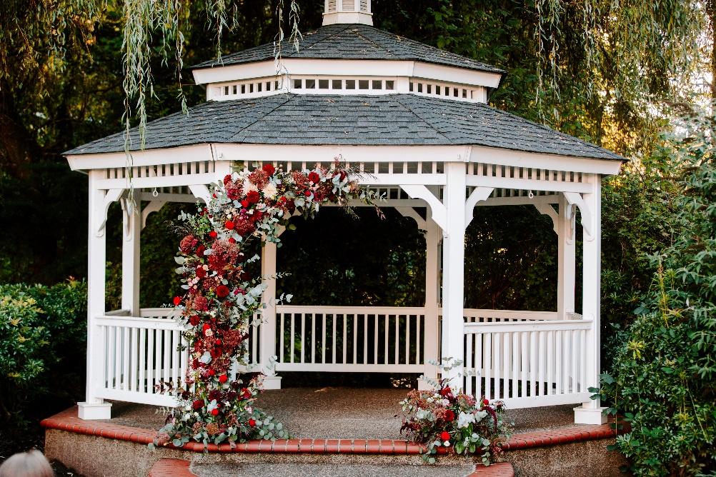 Arbors are structures that serve as a backdrop or frame for your ceremony. They often come in various shapes such as triangles, hexagons, hoops, or arches and are typically made of wood or metal. See what arbors we have available to rent here. Gazebos and other permanent structures at venues are also great places to affix florals.