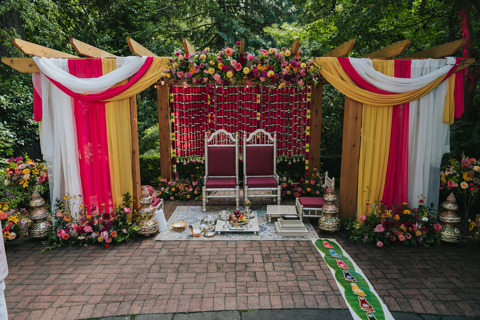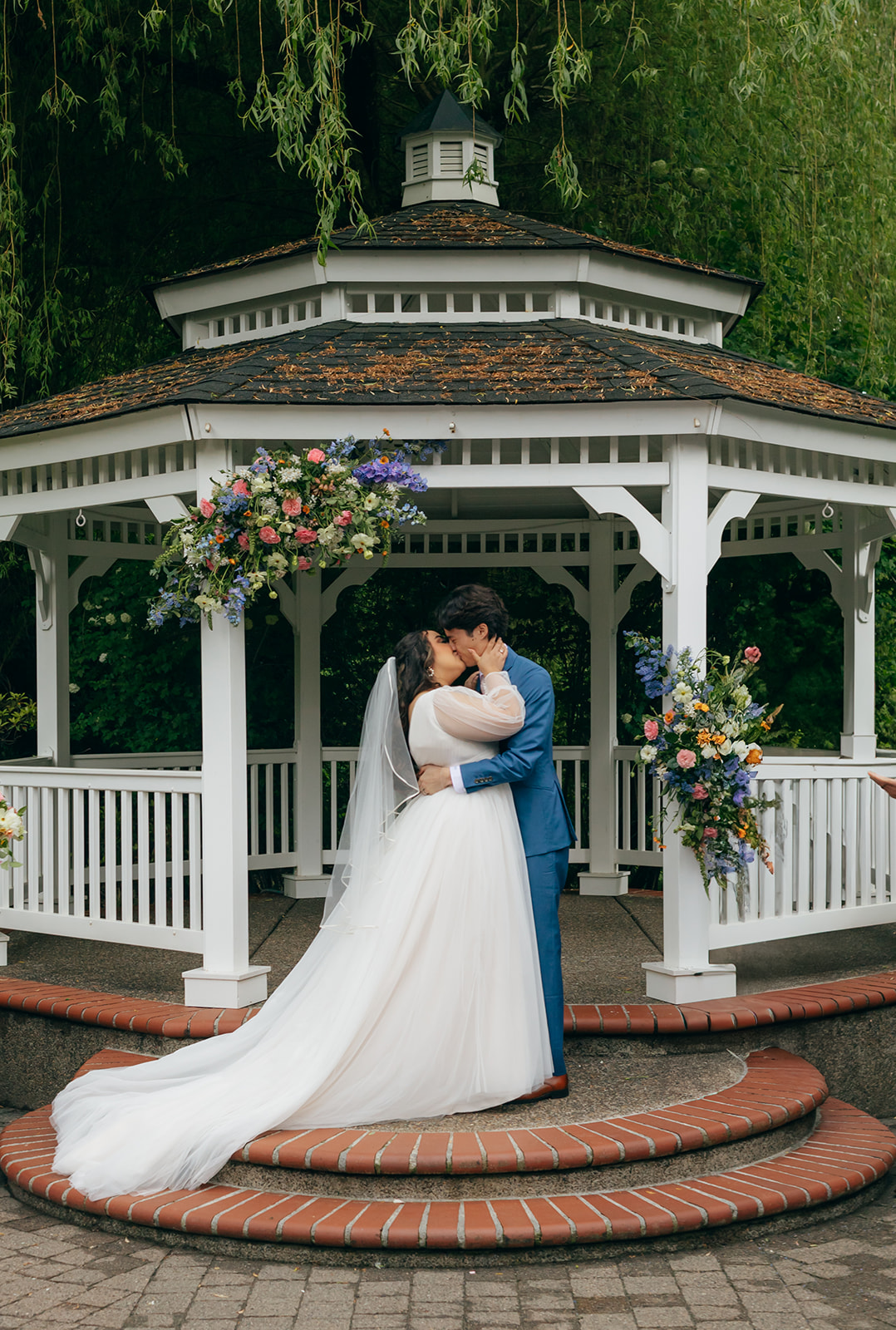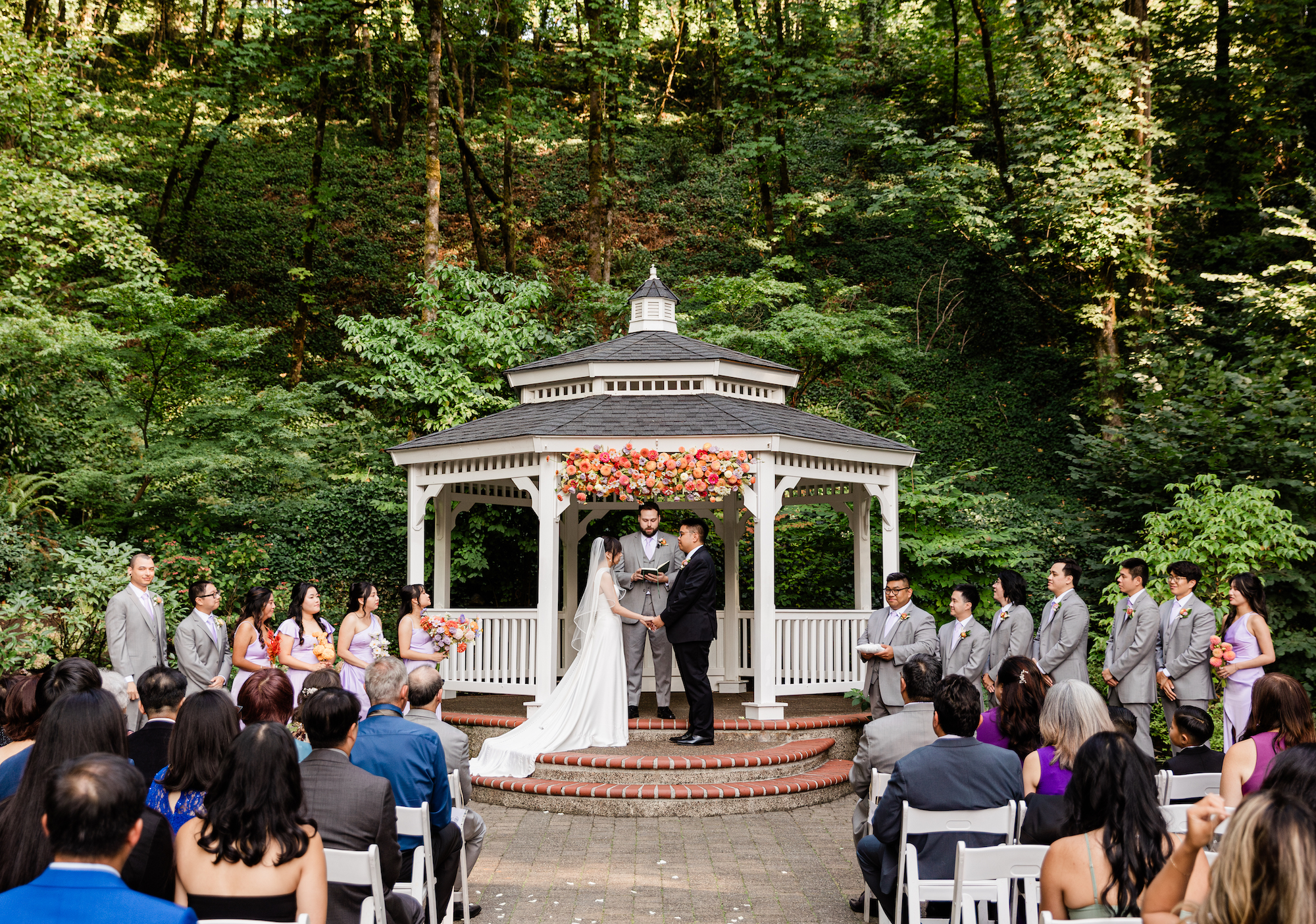 Arbors are structures that serve as a backdrop or frame for your ceremony. They often come in various shapes such as triangles, hexagons, hoops, or arches and are typically made of wood or metal. See what arbors we have available to rent here. Gazebos and other permanent structures at venues are also great places to affix florals.