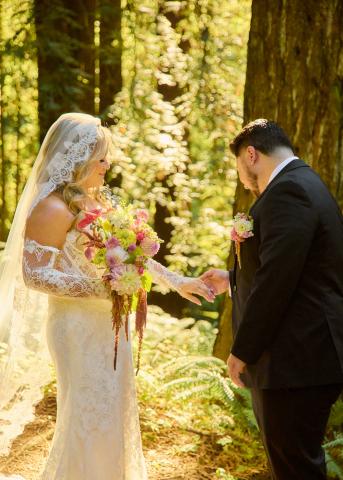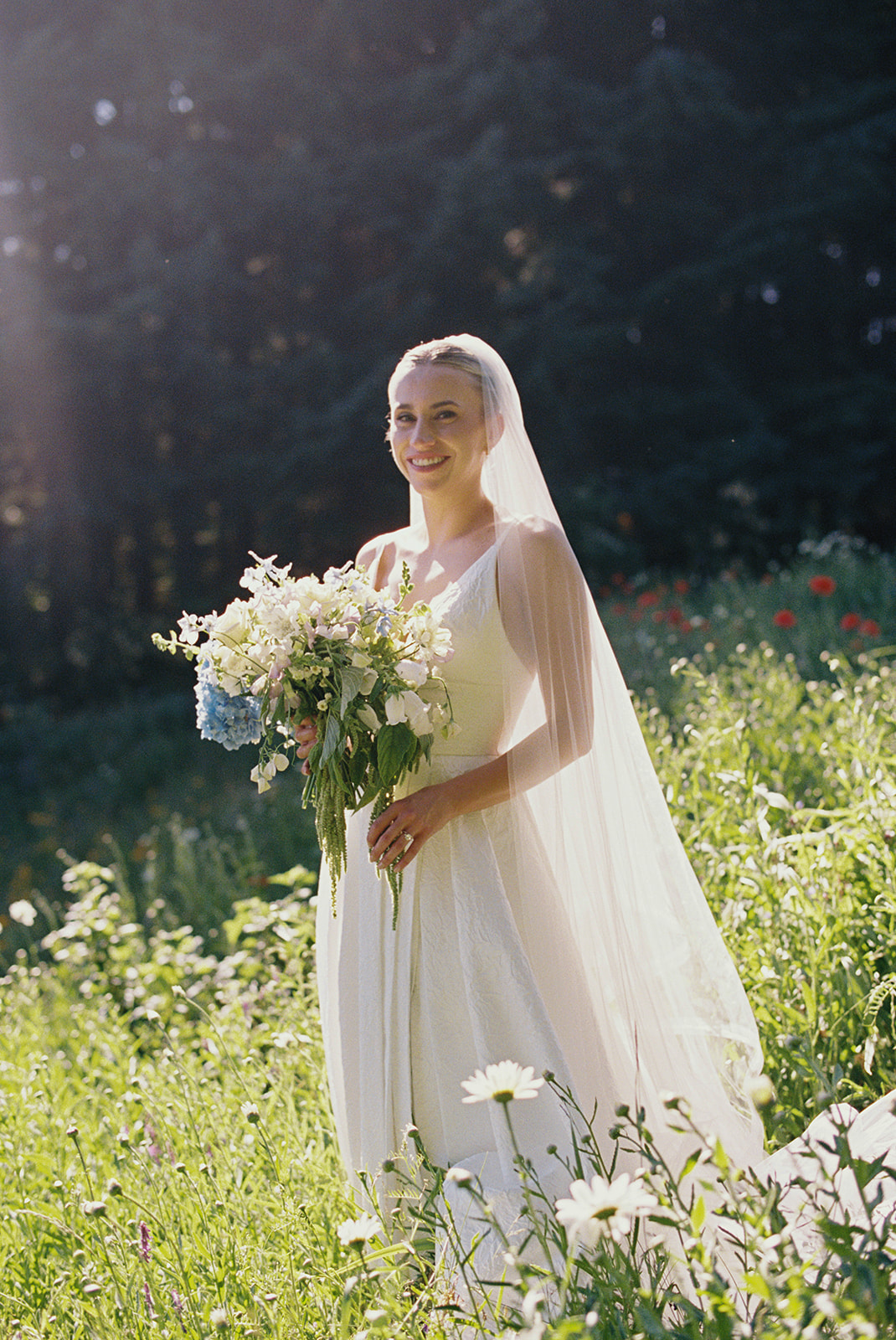 Lauren & Matt dreamt of a wildflower wedding full of light blues, whites, and greens. We mixed chartreuse amaranth with true green foliage like mint and lemon balm to create whimsical designs full of texture. The light blue hydrangea and delphinium added a pop of color while still feeling romantic and light.