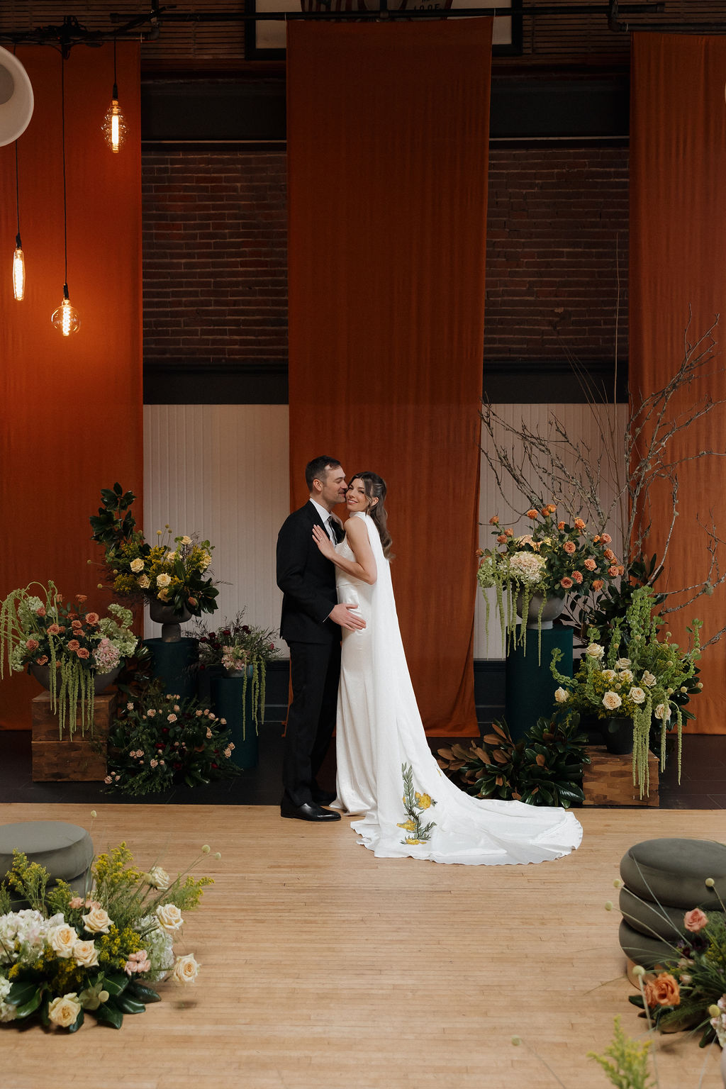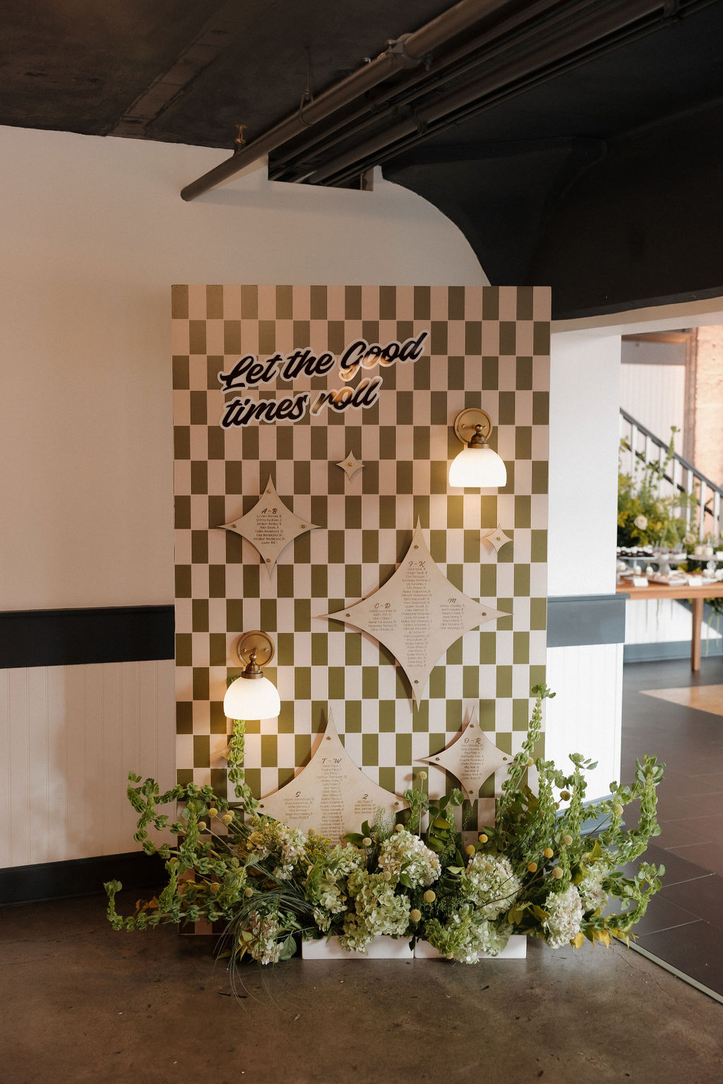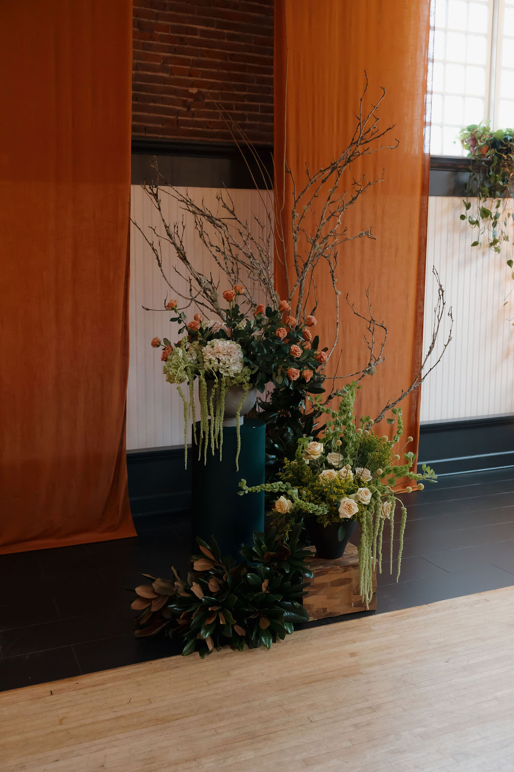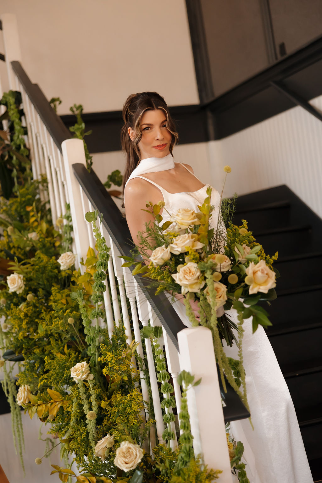 Chartreuse marries well with earth tones such as dark green, brown, mustard, and terracotta. The bright, yellow-green creates contrast and adds dimension resulting in a groovy, playful, 70s atmosphere. For this styled shoot at The Evergreen we brought in chartreuse with amaranth, bells of Ireland, and hydrangea and added warmth with terracotta and beige roses, dark green & brown magnolia leaves, yellow solidago, and craspedia.