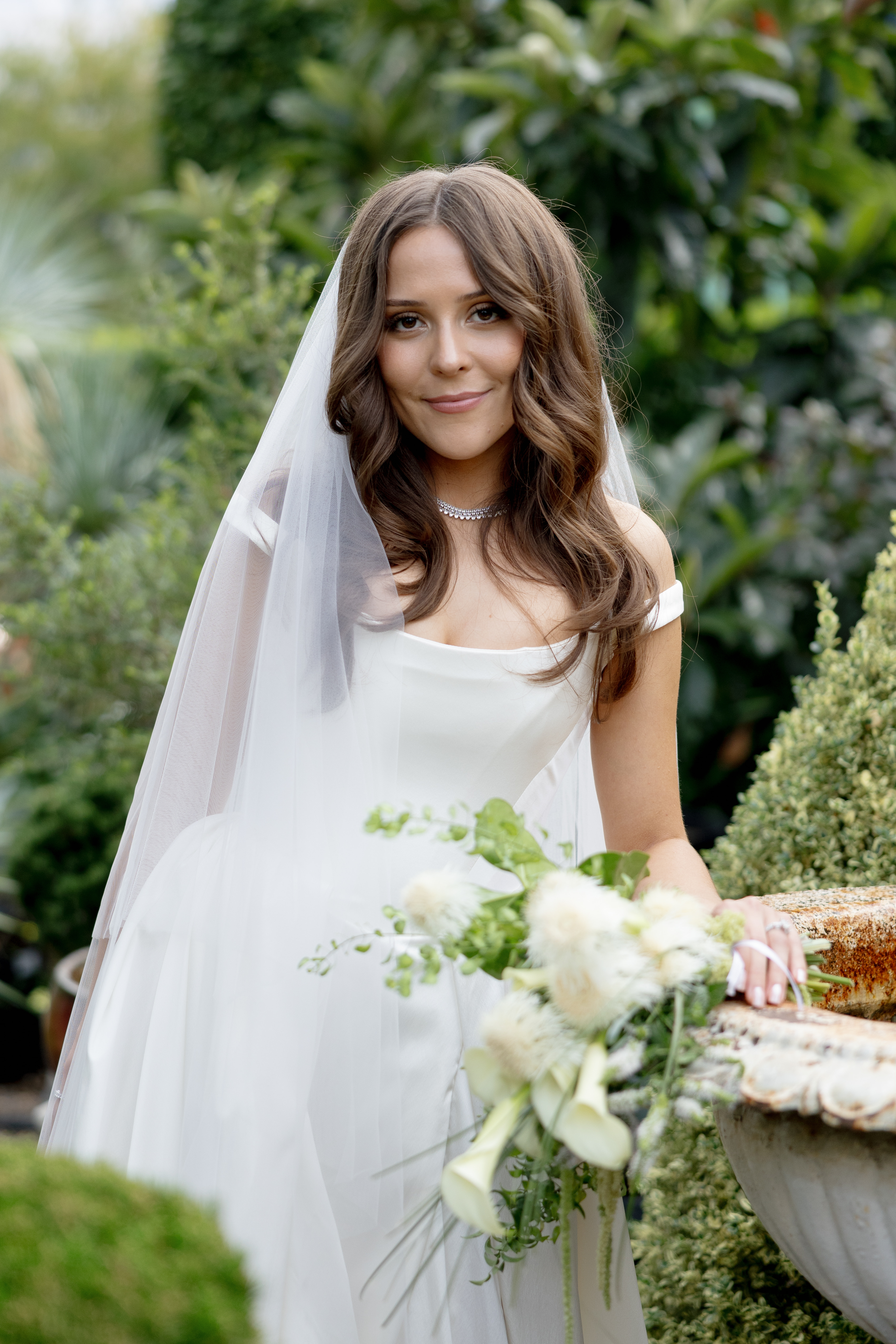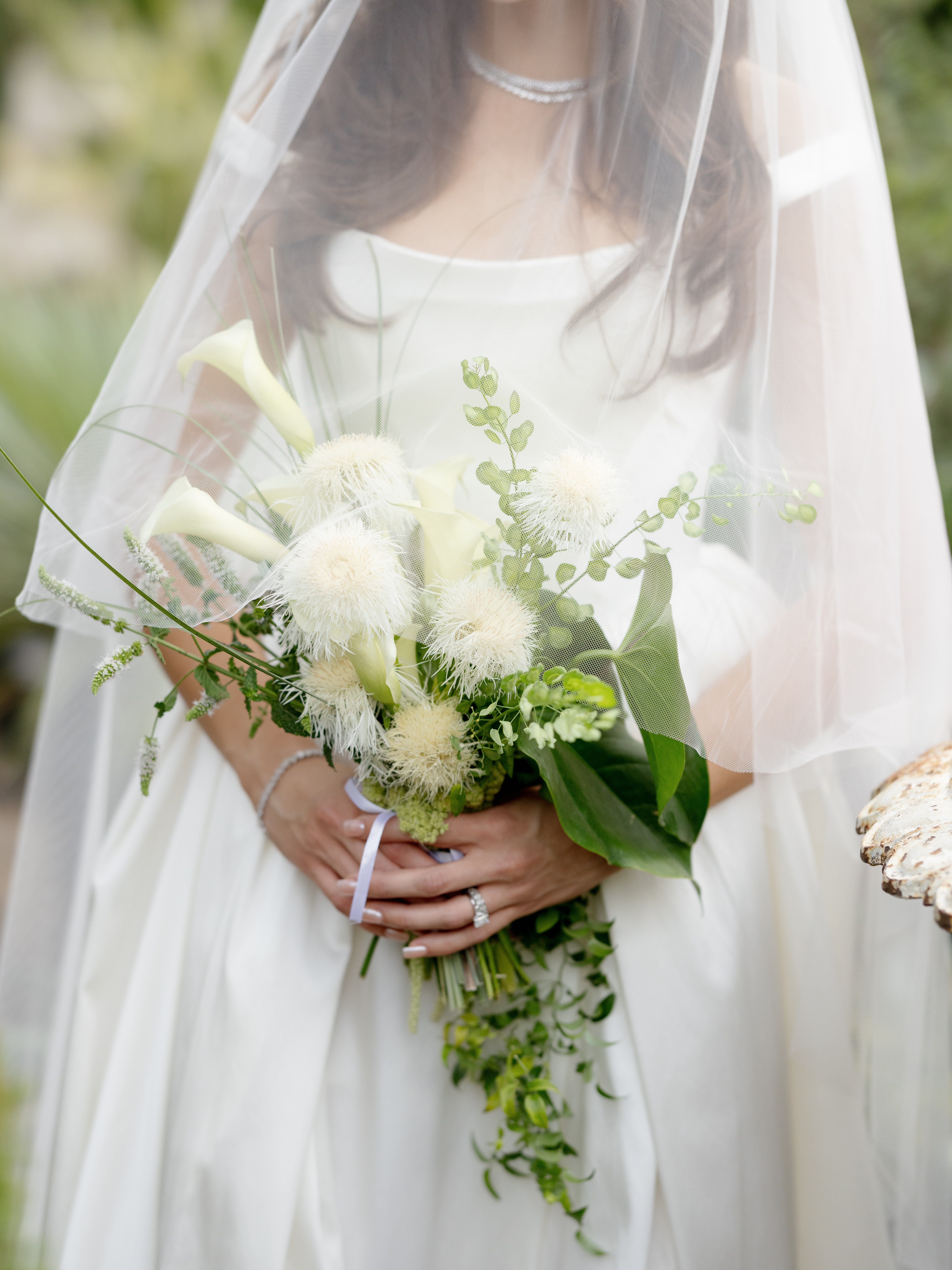 We use a range of greenery, from dark italian ruscus to blue-toned eucalyptus with small & large white blooms to create a style that feels both traditional and garden party.