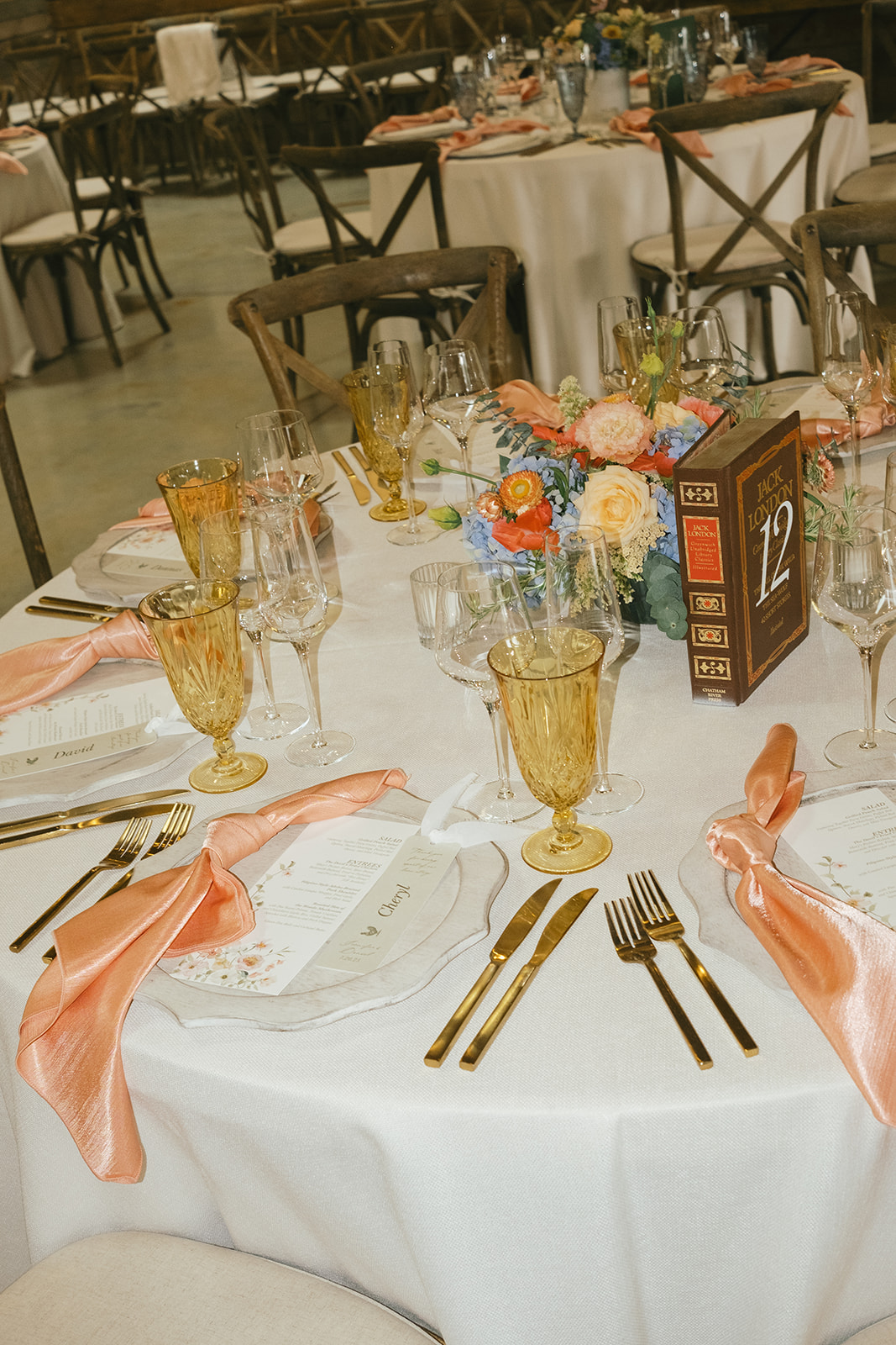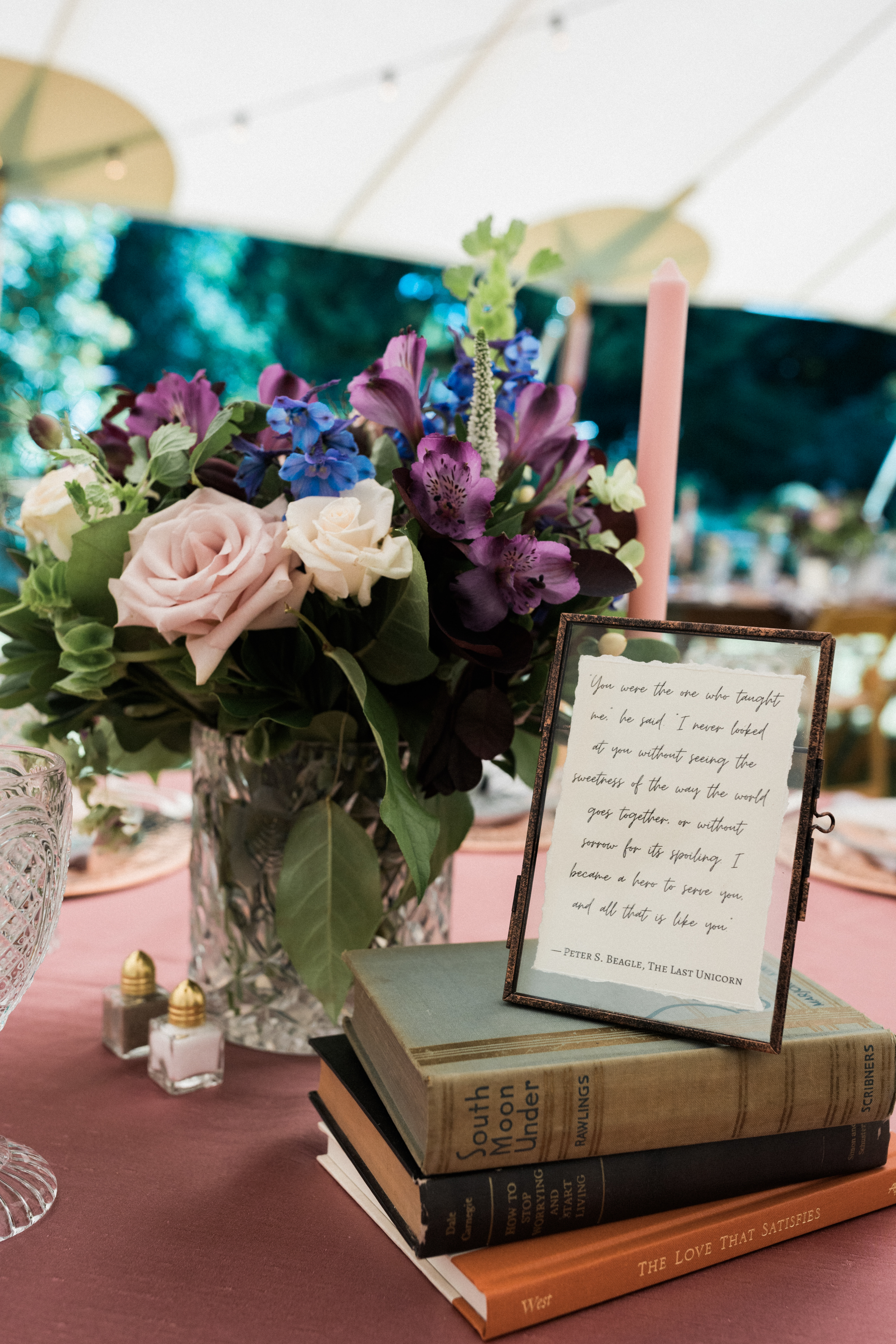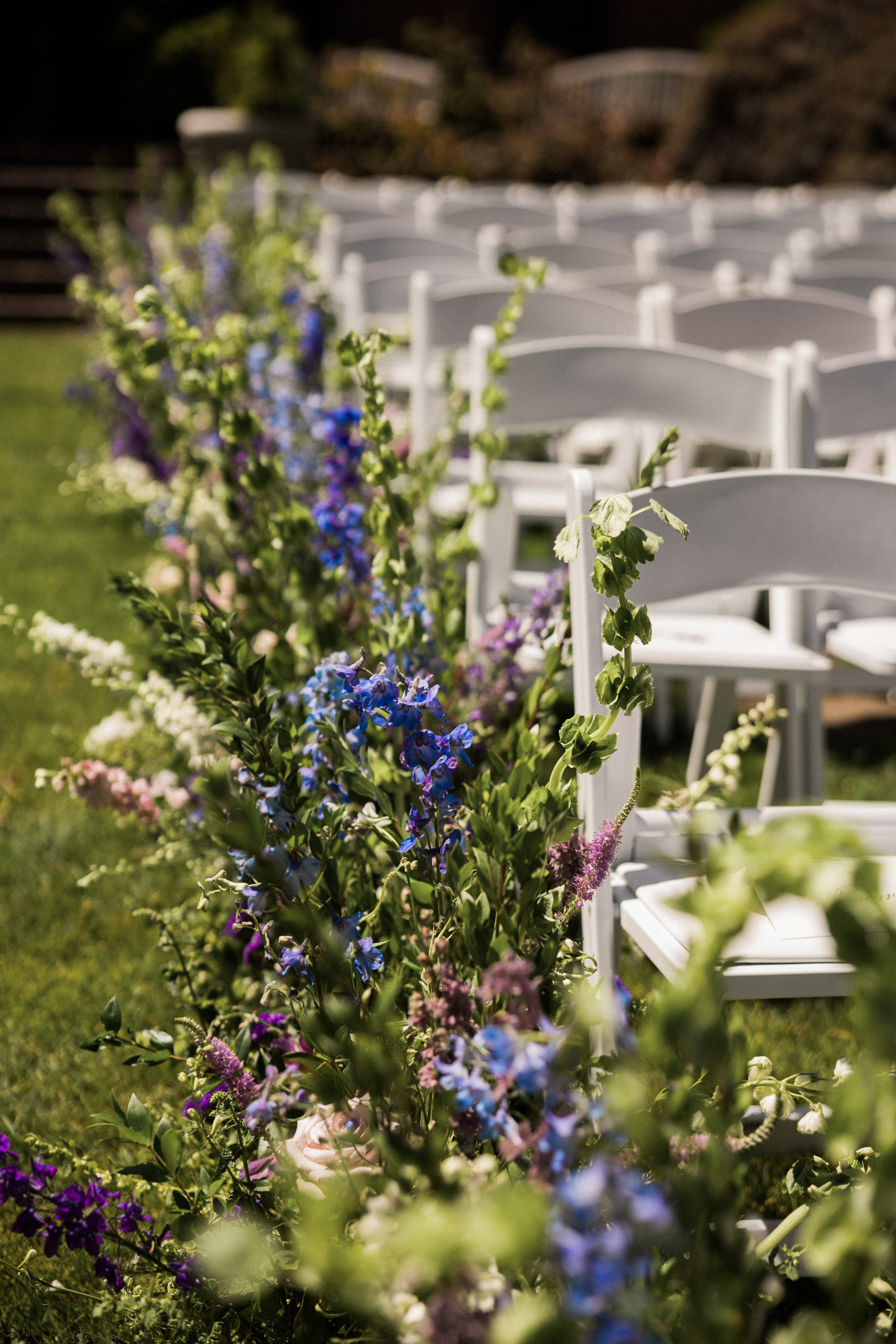 We mixed vintage elements with garden party styling for this whimsical summer wedding. We used vintage fruit bowls for the footed compotes full of romantic blooms like roses, dahlias, and delphinium. Larkspur, bells of Ireland, and veronica added a textural element to all of the designs.