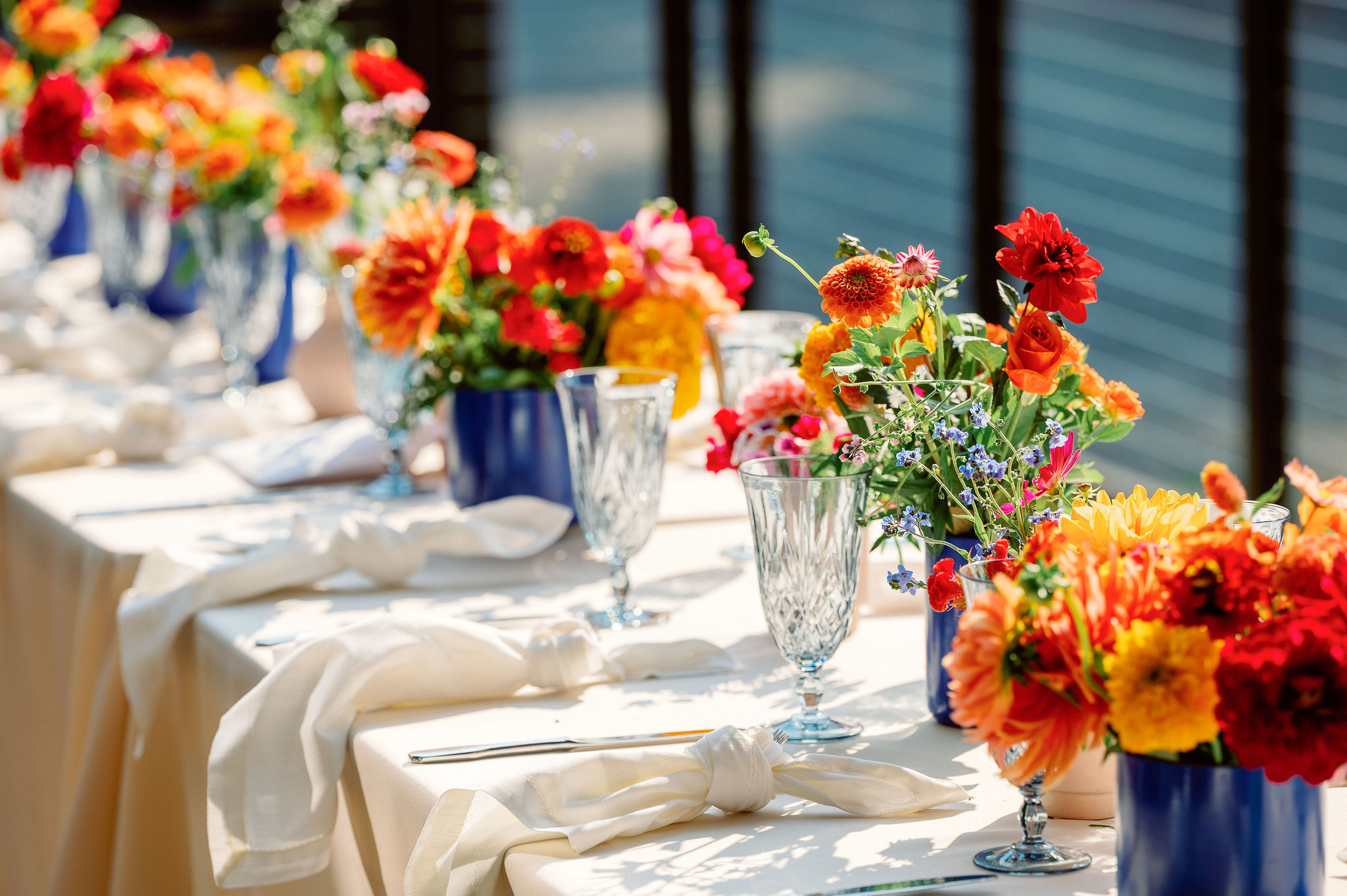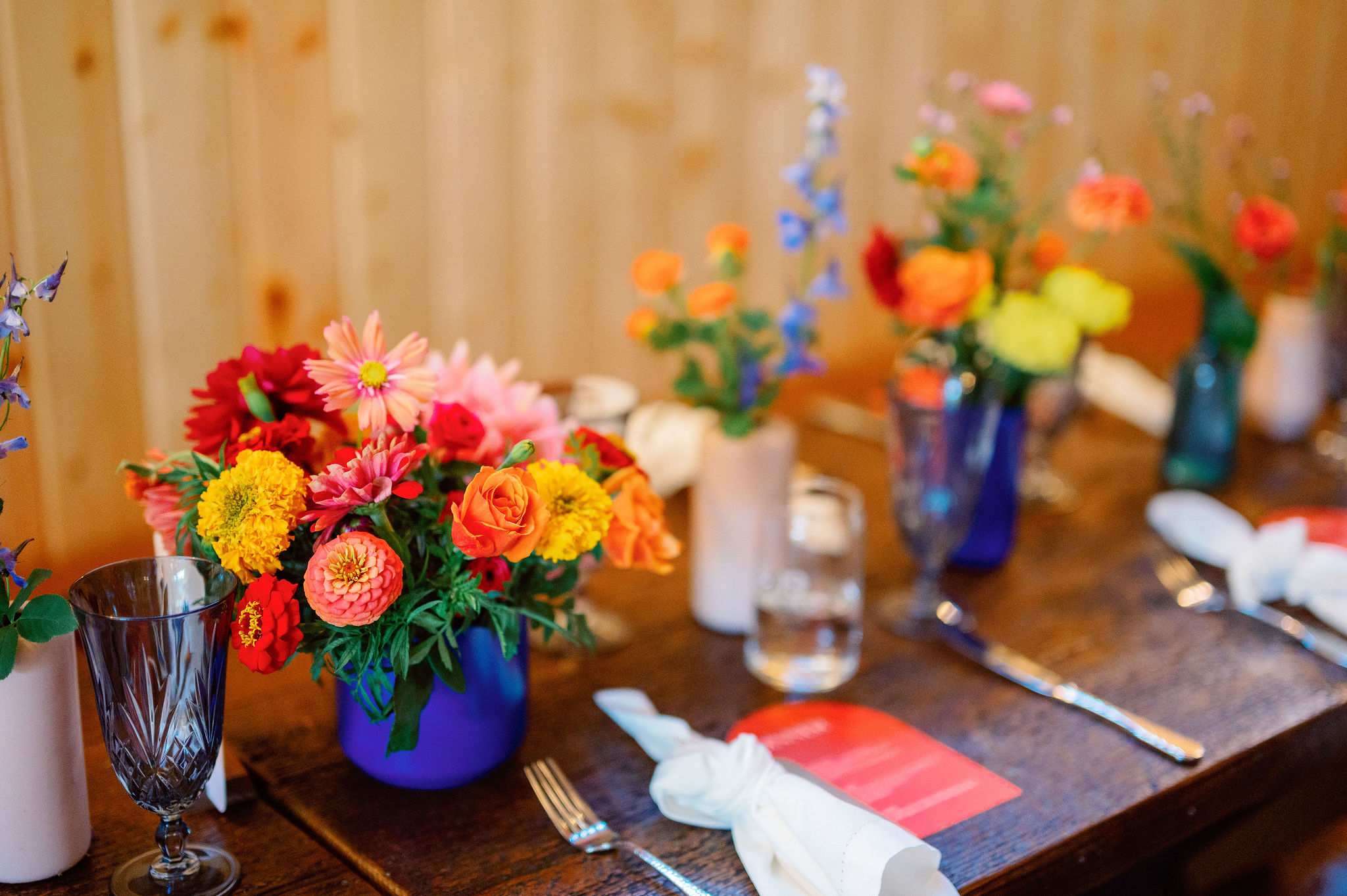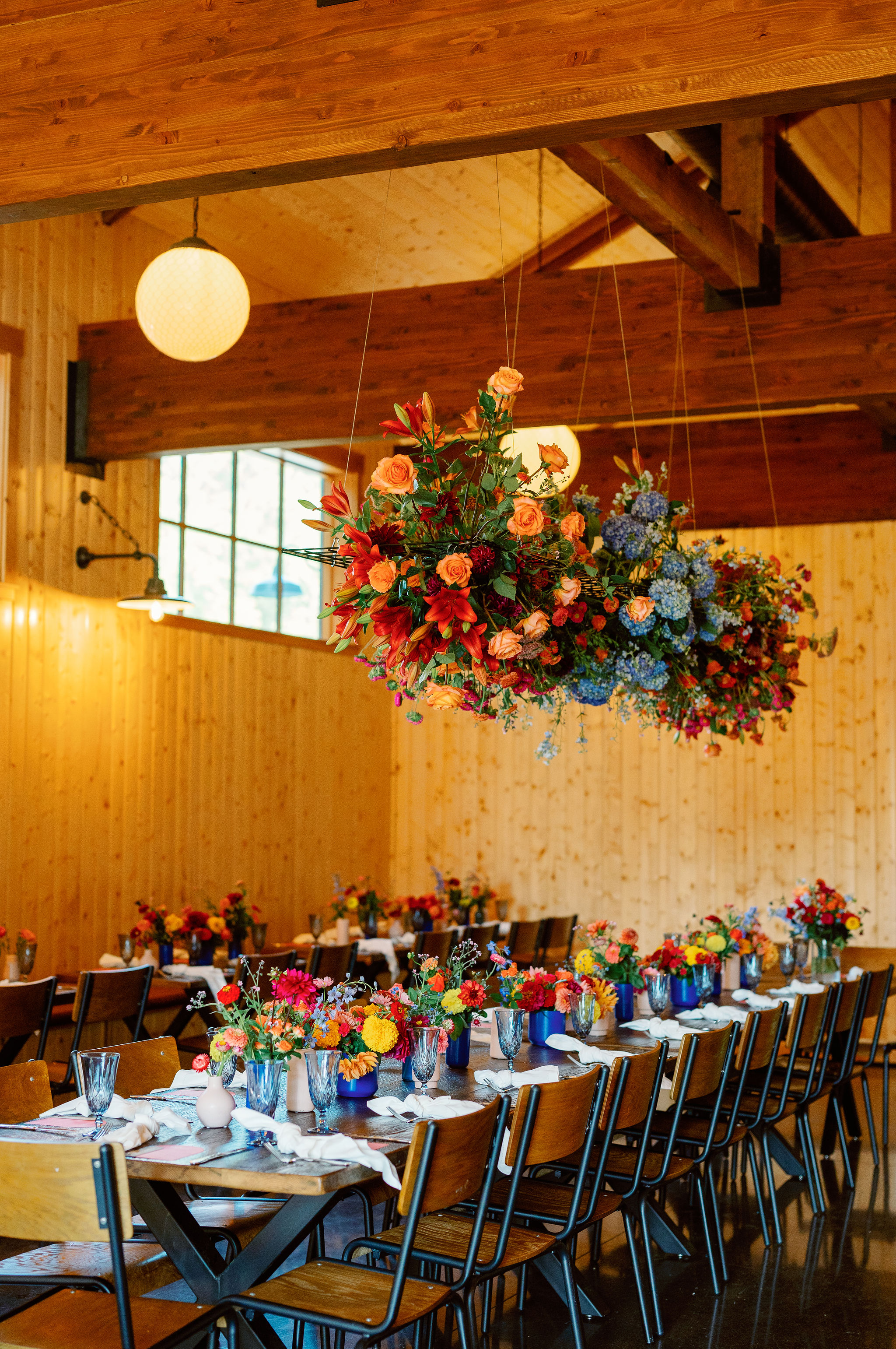 Meredith & John wanted a bold and bright garden party wedding at 19 Acres. We created voluminous, lush designs with hydrangea, roses, zinnia, lilies, and marigolds in a playful color palette.