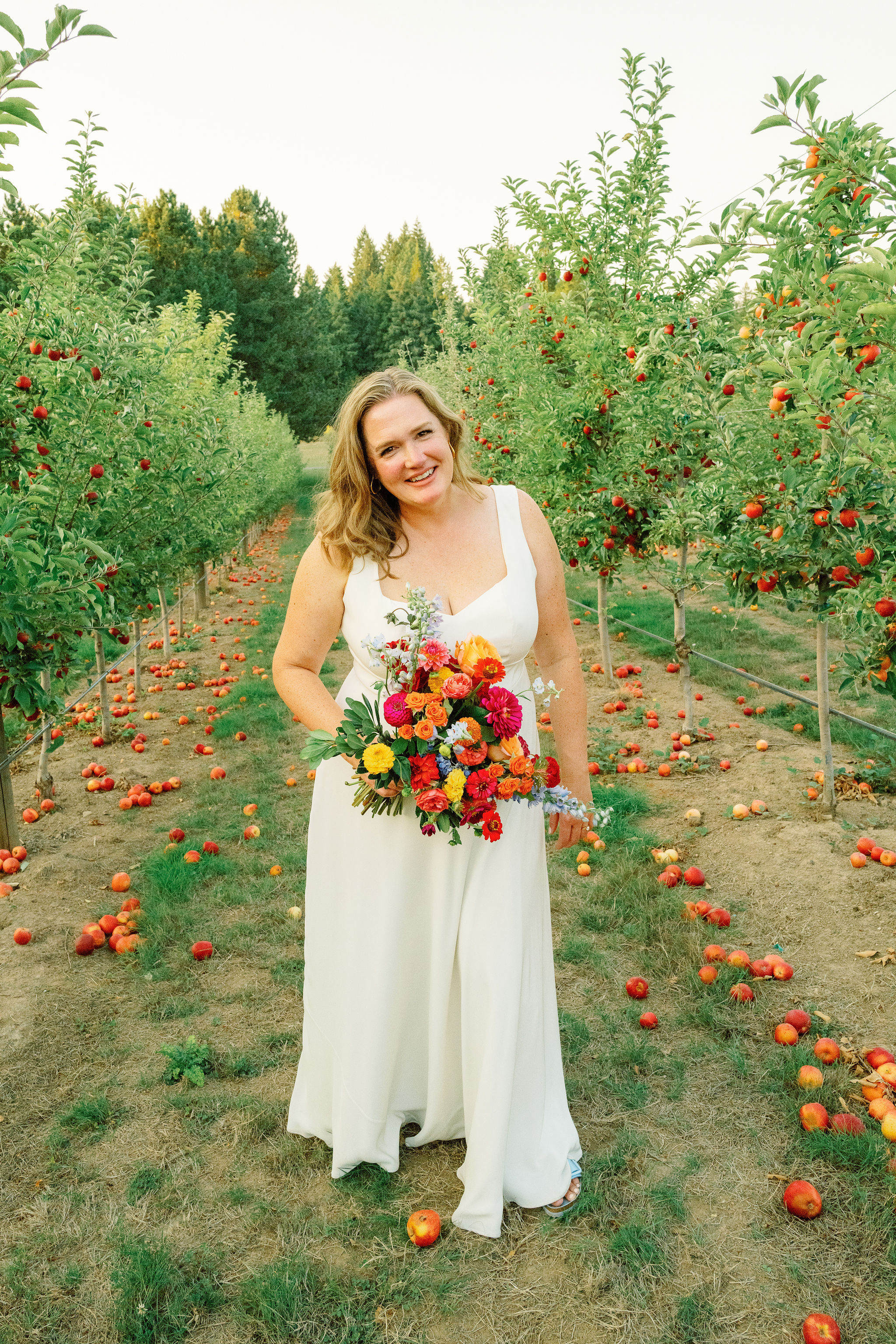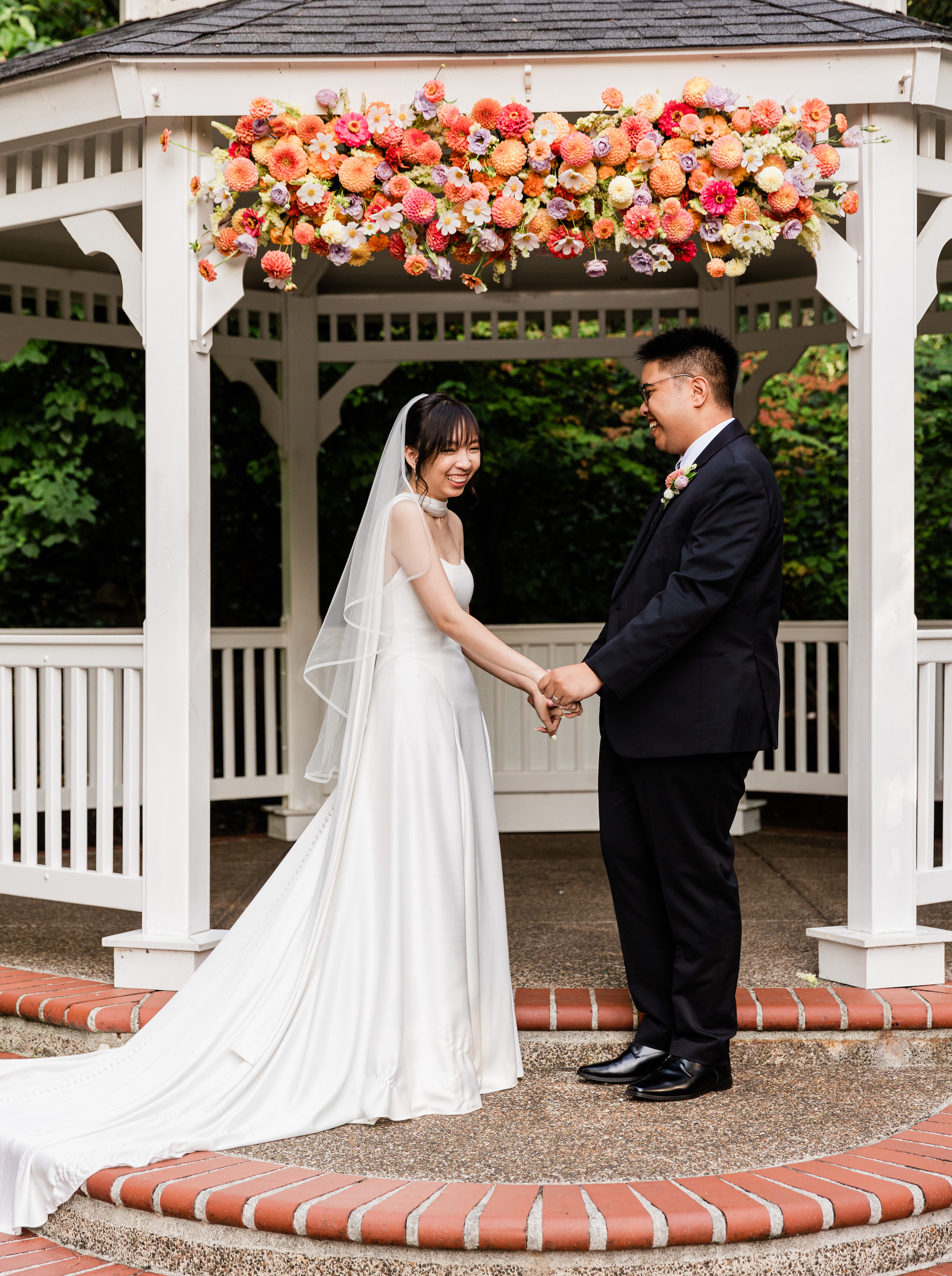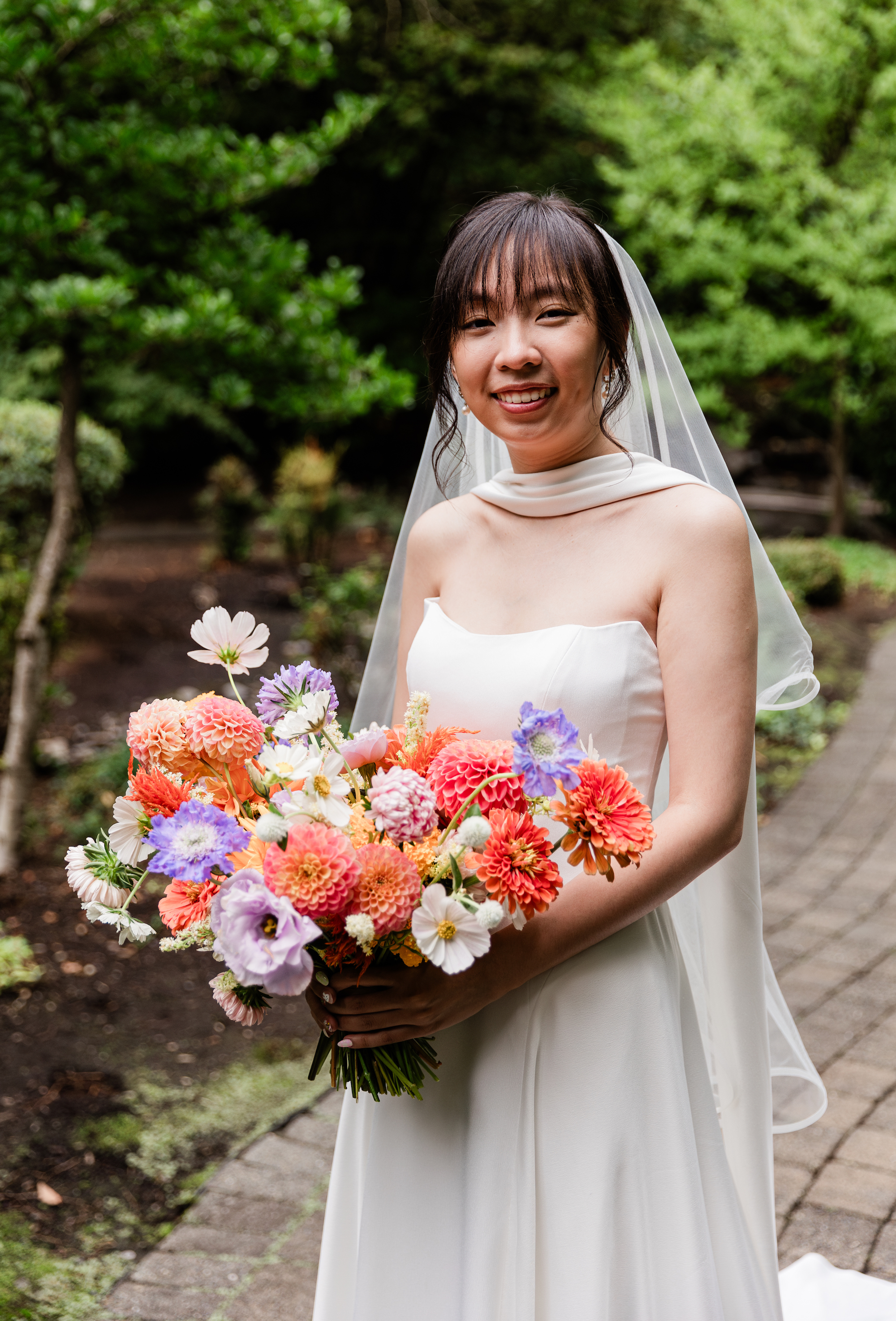 We used minimal foliage for Summer & Oscar's mid-September wedding and focused on a lush designs with big focal blooms in bright colors. Dahlias, zinnia, and chrysantheum in pinks and oranges were balanced by the purple tones of the lisianthus and scabiosa and cream cosmos.