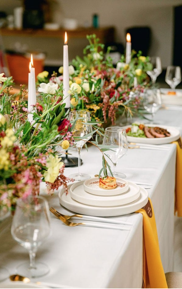 Garden party is described as fresh, textural, and lush with a balance of blooms and foliage. Arrangement shapes are typically wild and organic with airy elements. We tend to see more color in garden party styling - it works well with many different color palettes making it a very versatile theme.