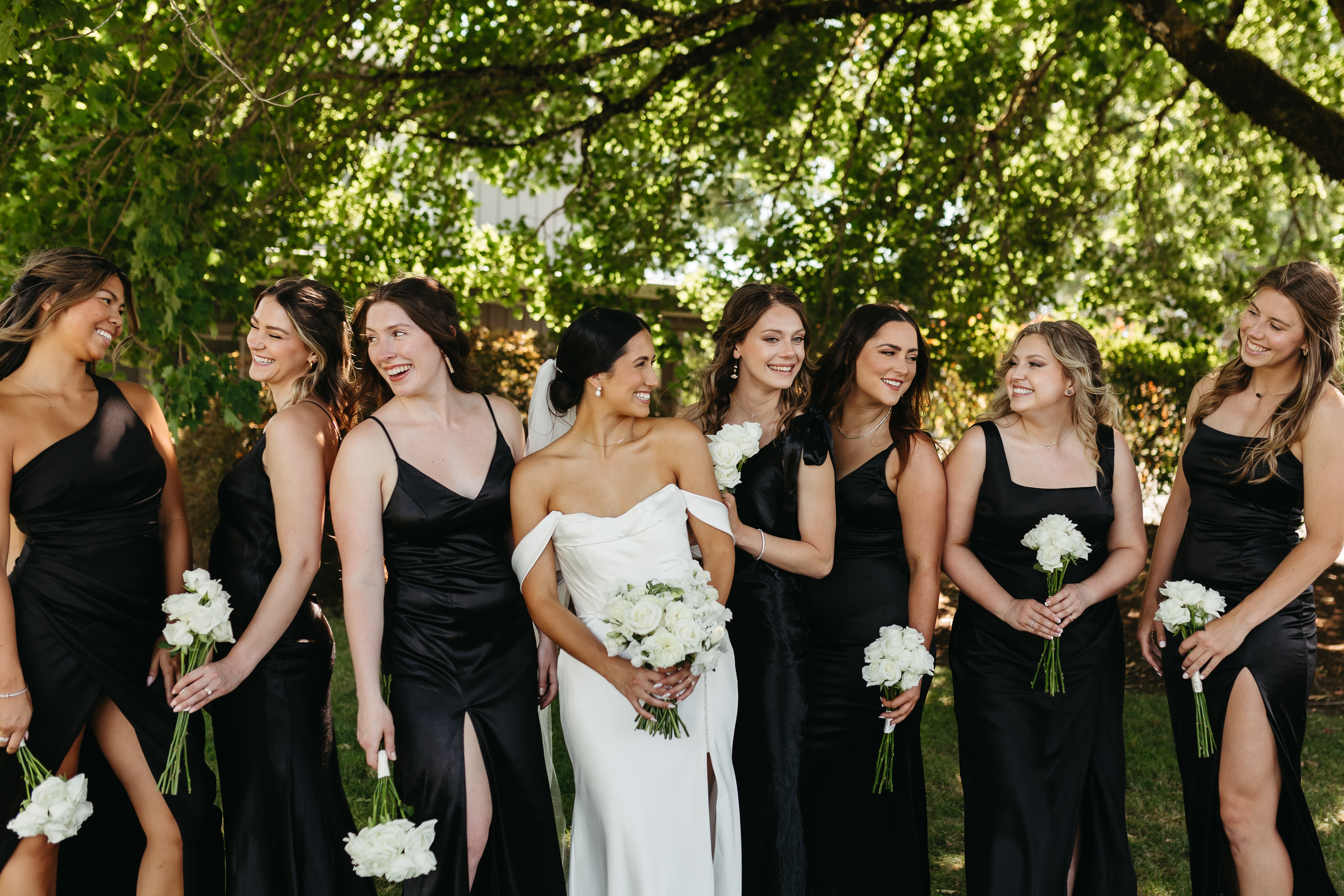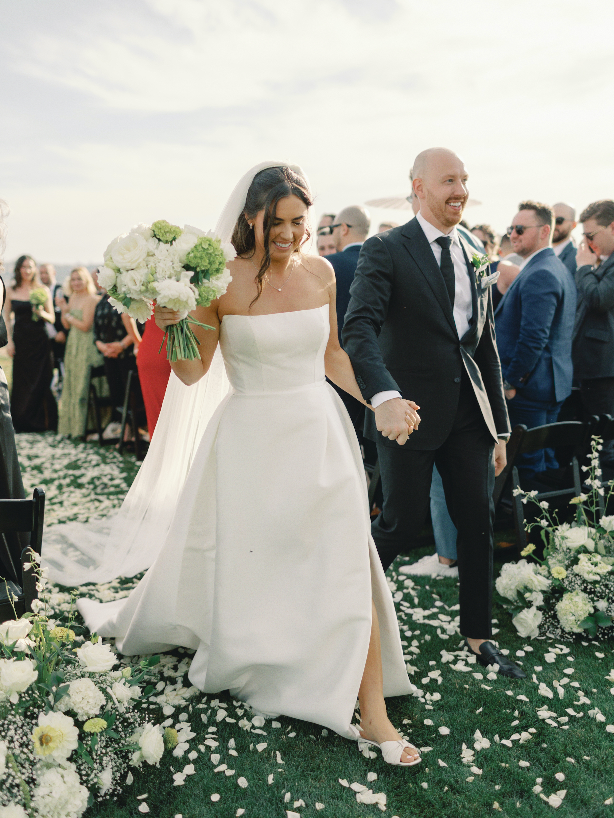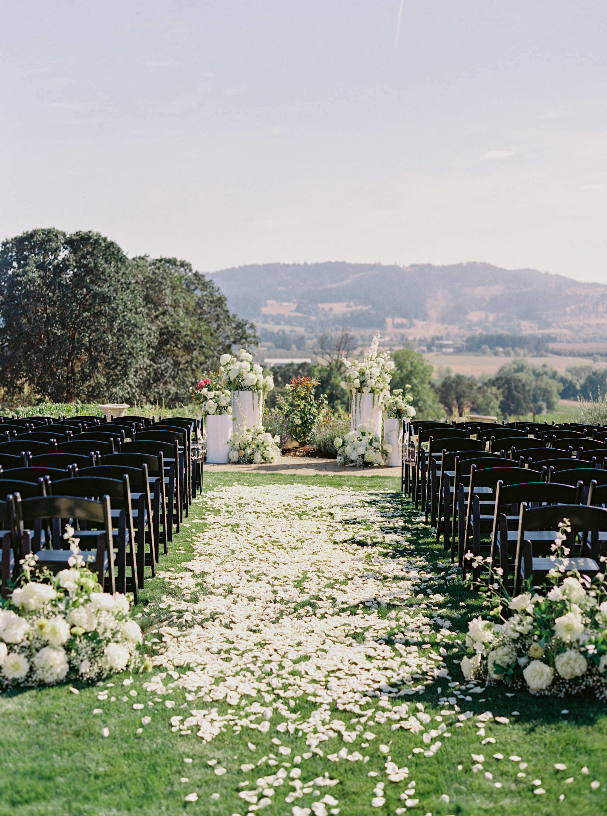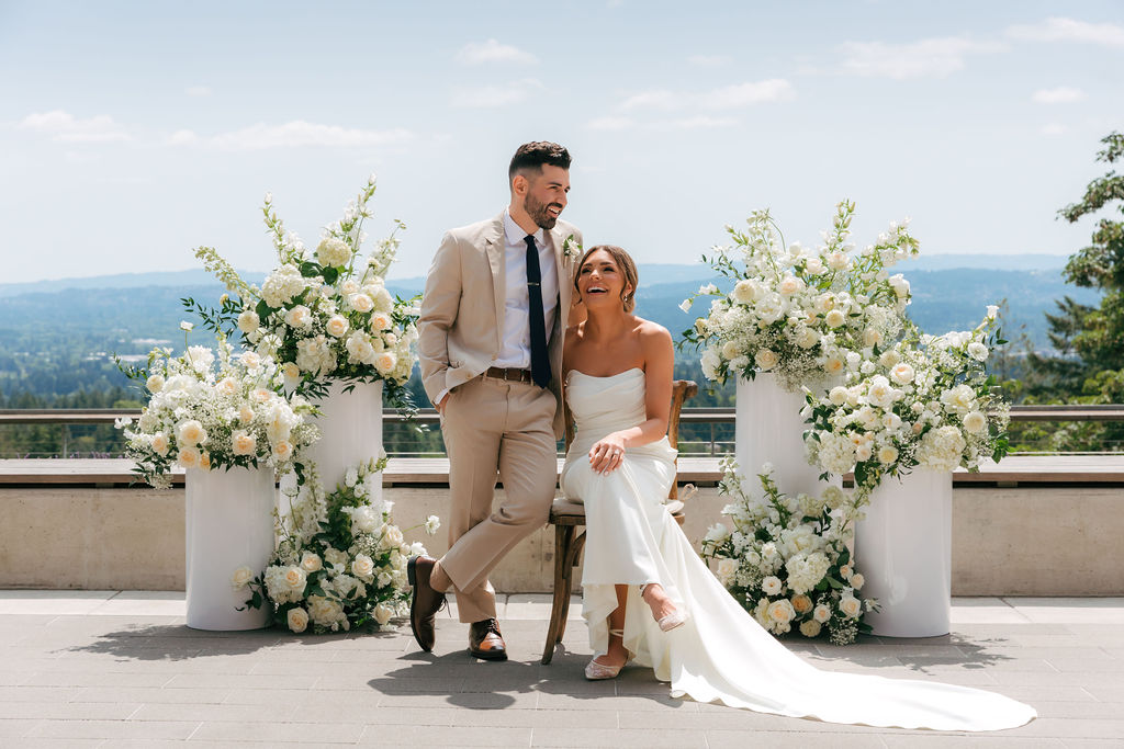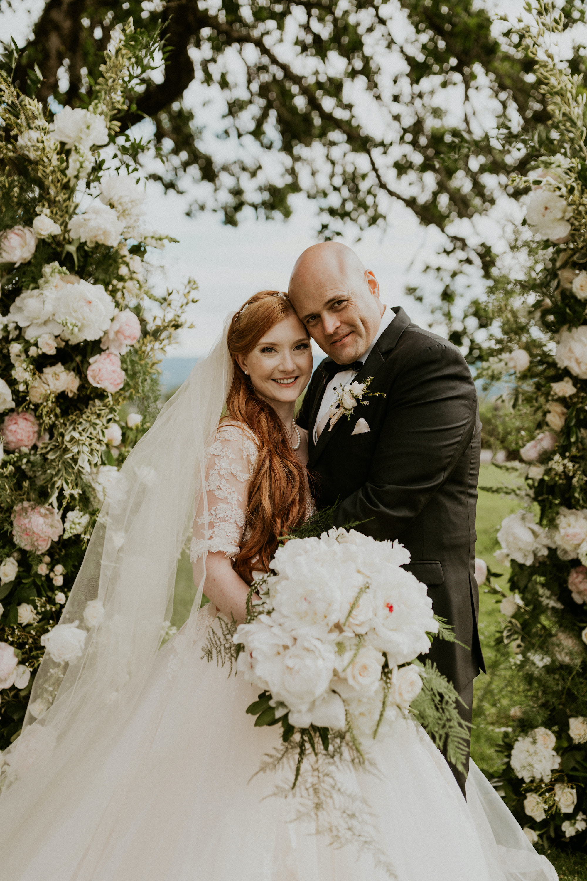 Big, romantic white blooms took center stage for Phoebe & Paul's wedding at Amaterra. We framed the couple in florals by building large arrangements of roses, hydrangea, baby's breath, campanula, and scabiosa atop white pillars.