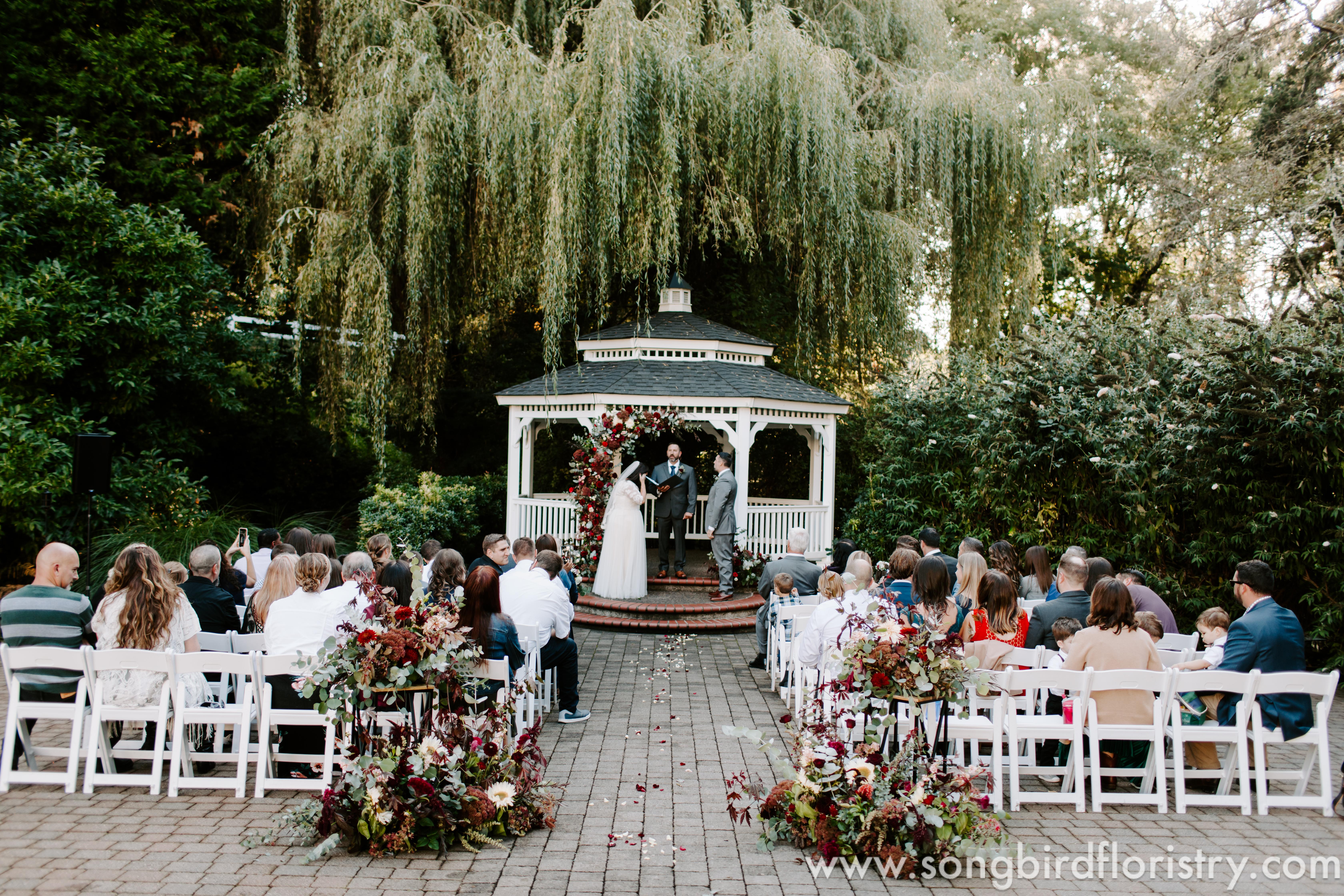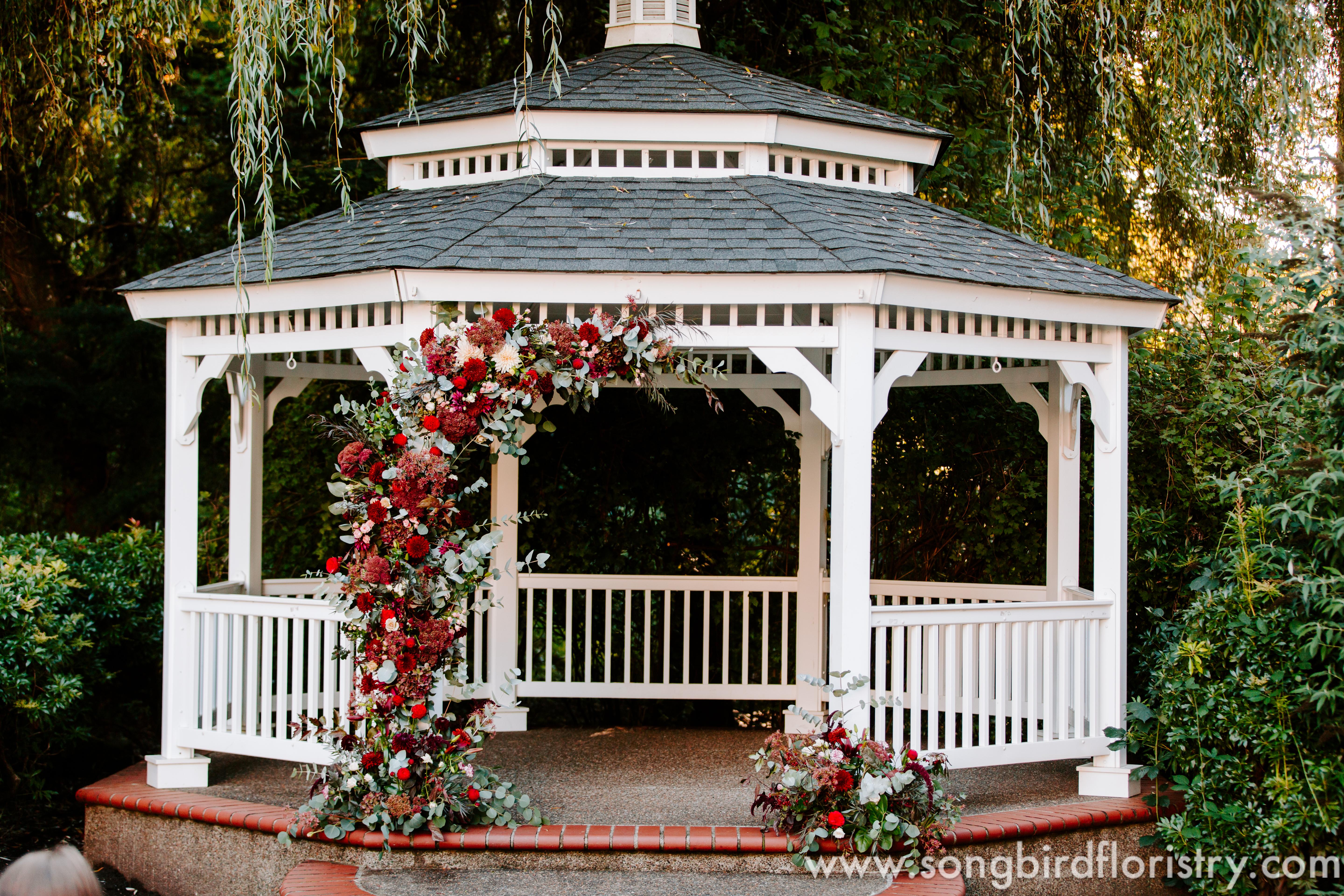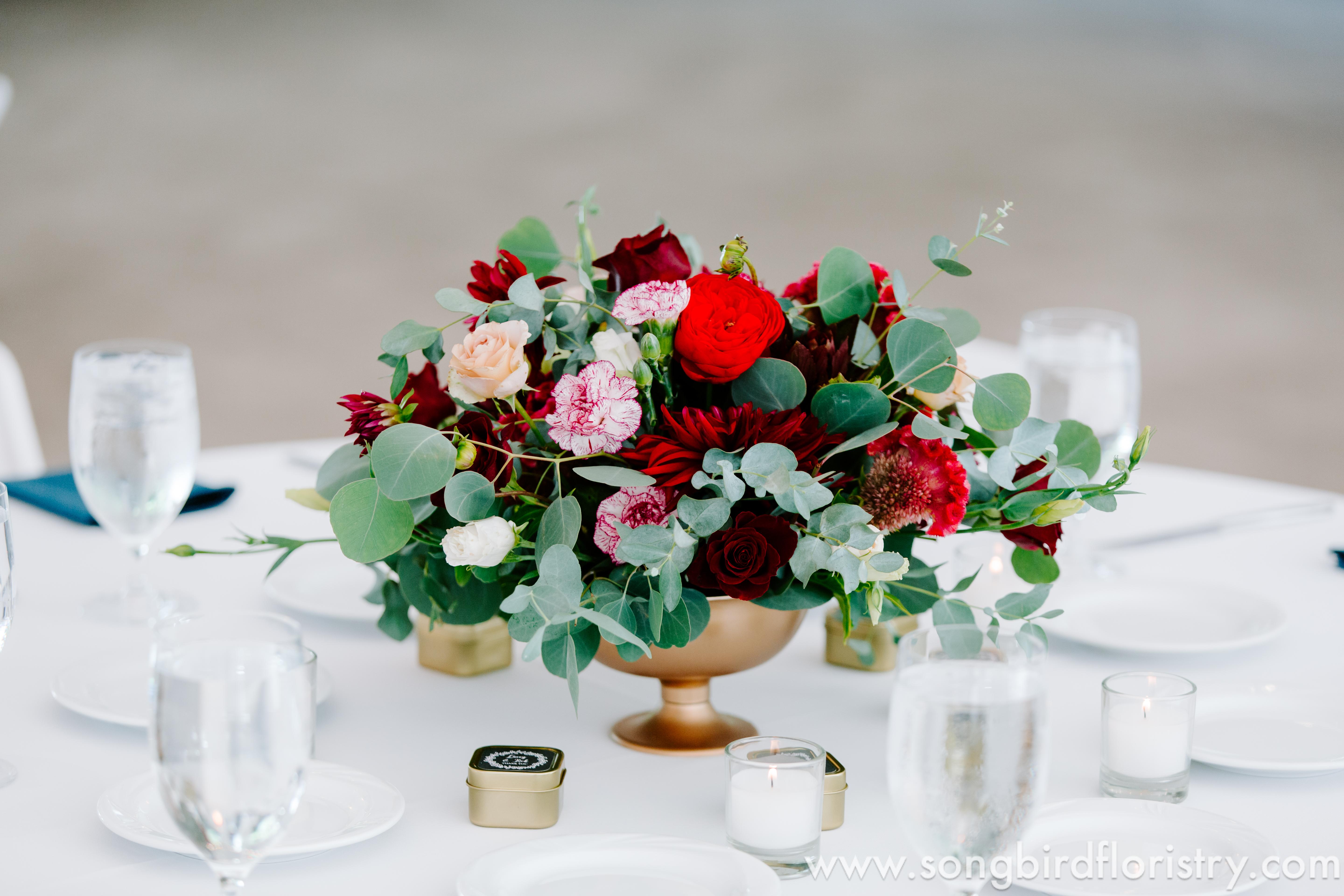 We used big blooms in burgundy, red, and blush to create a romantic garden party theme at Rob & Lacey's wedding. The arrangements were more garden party in shape and texture while the color palette and footed compotes added a romantic element.