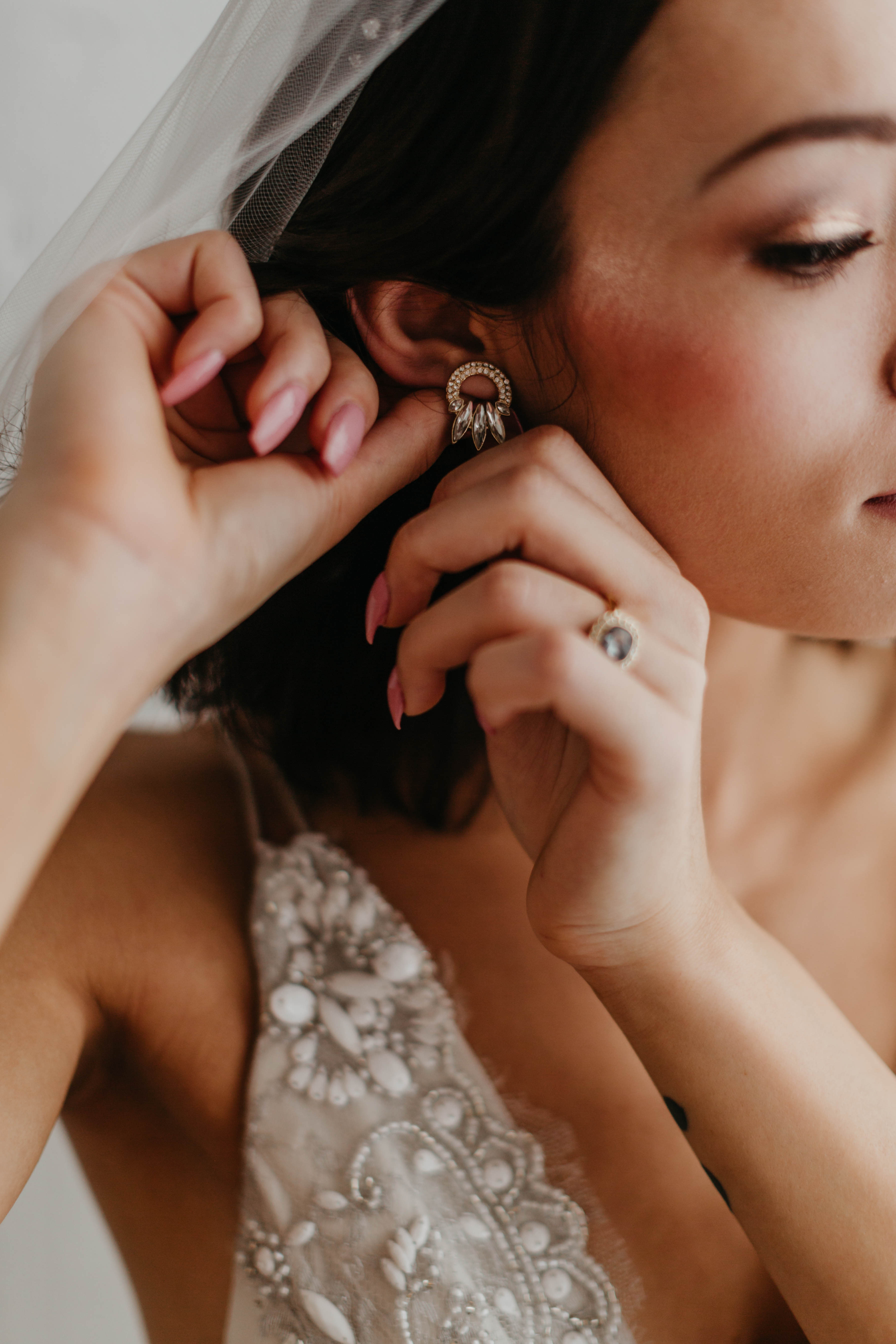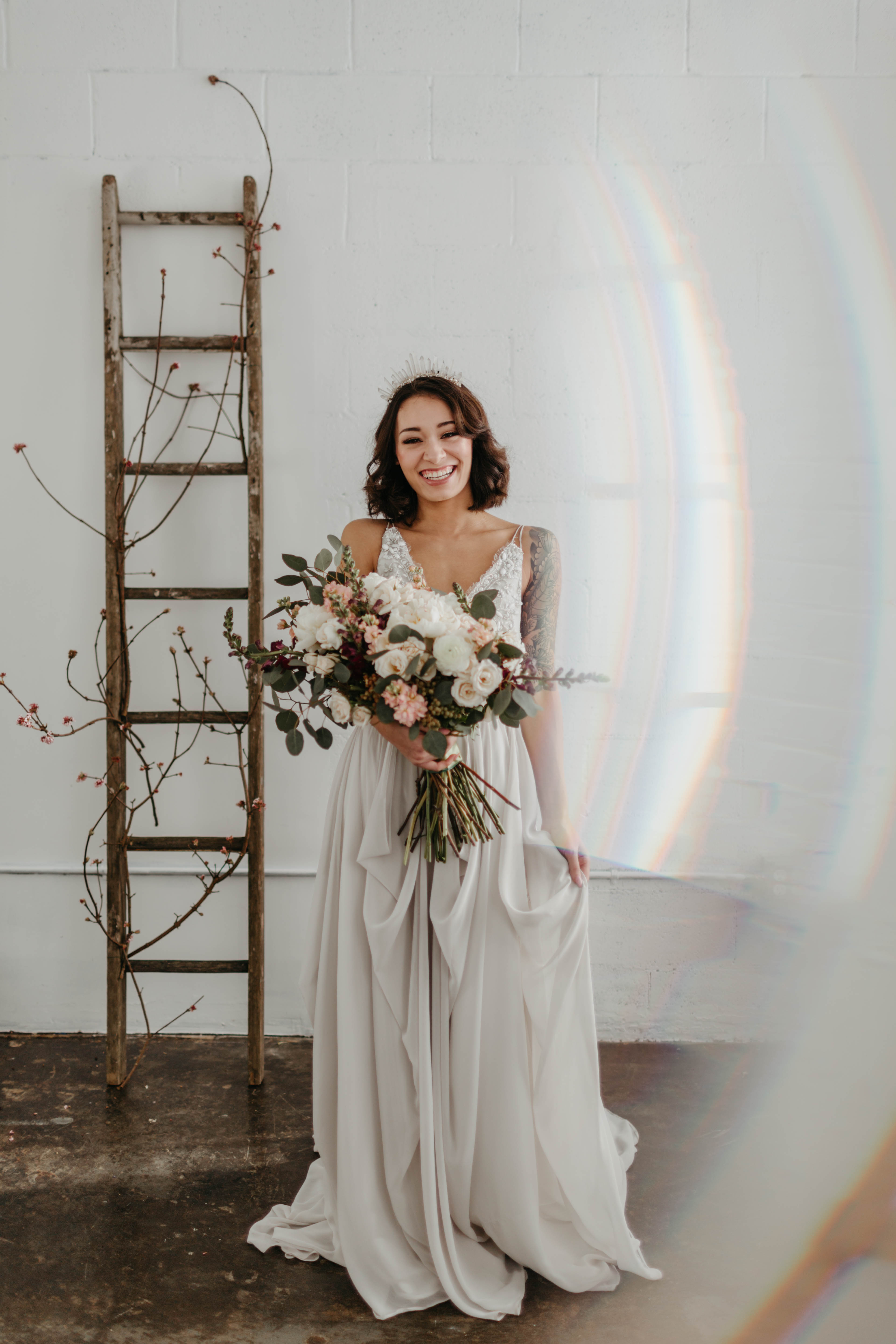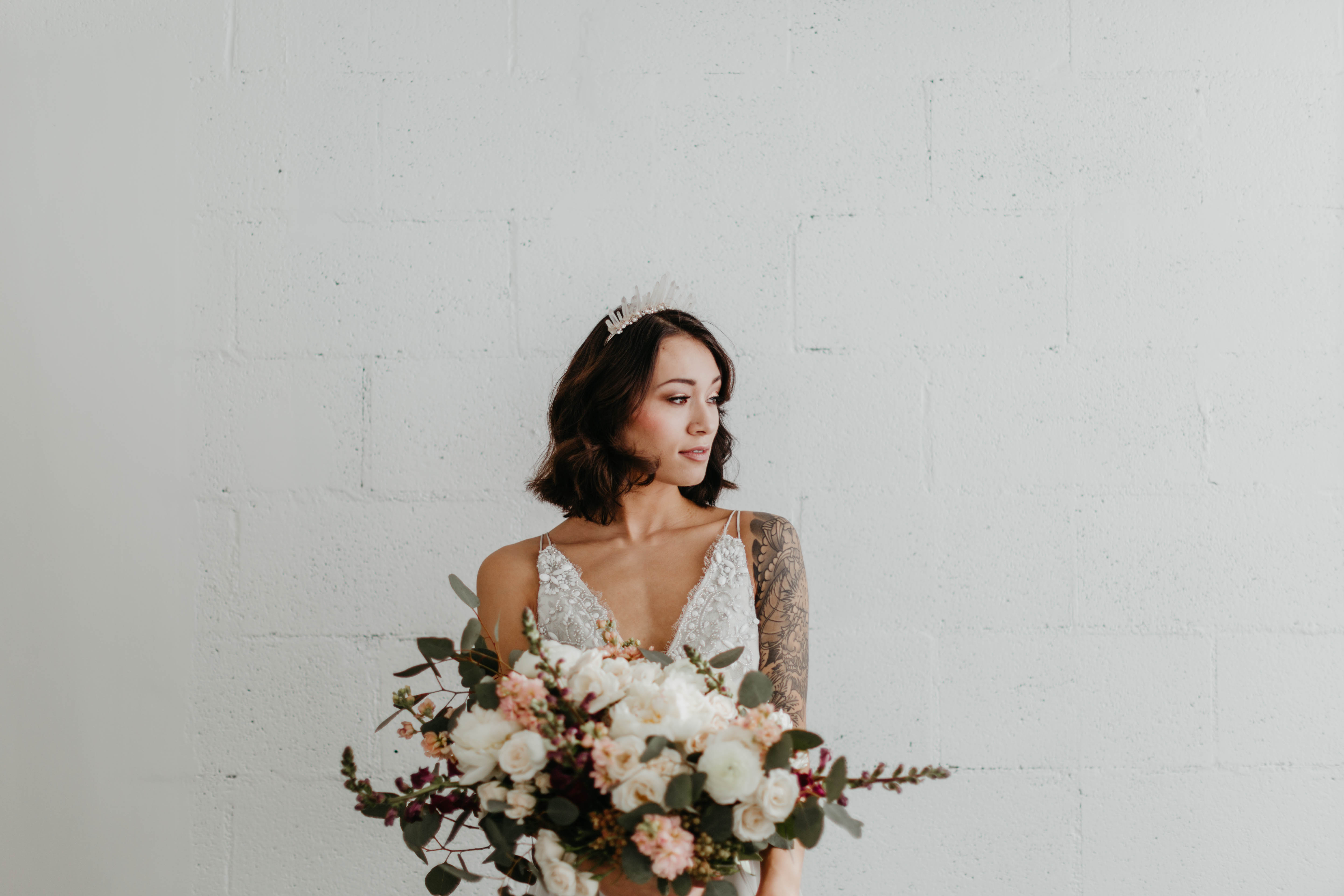 Add metallic or crystal elements to your styling to create a more glam look. We used burgundy, cream, and blush flowers at this styled shoot to add softness and to complement the model's dress and crown.