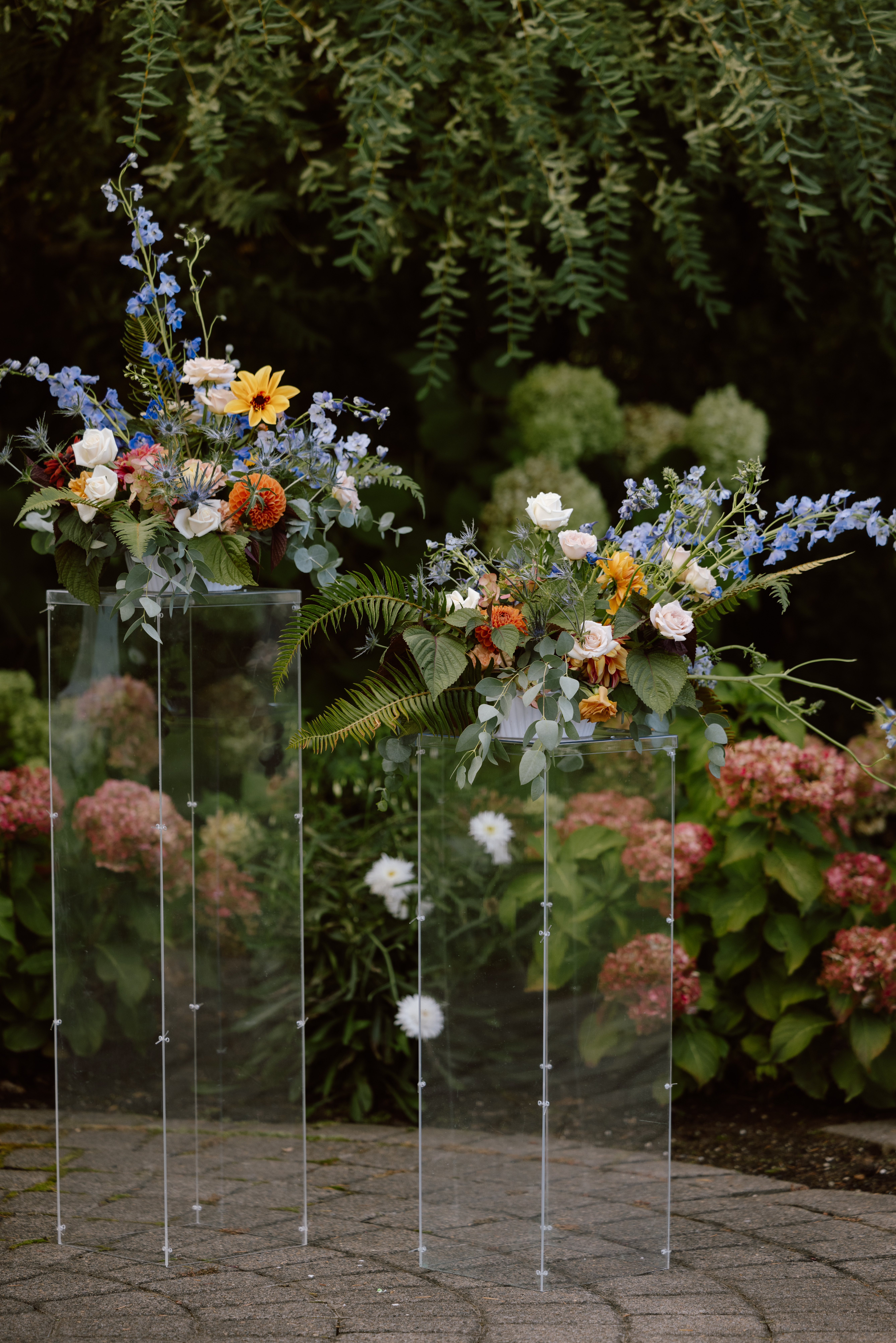 We mixed Woodland and Garden Party styling for Anna & Wade's nuptials at The Aerie. The arrangements were floral forward - featuring the best of Oregon's late summer blooms like dahlias, cosmos, amaranth, and delphinium. Fern was added in to pull in the couple's love of exploring & hiking in the PNW.