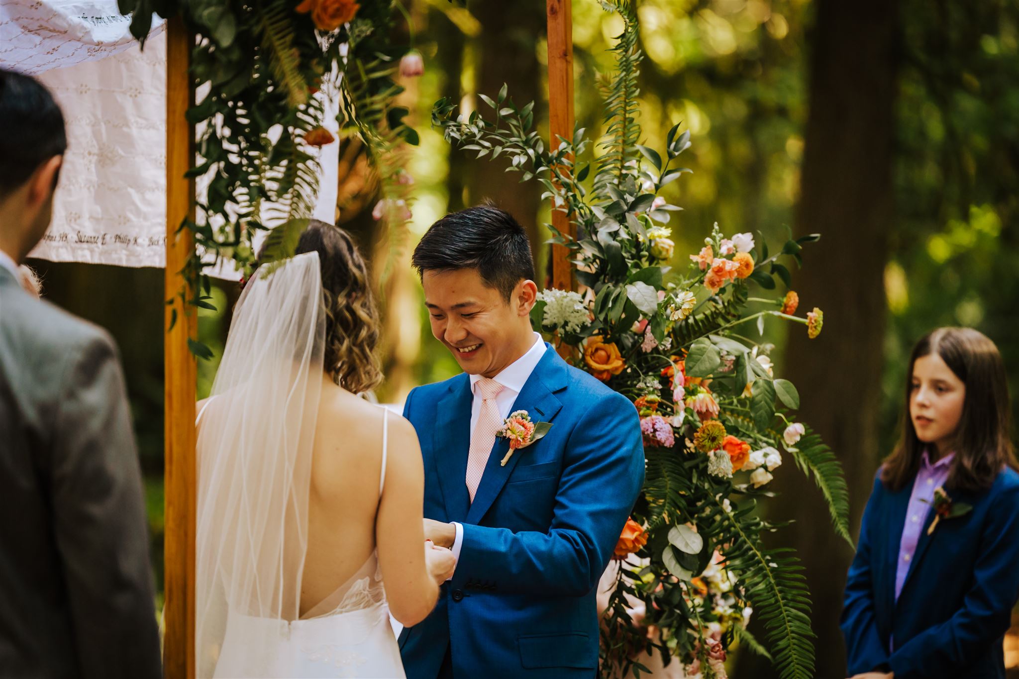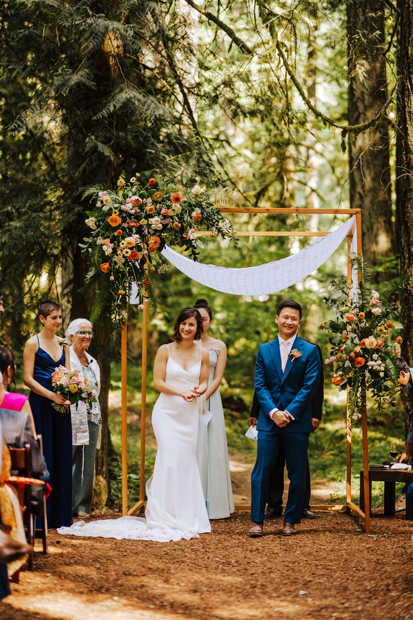 We combined PNW/Woodland and Wildflower styling to create foliage forward designs with pops of color for Scott & Shira's July wedding. We used greenery such as fern, ruscus, and salal alongside colorful blooms like snapdragon, dahlias, cosmos, zinnias, and calendula. The arrangements fit nicely among the canopy of trees and inside the log cabin reception area.