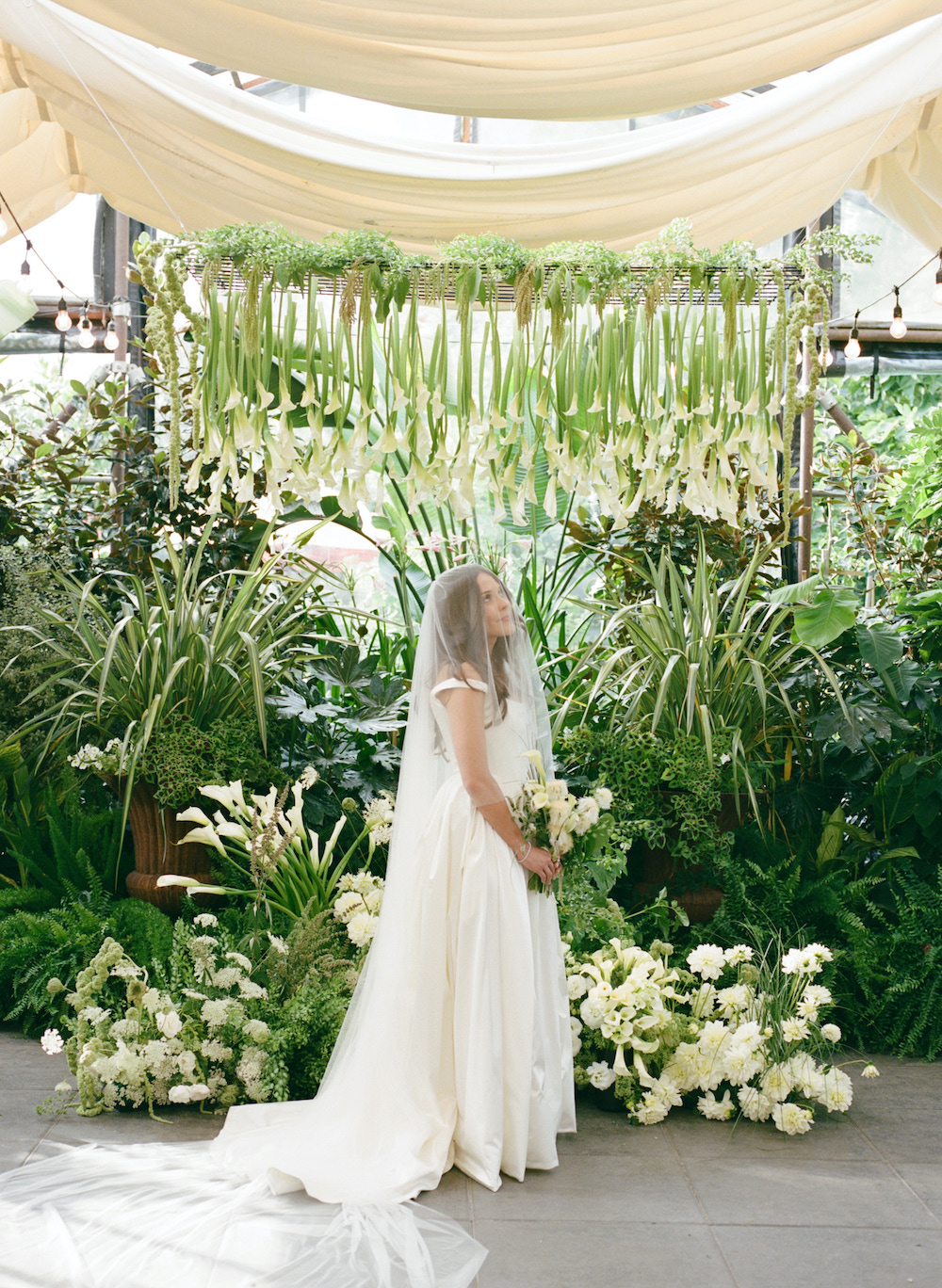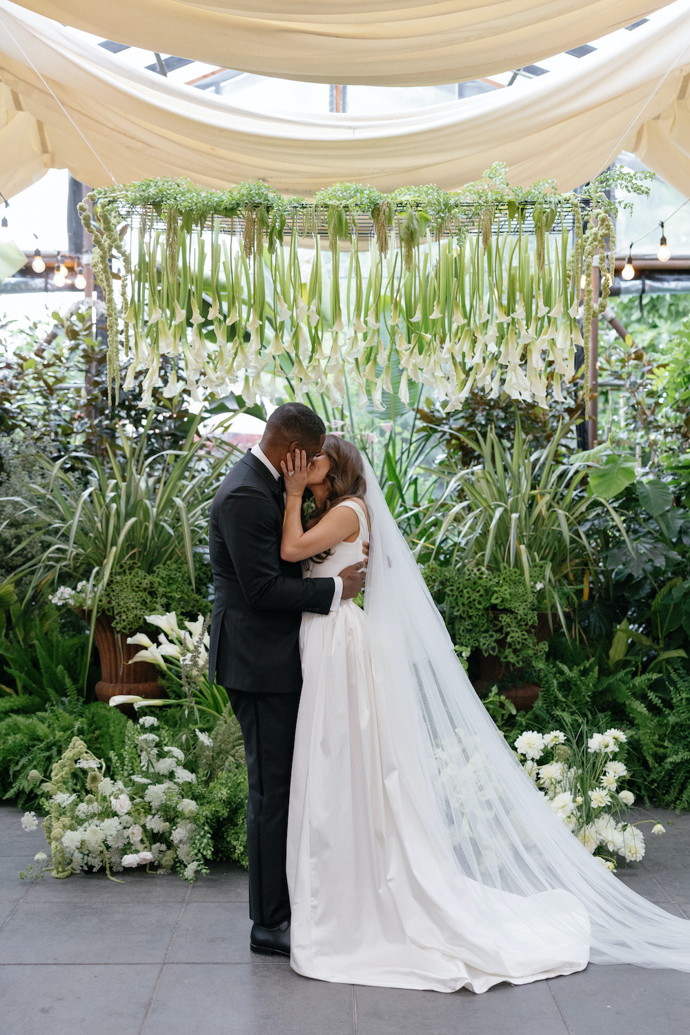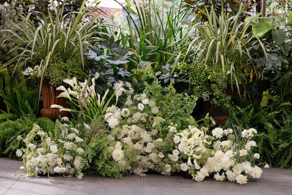 Over 100 calla lilies were suspended above the couple with lush, multidimensional ground pieces creating a backdrop that fit seamlessly among the greenhouse plants. The final result was organic, botanical, and full of movement.