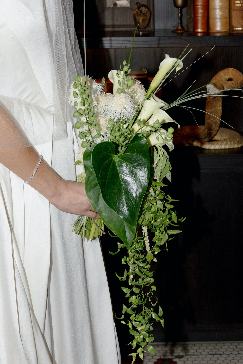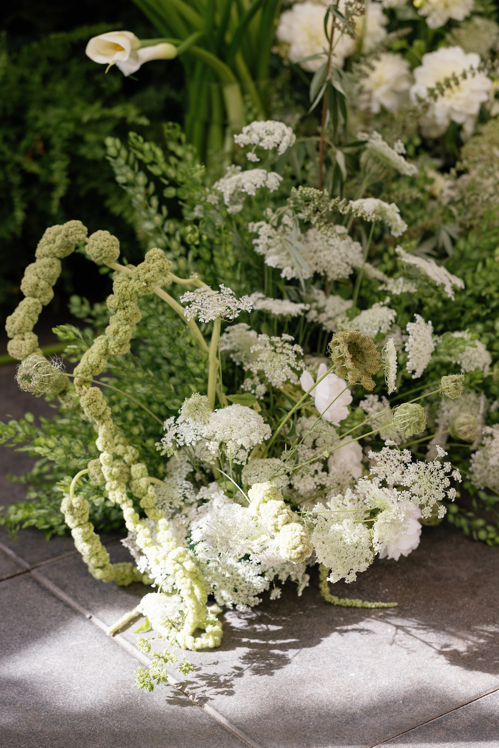 For the personal flowers, Victoria carried an architectural, restrained bouquet featuring calla lilies, grasses, and basket flower for texture & shape. We balanced the silhouette with a few drippy elements such as amaranth and vining foliage.