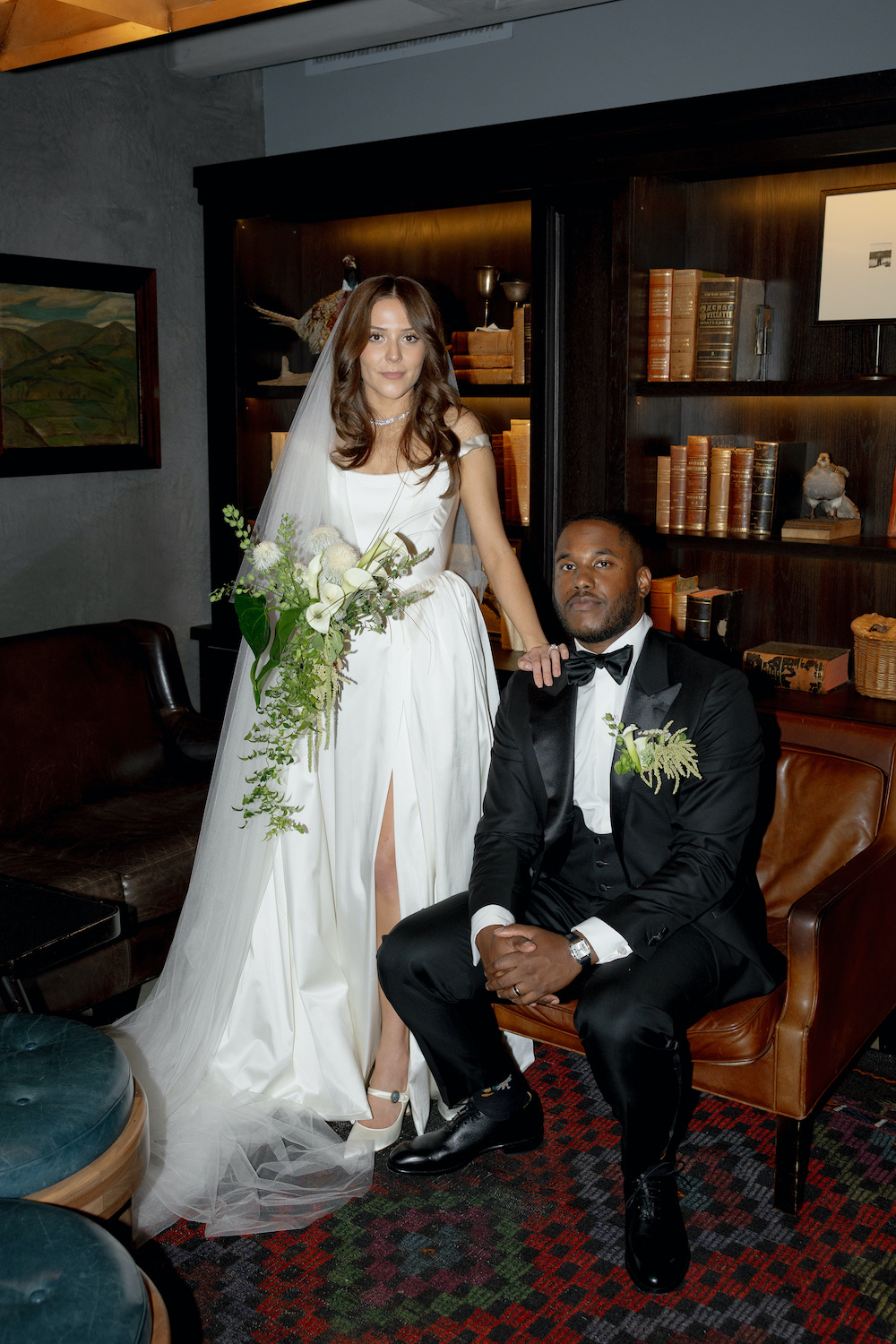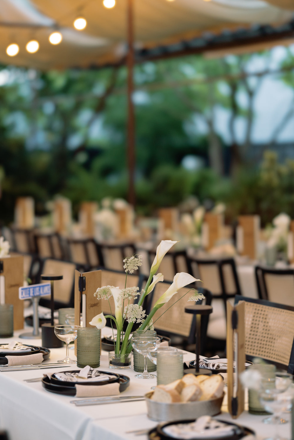 Victoria and Jon wanted bespoke, modern, unexpected florals that still felt timeless. Nothing trendy just for trend’s sake. Their vision included texture, modern elements, and design-forward moments that were architectural, airy, and minimalist. A green & white color palette, accented with black decor, helped create a timeless vibe while still allowing space for uniqueness.