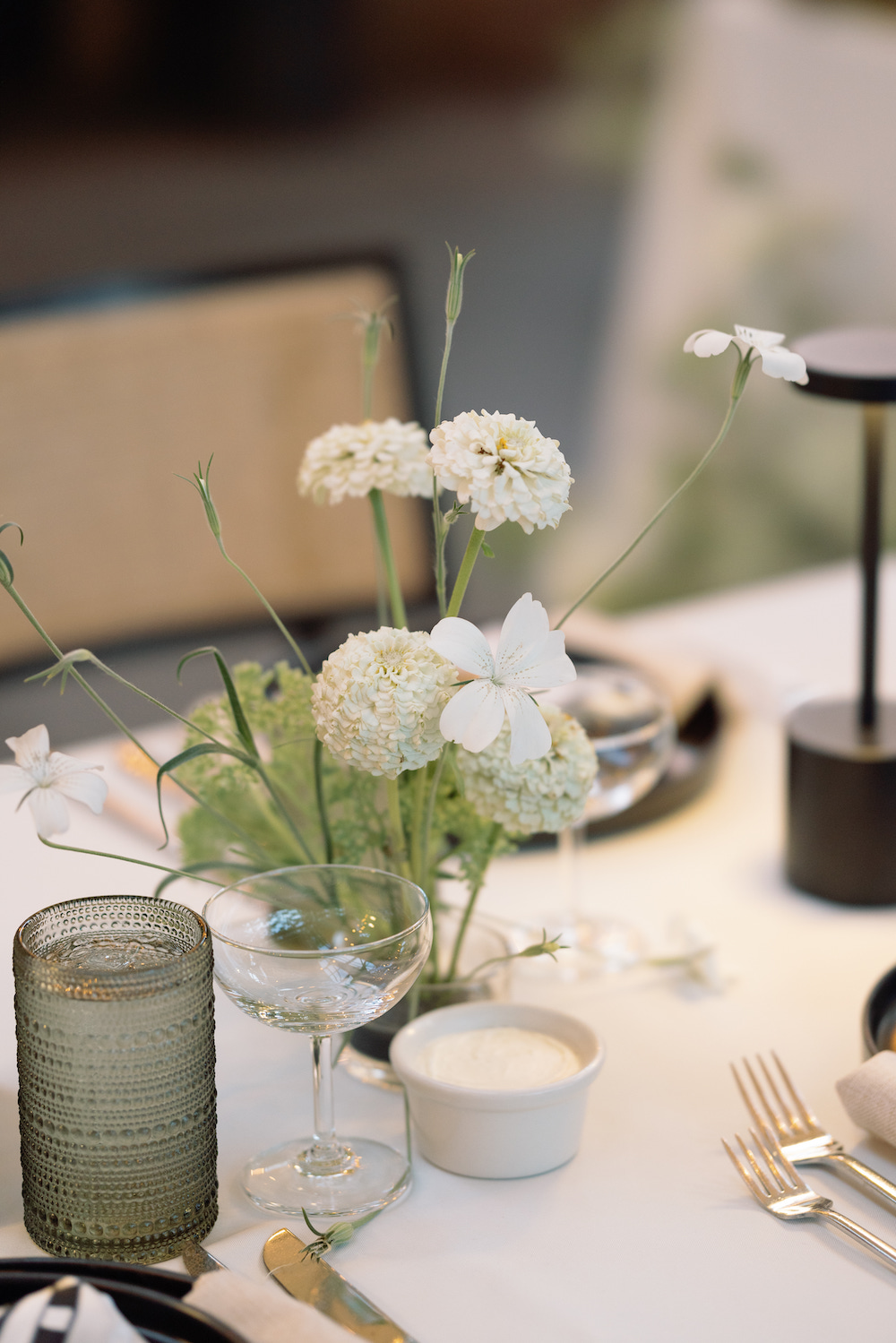 Long dining tables and a family-style catering service called for depth without crowding, so we used pin cups to build pockets of florals that felt light, sculptural, and linear.