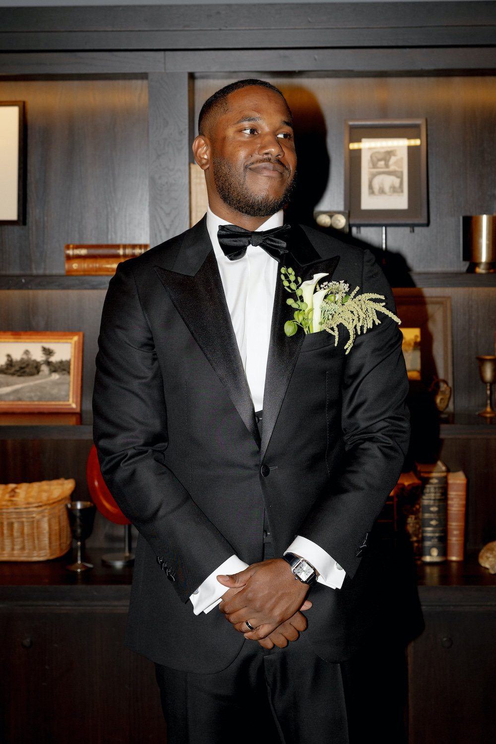 Jon wore a complementary floral pocket square that balanced form and movement with calla lilies, amaranth, and seed pods— sleek, modern, and just a little rebellious.