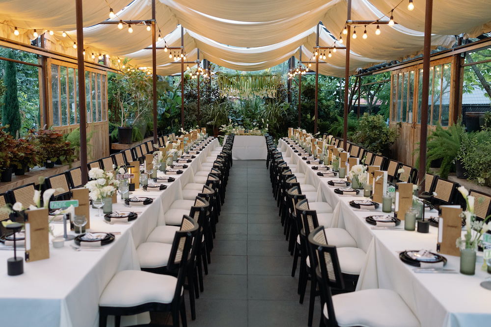 That vision found its home at Blockhouse & Pomarius Nursery in Northwest Portland. The ceremony was staged right inside the Pomarius greenhouse and later transitioned to create a cozy dining area for an intimate guest list. It’s a venue that feels both urban and lush, a little secret-garden meets city modernism, and we leaned hard into that contrast.
