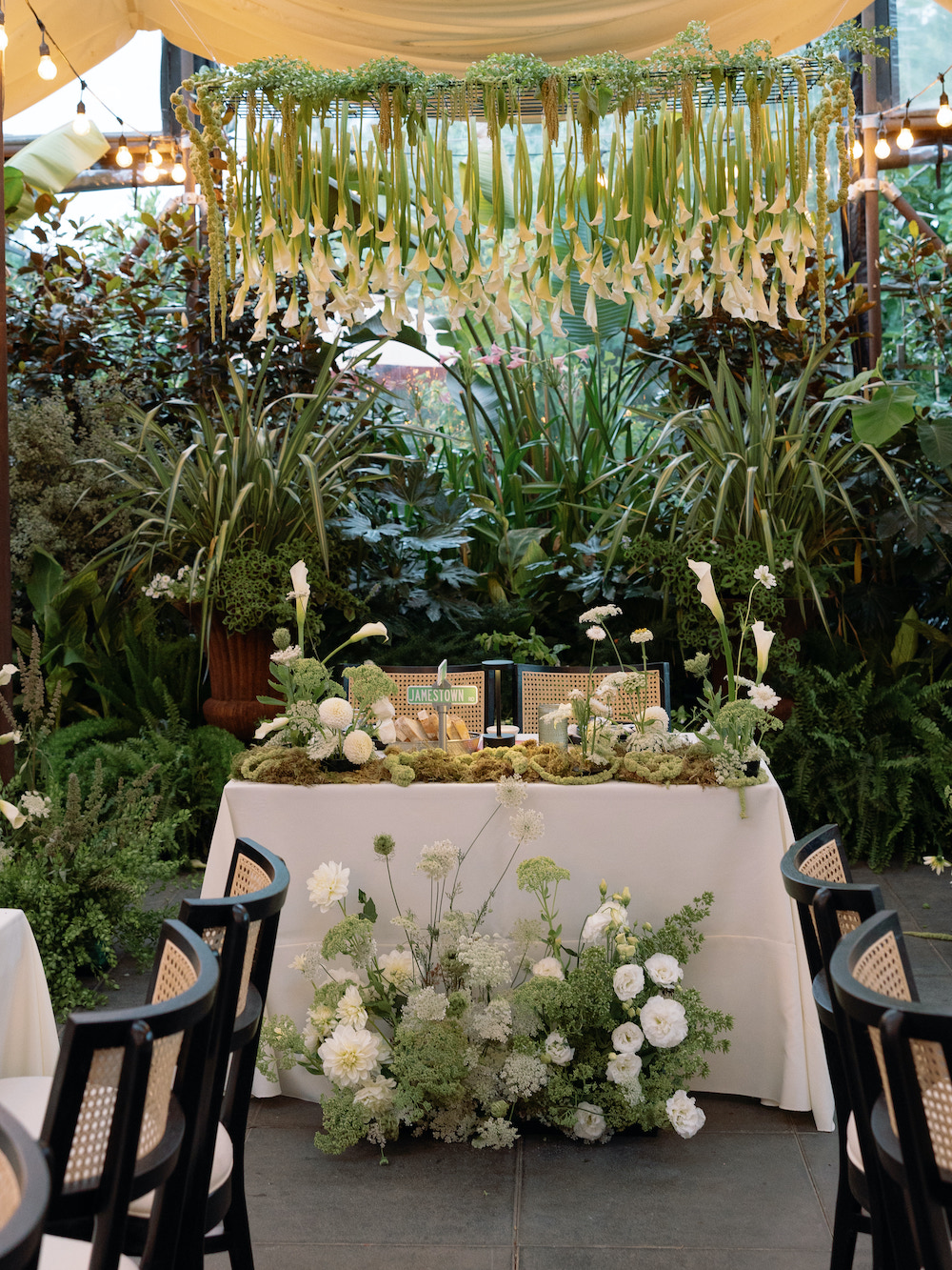 Their sweetheart table was positioned under the suspended calla lilies and we added moss & pin cups on the table for an overgrown vibe. One of the ground pieces sat in front to tie it all together.