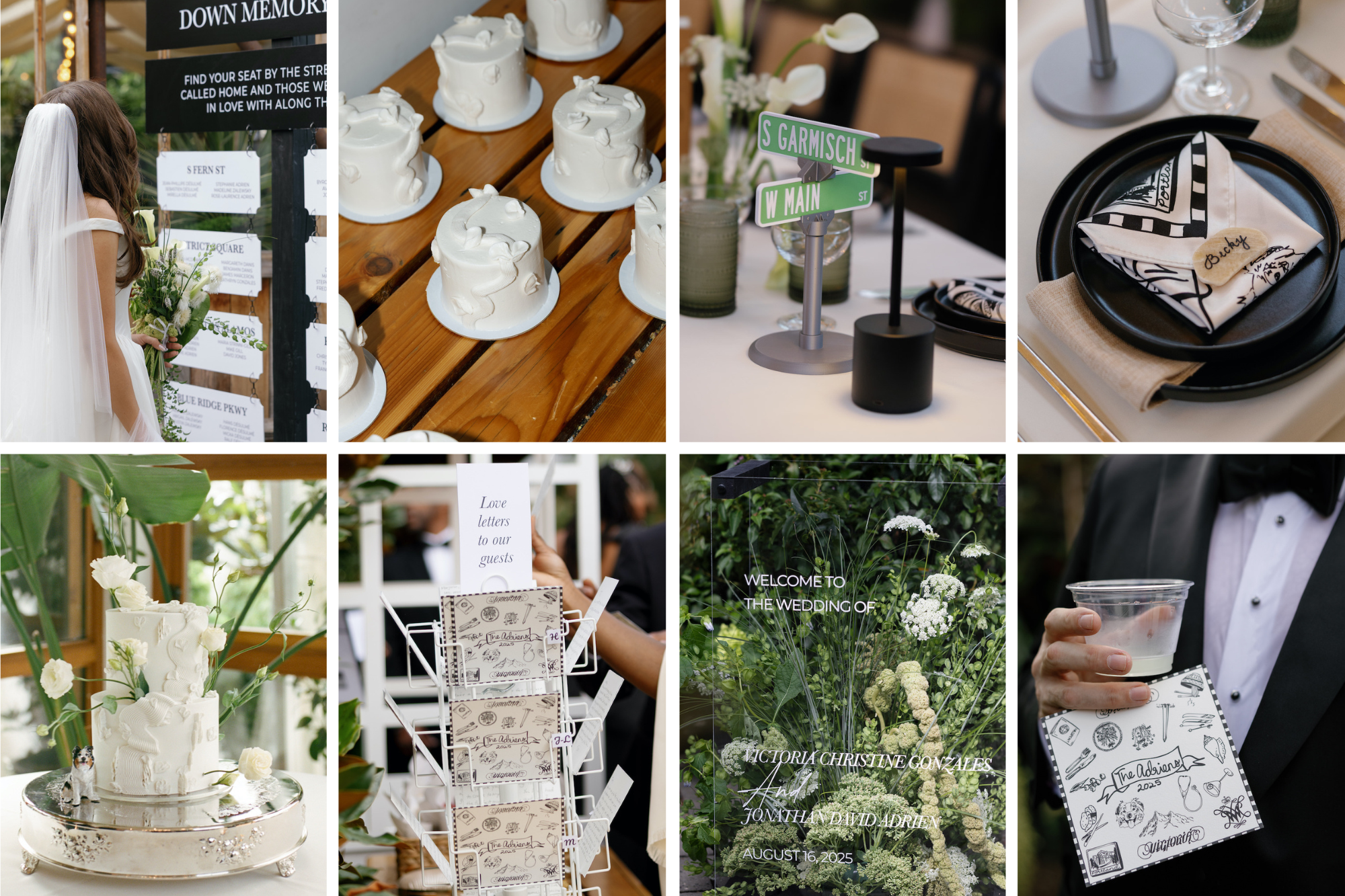 Victoria & Jon hired Megan, owner of Script on This, to create so many fun, custom details throughout their reception. Megan has such a creative eye and talent for building unique installations & signage. From a phone booth for guests to leave messages in to custom bandanas as party favors and mini street signs in lieu of table numbers - every detail was considered & tied into the couple's story.