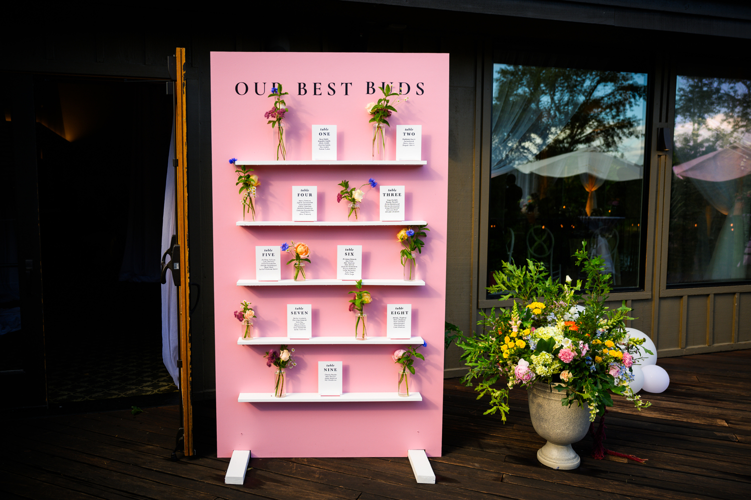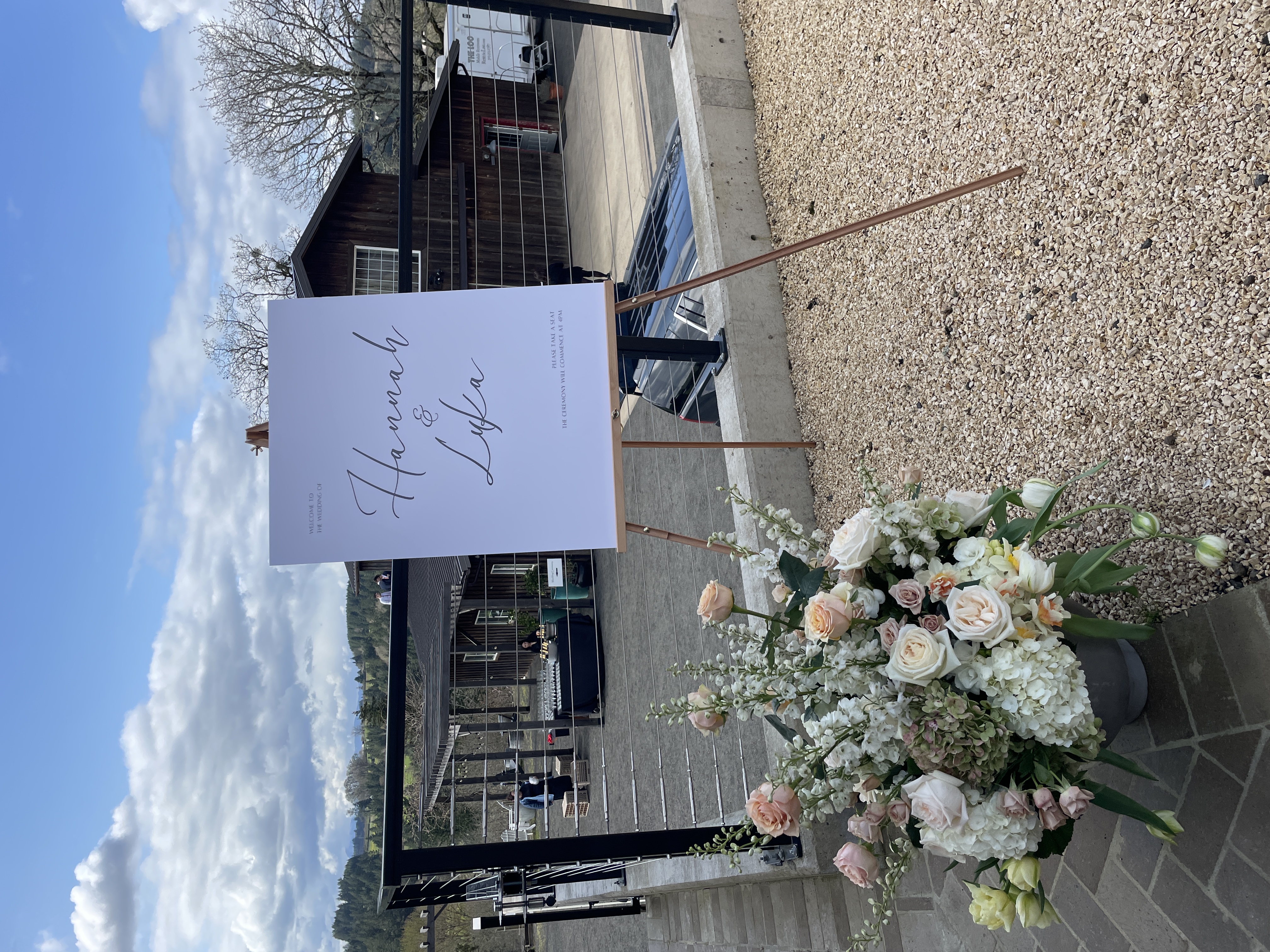 Add some fresh flowers to your seating chart or welcome sign. Opt for a small cluster or vining greenery that attaches to your signage. Repurpose ceremony or aisle ground pieces to sit in front of a large sign. Or we can discuss custom sign options like larger clusters, baskets, or planter boxes.