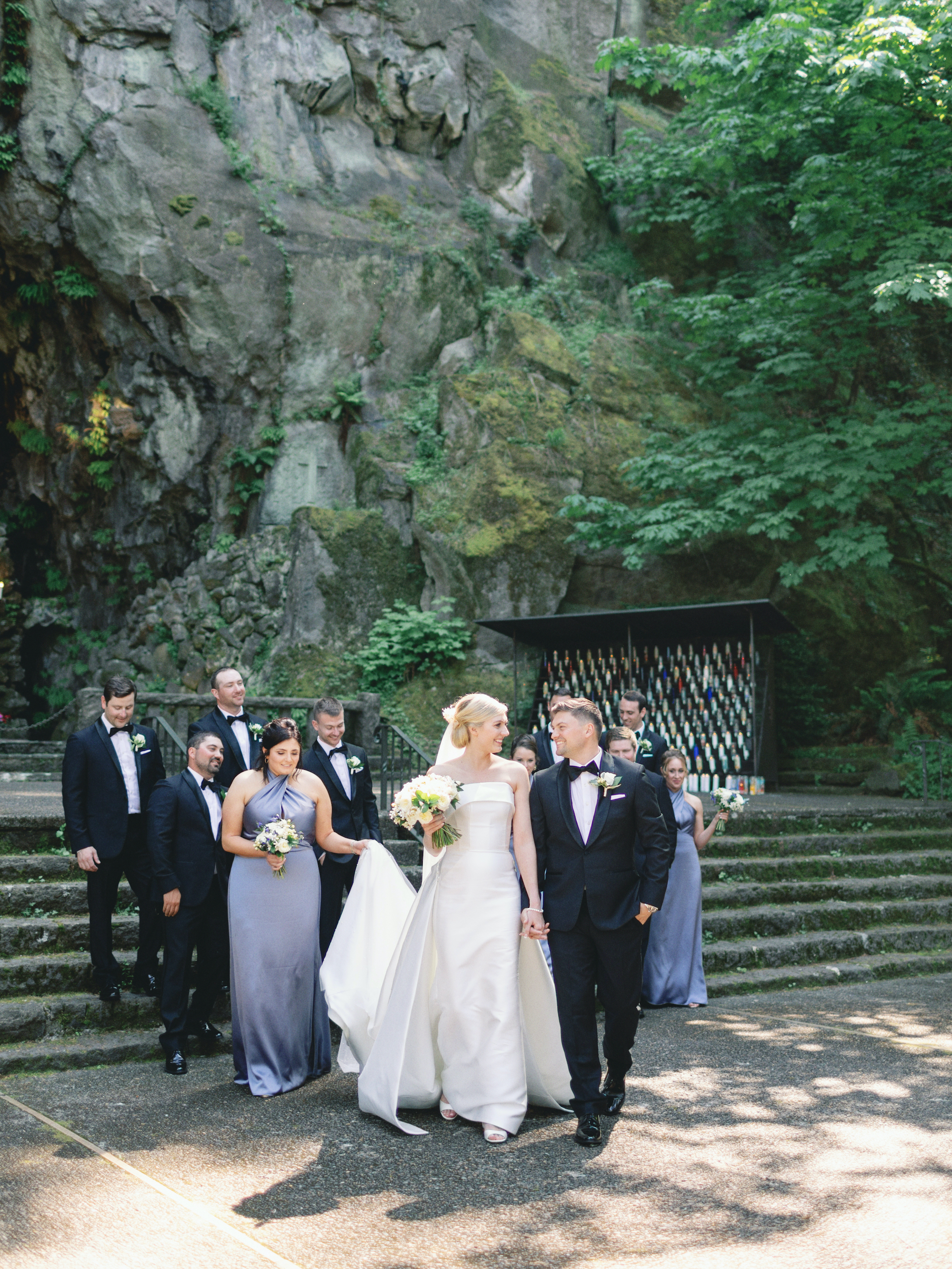 Katharine and Brandon said I Do at The Grotto in NE Portland before moving to their reception at the Portland Golf Club. We displayed large vase arrangements on the rear altar inside the church which were easily moved to the reception space later on.