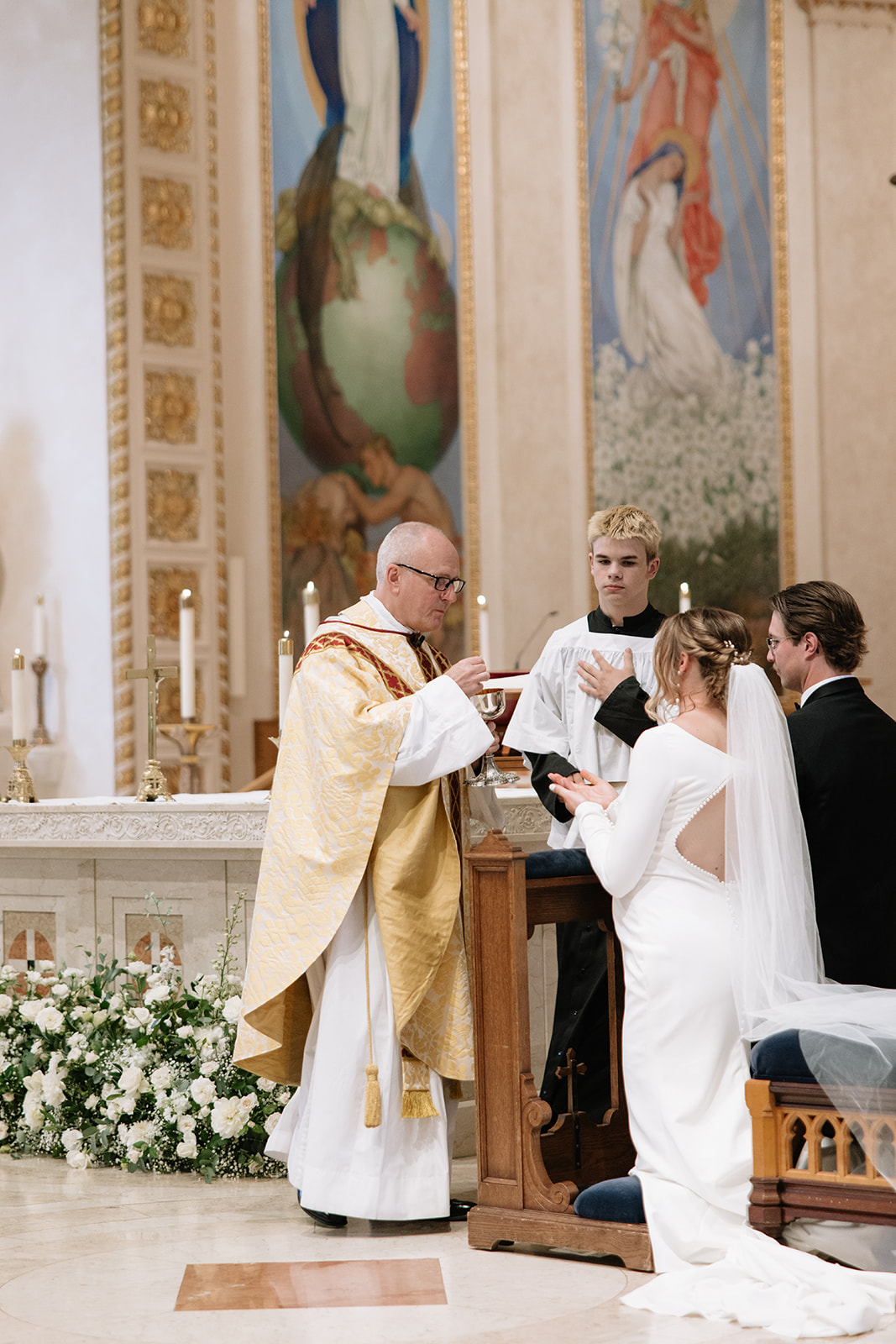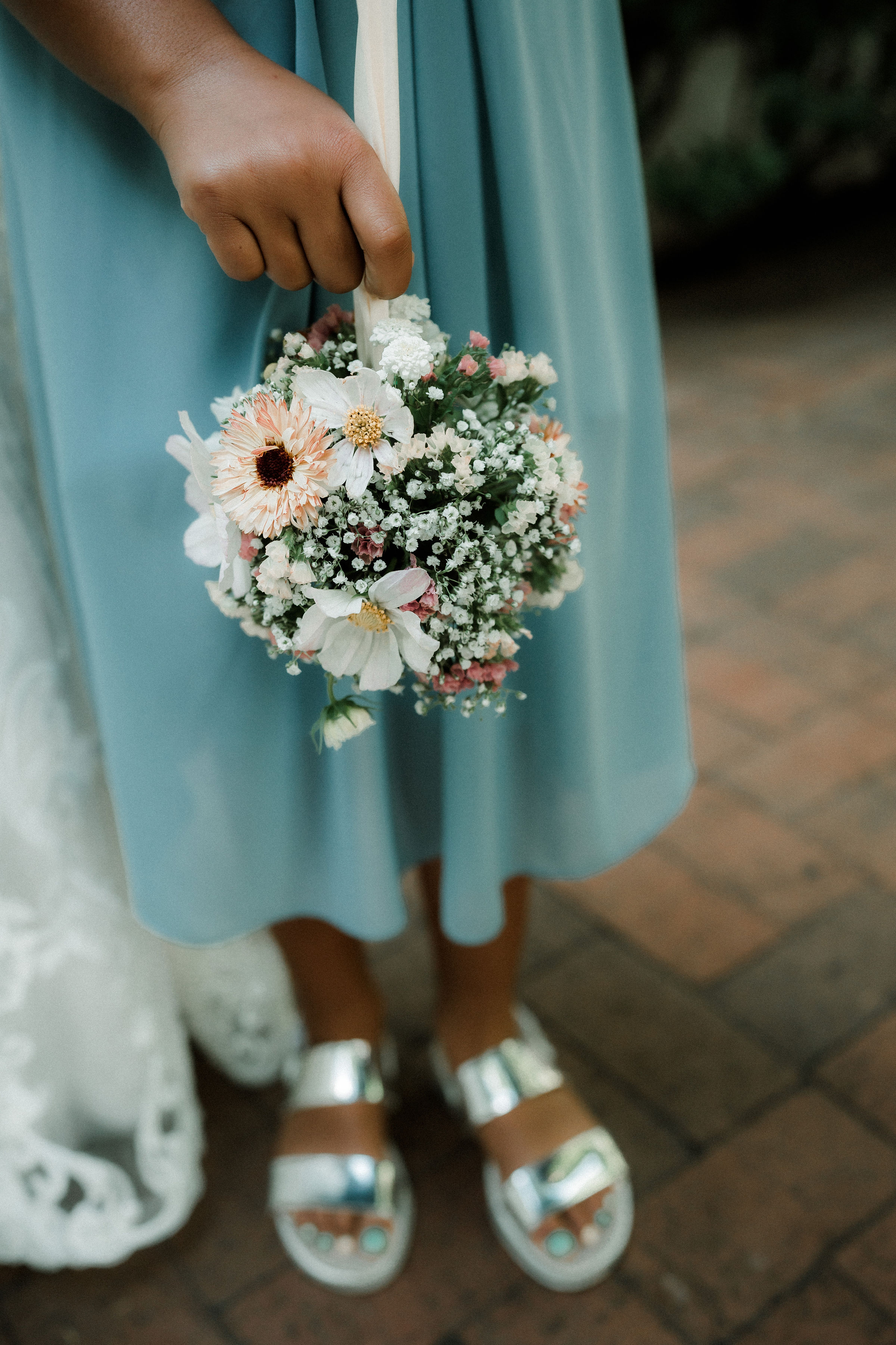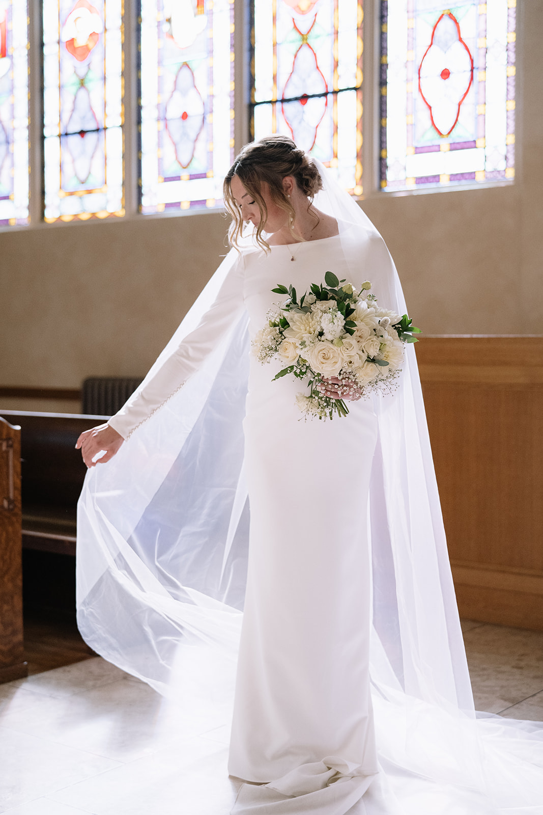 Ali & Mike kept floral minimal for their vows at St. Mary's Cathedral. We place two large meadow arrangements in front of the altar. The flower girls carried single varietal bouquets that were also an offering for Mary.
