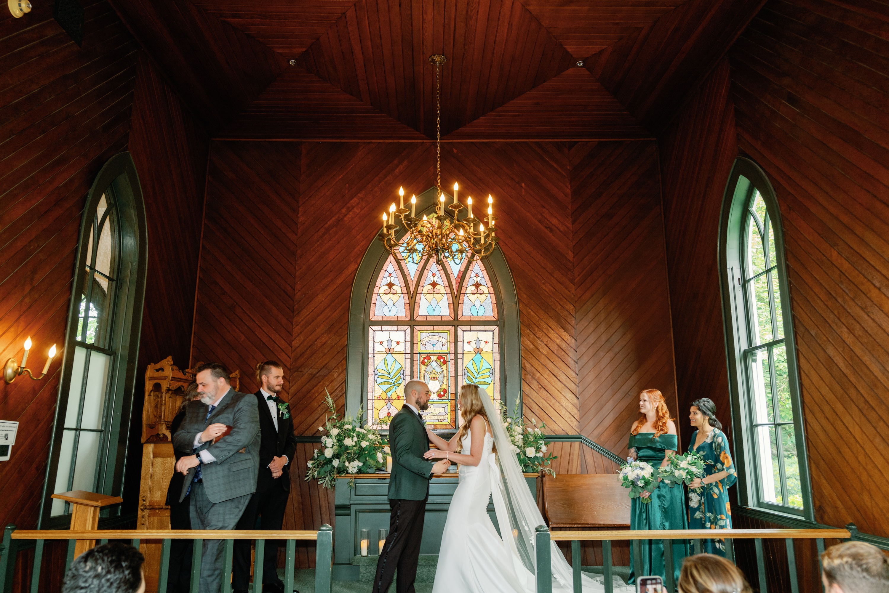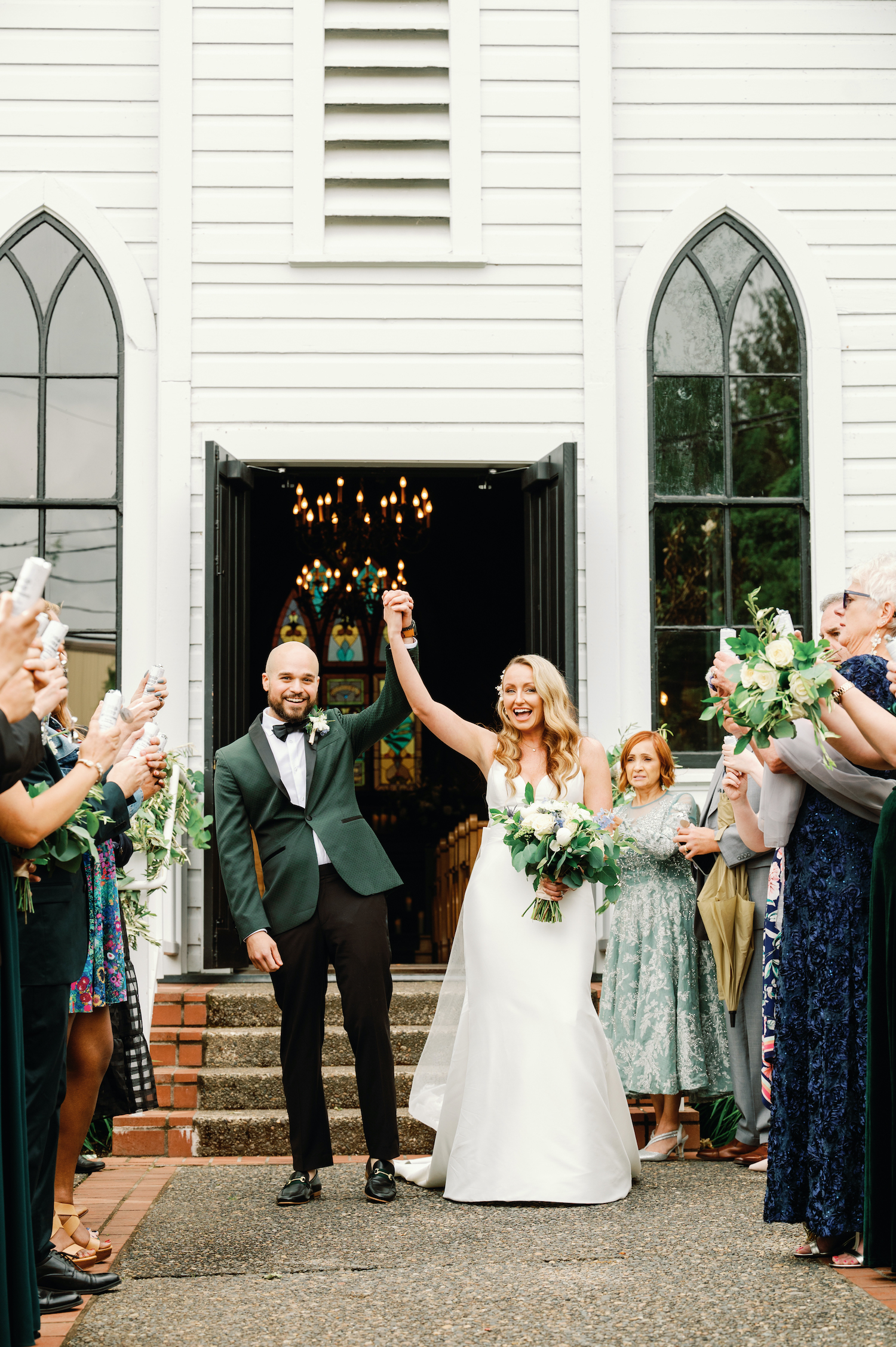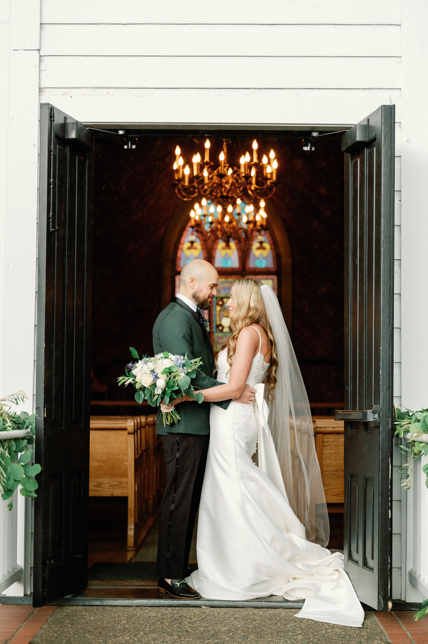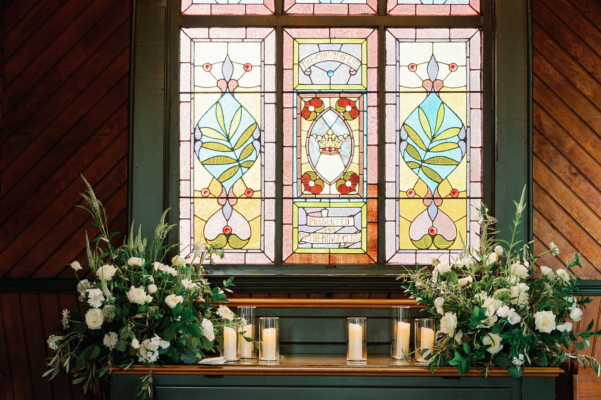 Laura and Kevin exchanged vows at the quaint Oaks Pioneer Church in Sellwood before heading to their reception at Domaine Roy. We adorned the altar with a few candles and two midsize meadow arrangements. The display perfectly framed the beautiful stained glass windows.