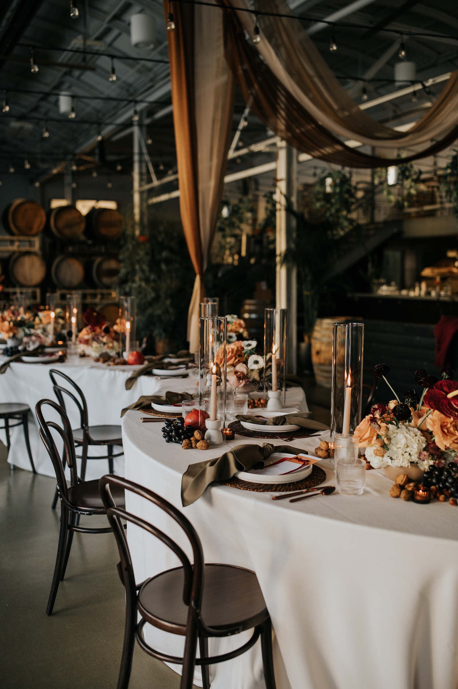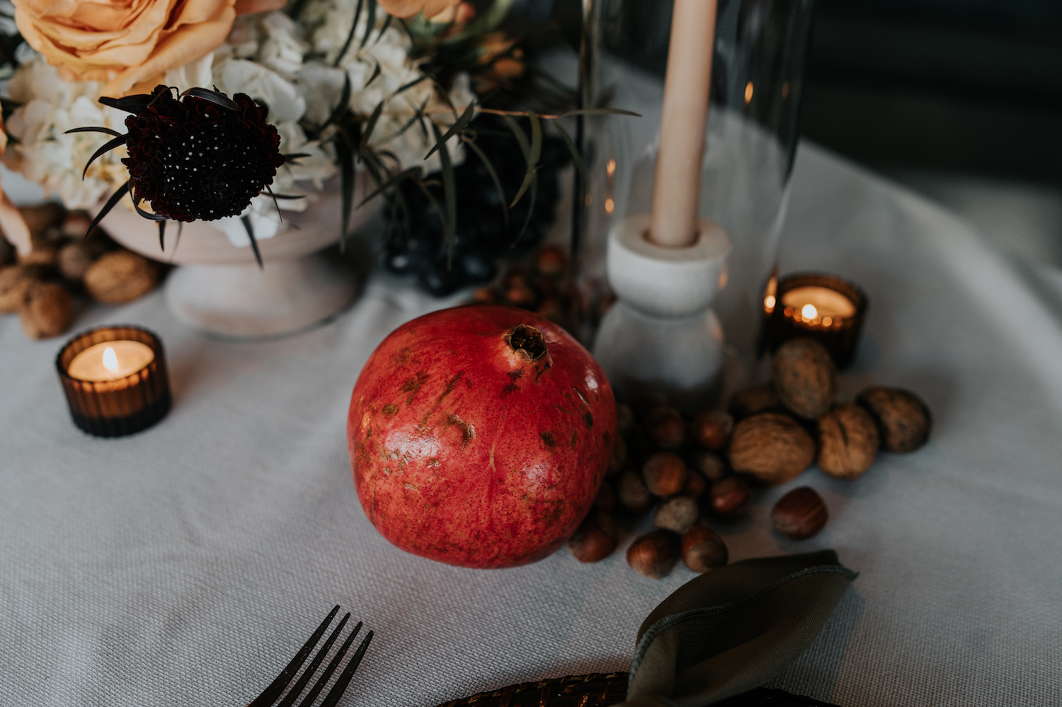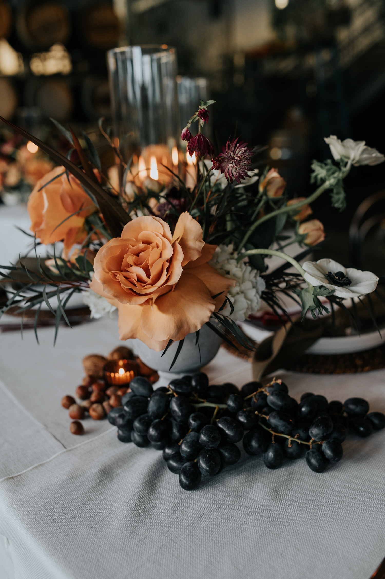 For this moody, boho styled shoot at Coopers Hall we incorporated black grapes, pomegranates, and nuts to create a sense of coming to a bountiful winter feast. We love how the colors of the fruit paired so well with the browns and burgundies of the florals and linens.
