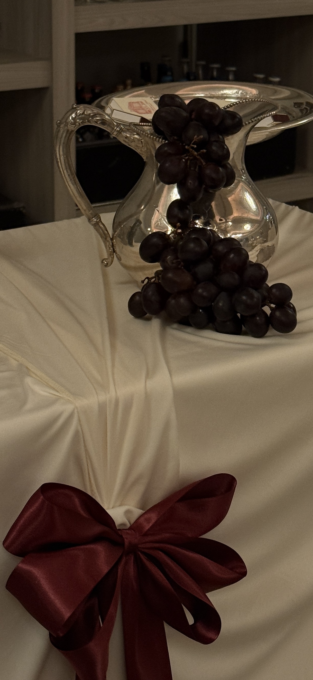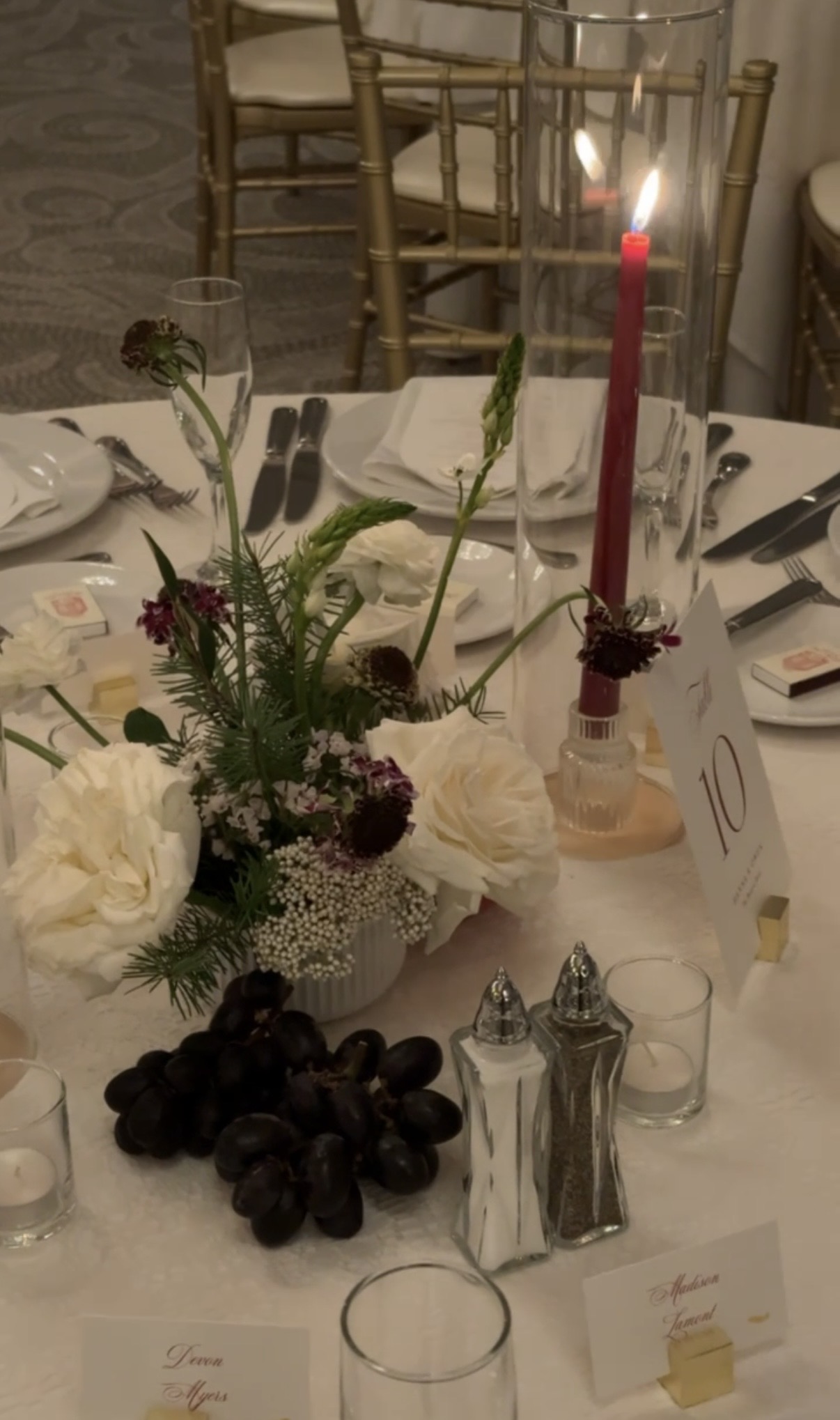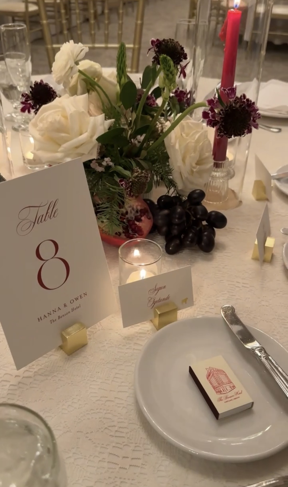 Hanna & Owen's wedding was the epitome of timeless elegance meets modern design. It was a December wedding so we leaned into creams, burgundies, and greens - but avoided a Christmas-theme. Dripping grapes, cut open pomegranates, and apples added a chic, trend-forward element throughout their reception space.