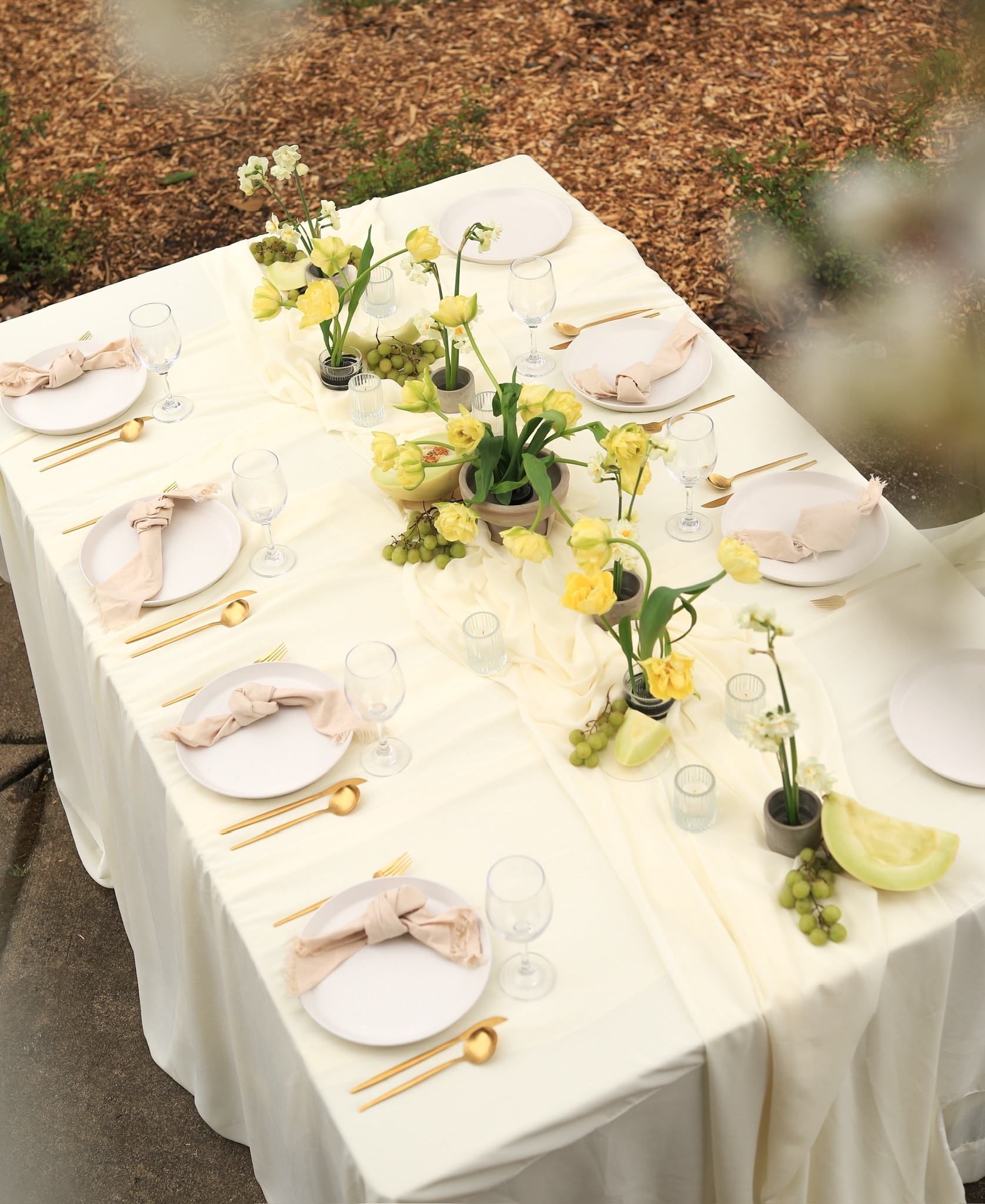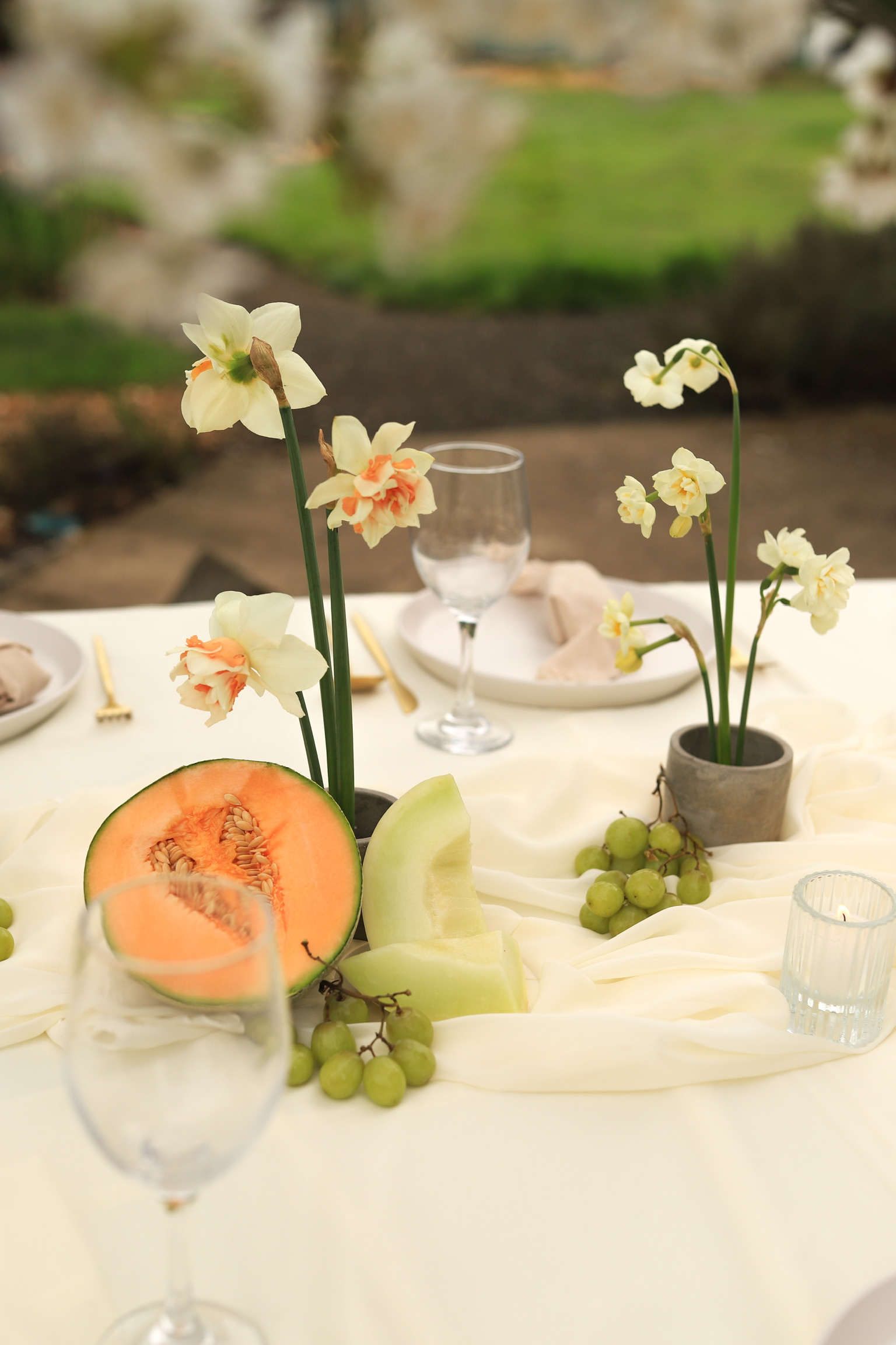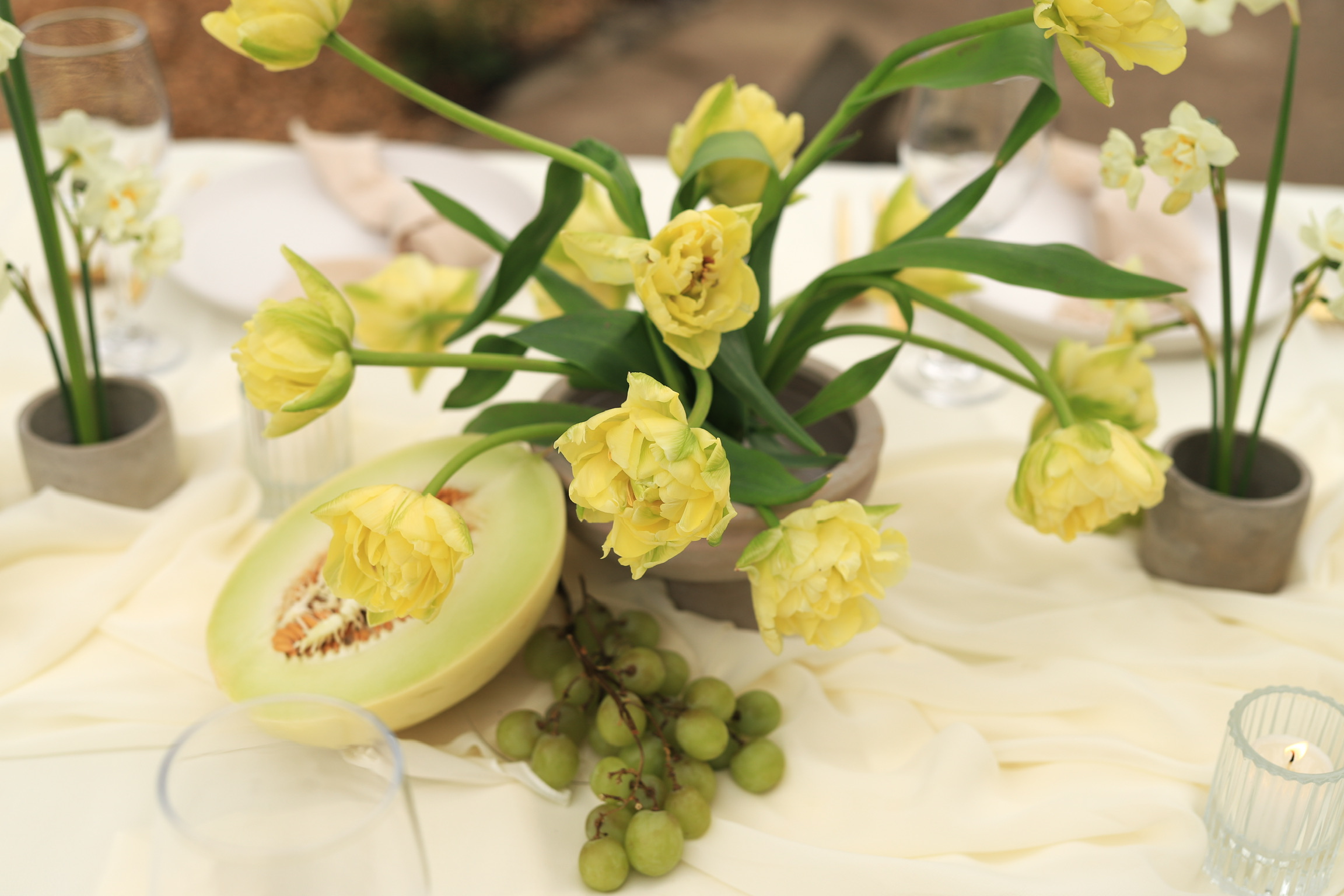 We love how the cantaloupe, grapes, and honeydew matched so well with the tulips and daffodils, creating a cohesive, analogous tablescape.