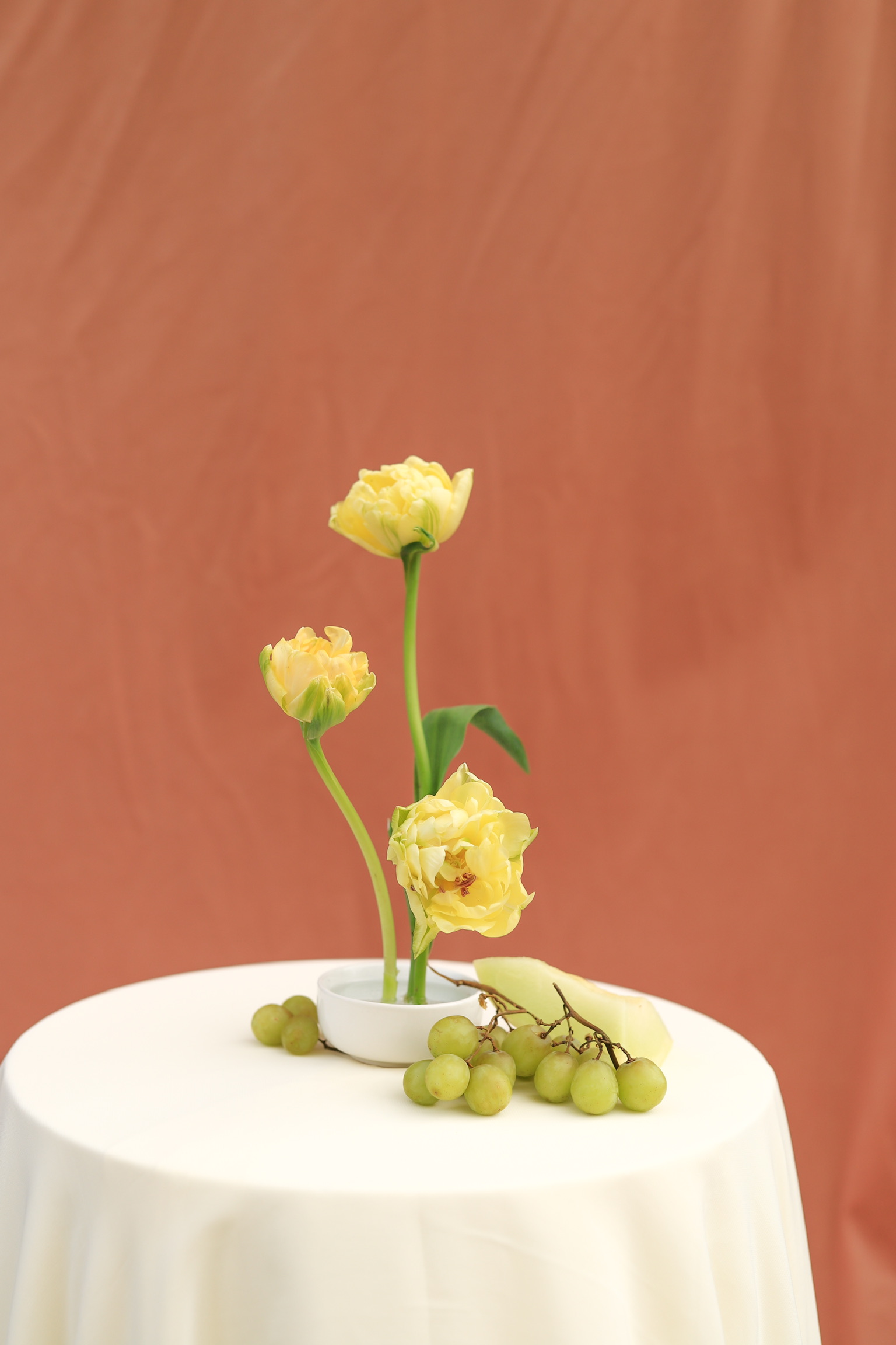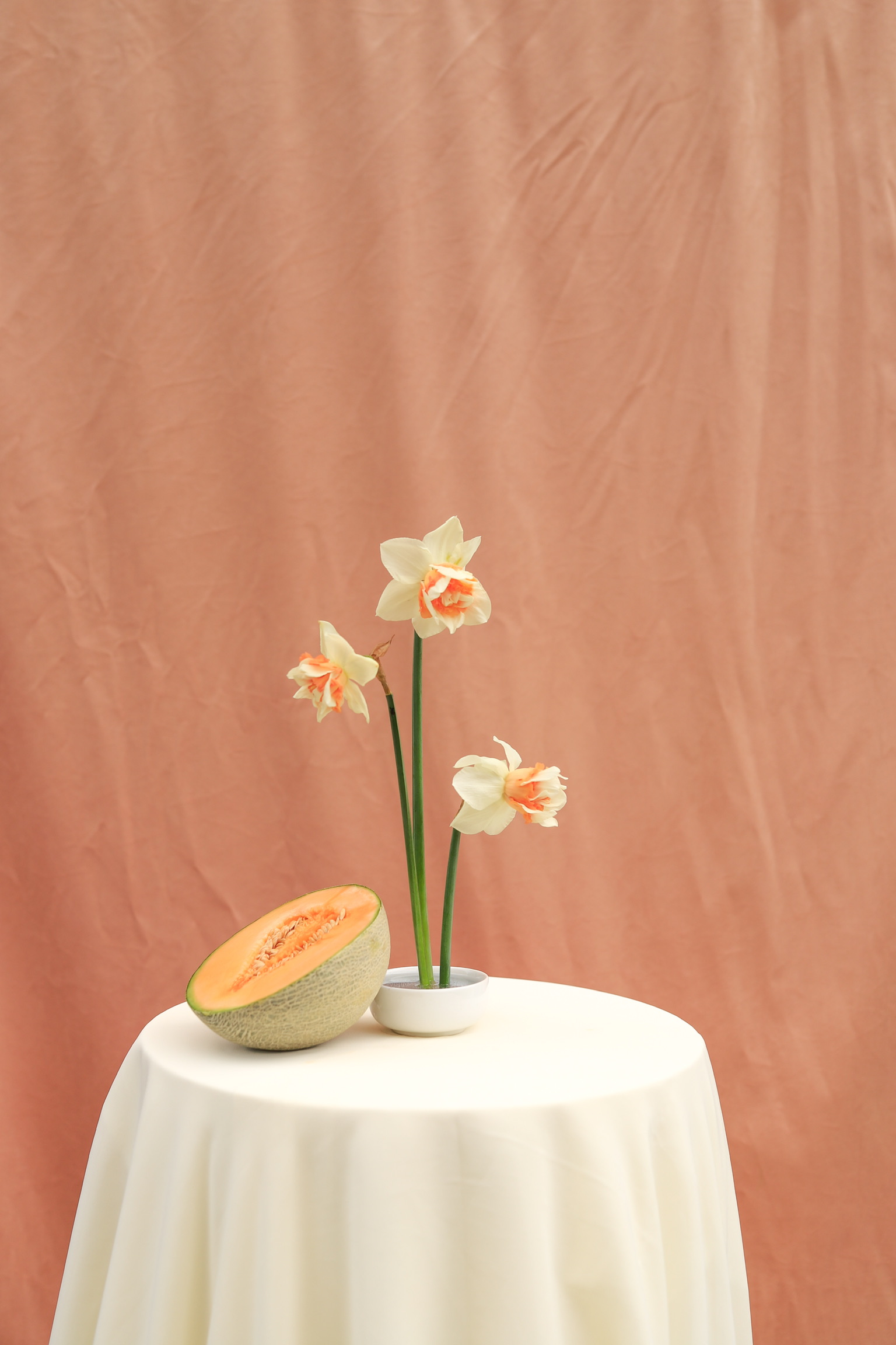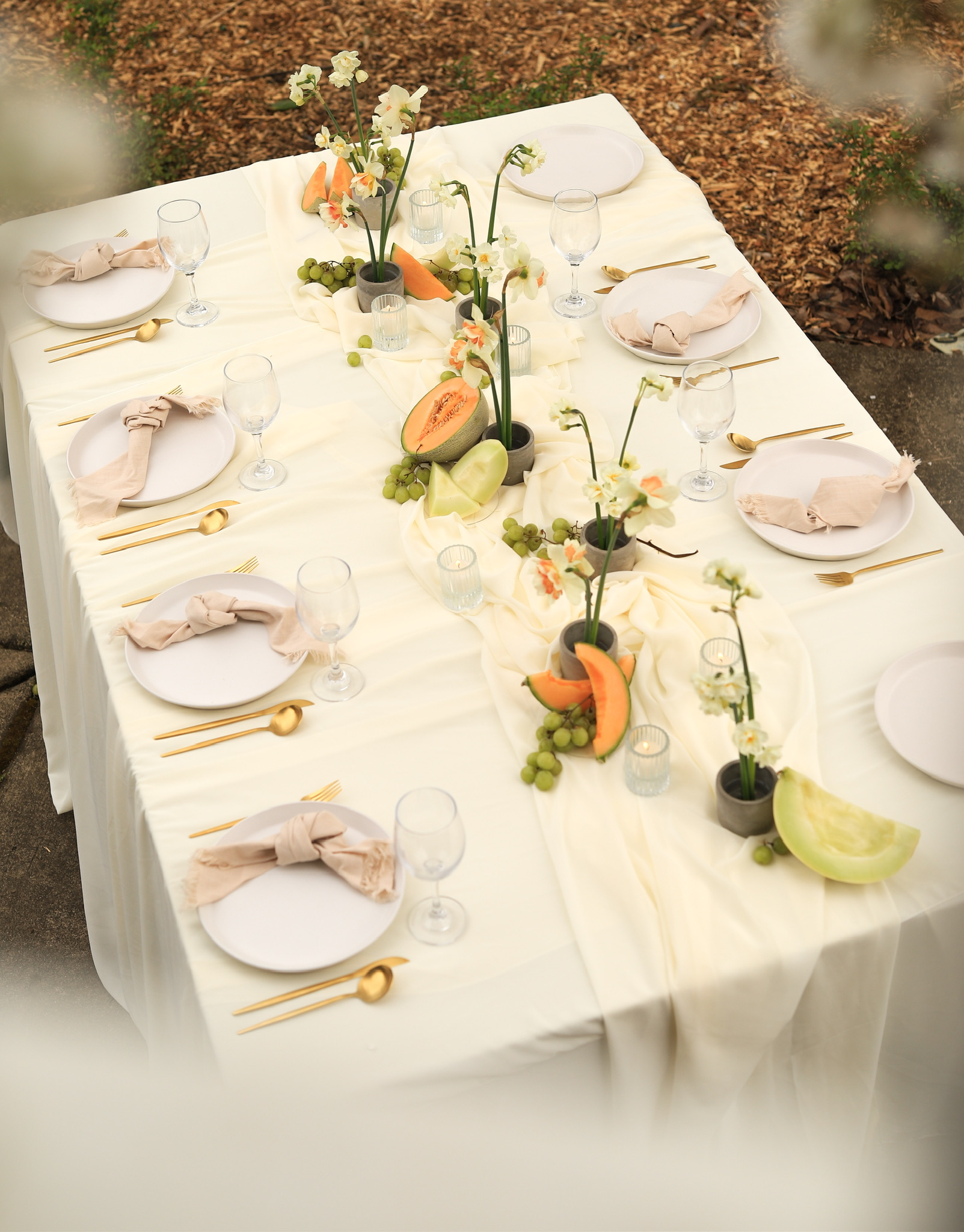 We love how the cantaloupe, grapes, and honeydew matched so well with the tulips and daffodils, creating a cohesive, analogous tablescape.