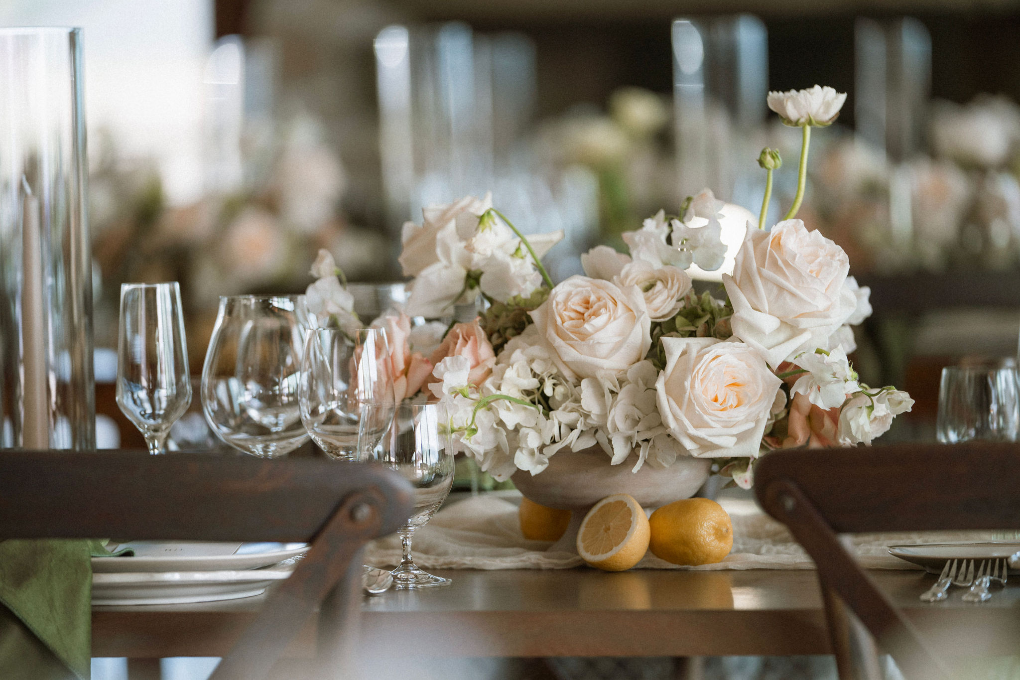 Lemons at the base of Hannah & Luka's centerpieces added to the Italian vibe perfect for their wedding at Lachini Vineyards. Proof that even a small bit of fruit can be the detail that transforms a tablescape from simple to elevated.