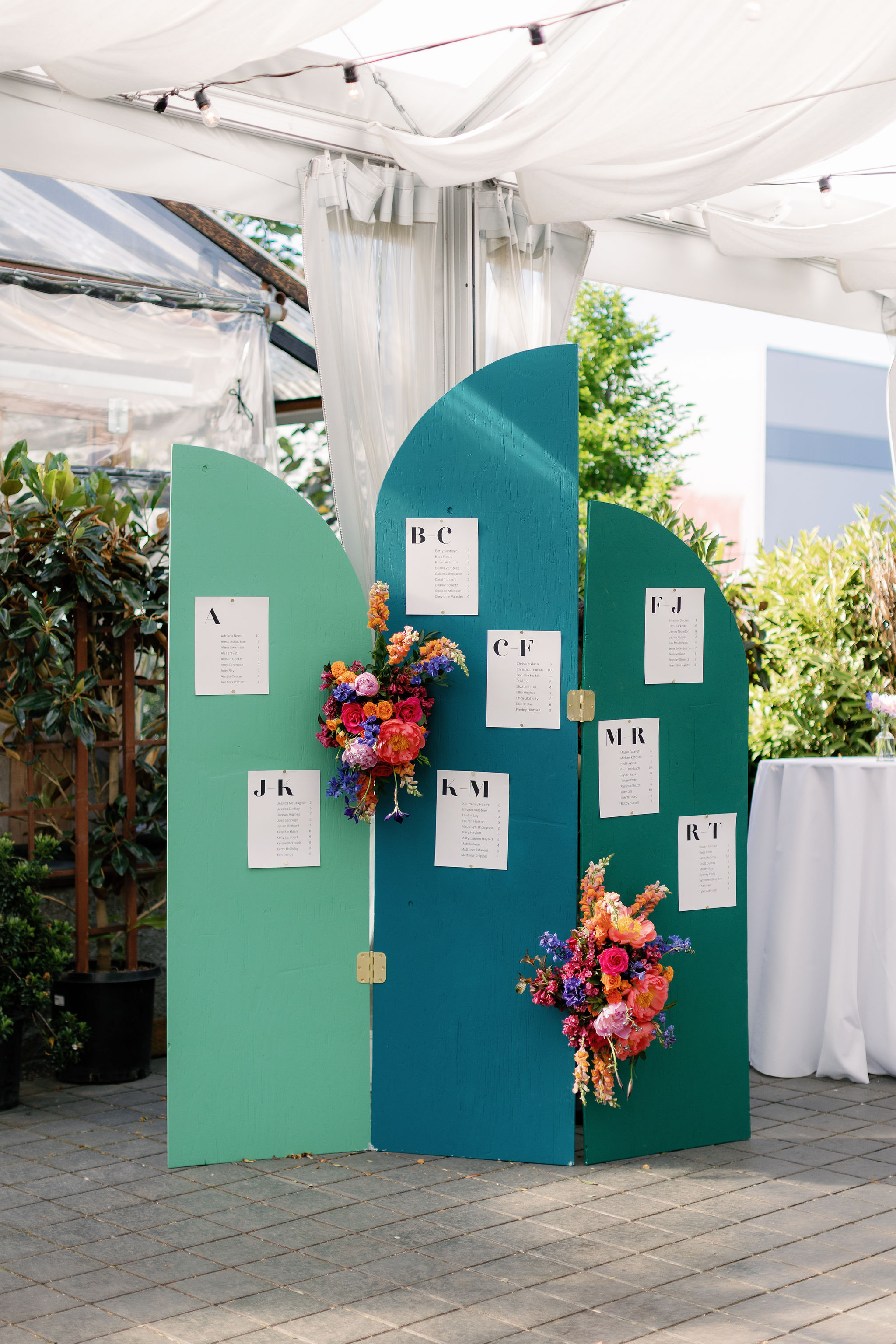 We love scattering bud vases on a seating chart or champagne wall. It's a simple but effective way to incorporate flowers and add more visual interest to your signage.