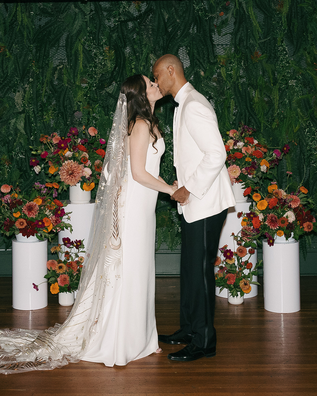 We designed a bright flower cloud for Nishi & Joey's wedding at Blockhouse. Flower clouds are such a fun statement piece so create more photo opportunities by having your sweetheart table placed below it after the ceremony. We also added several pillar candles for an extra glow!