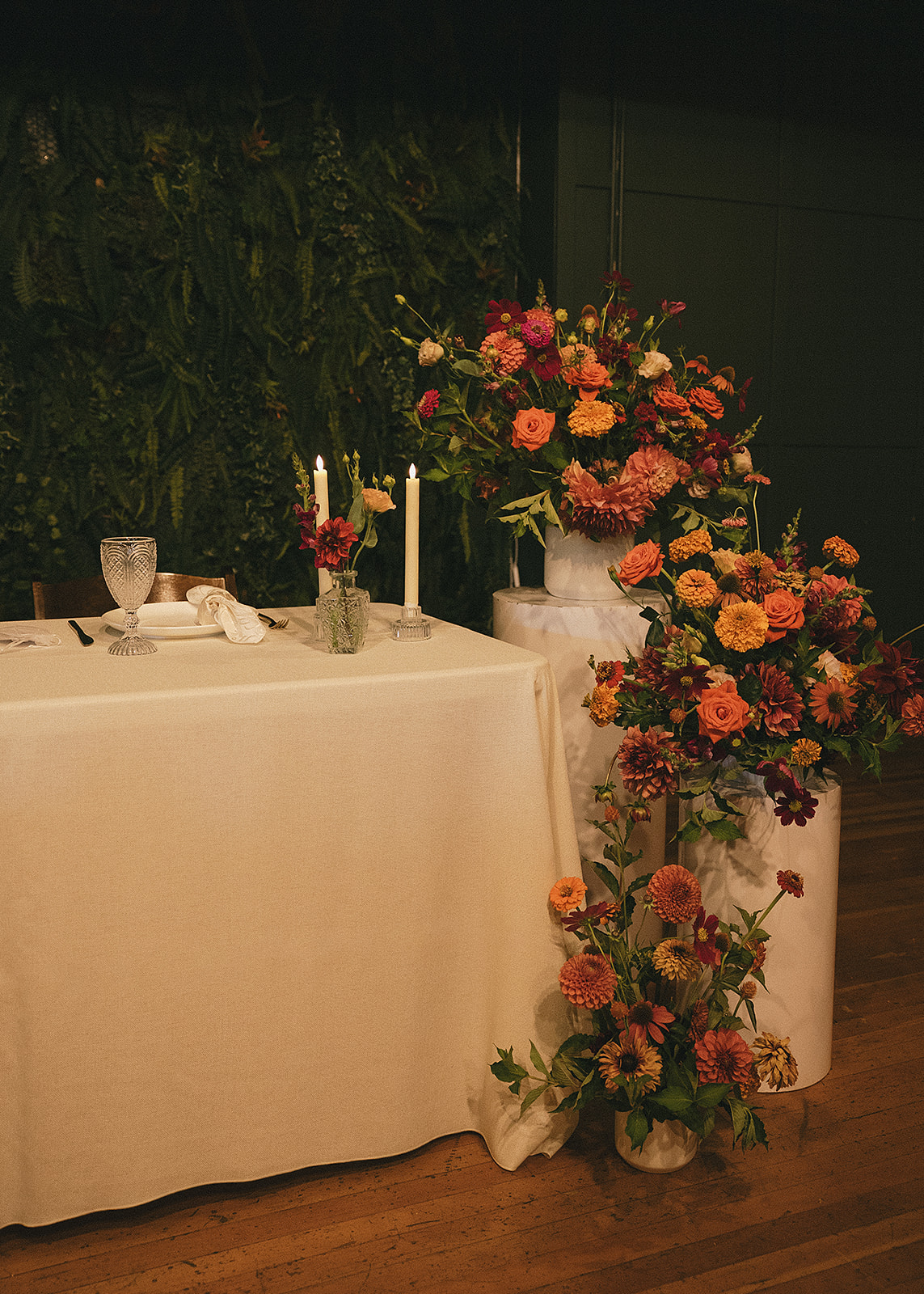A & T had their head table positioned under their airy, boho flower cloud at Blockhouse. Since this table had people seated on both sides, we added a low and long arrangement to the center of the table with candles on both sides.