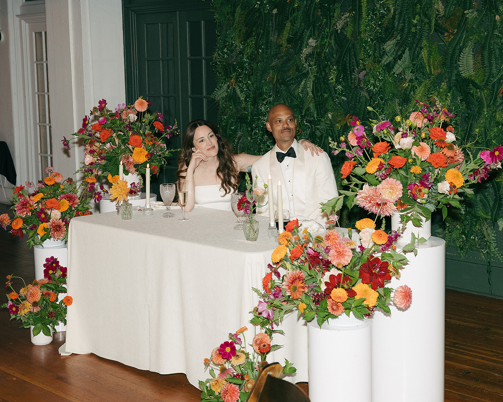 We love the high-low asymmetrical moment for Abri & Paul's sweetheart table. We used a pillar from their ceremony design to frame one side of the table and added ground pieces to the opposite side for balance (while still feeling unique and interesting). This is a fun example of using different pieces from your ceremony in a new way for your reception.