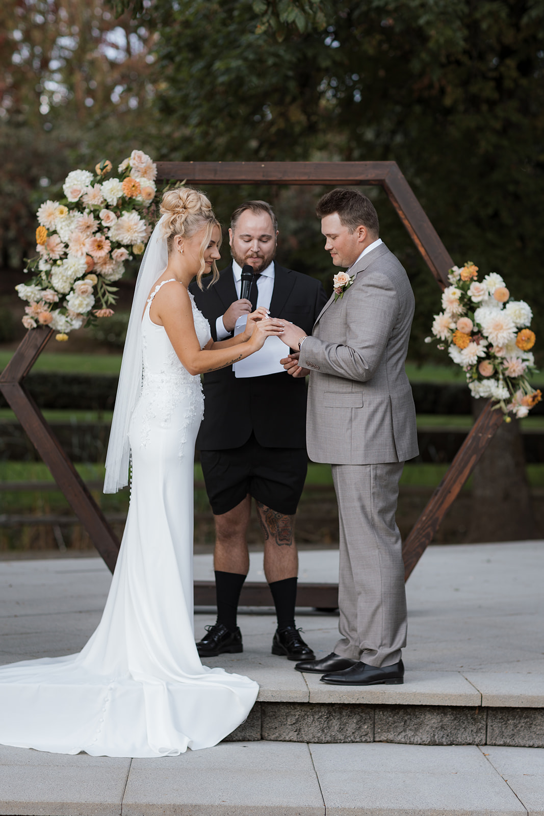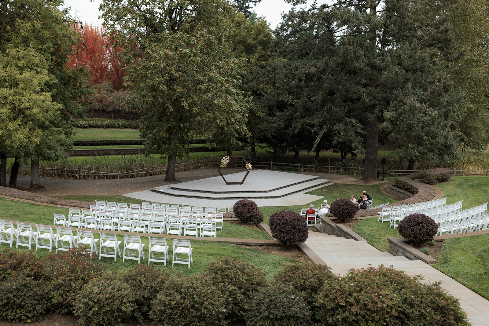As you wander through the grounds, you'll discover charming hidden corners, sun-dappled pathways, and scenic backdrops that change beautifully with the seasons. And beyond the amphitheater, a stunning view of Mt. Hood provides the perfect finishing touch, creating a truly magical setting for your big day.