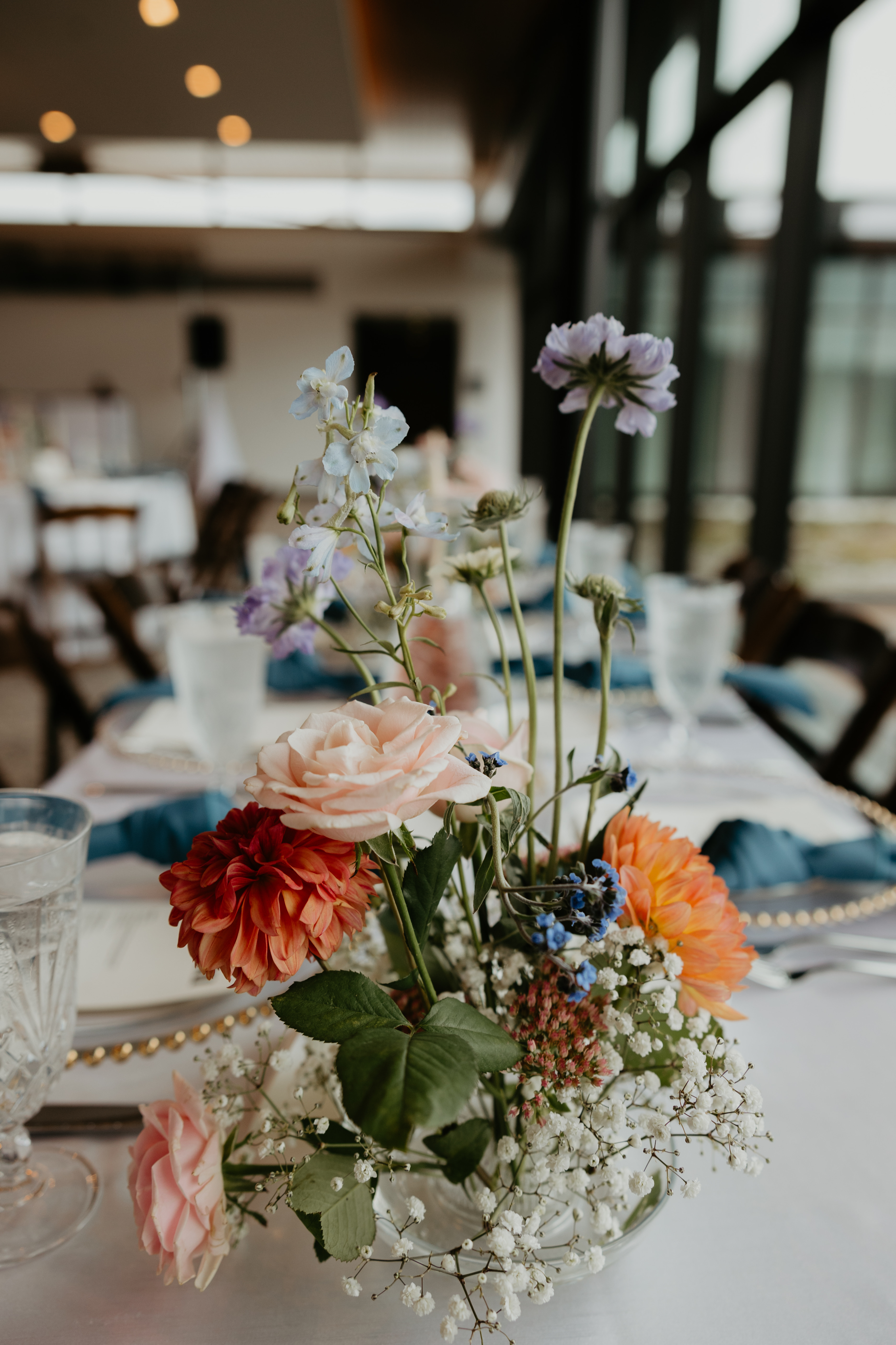 Wildflower inspired weddings don't always have to be at an outdoor venue. Alondra & Anthony wanted a wildflower vibes to fit their 70's decor at Ironlight in Lake Oswego. We used a combination of blues & lavenders with peachy tones to create a retro wildflower aesthetic.