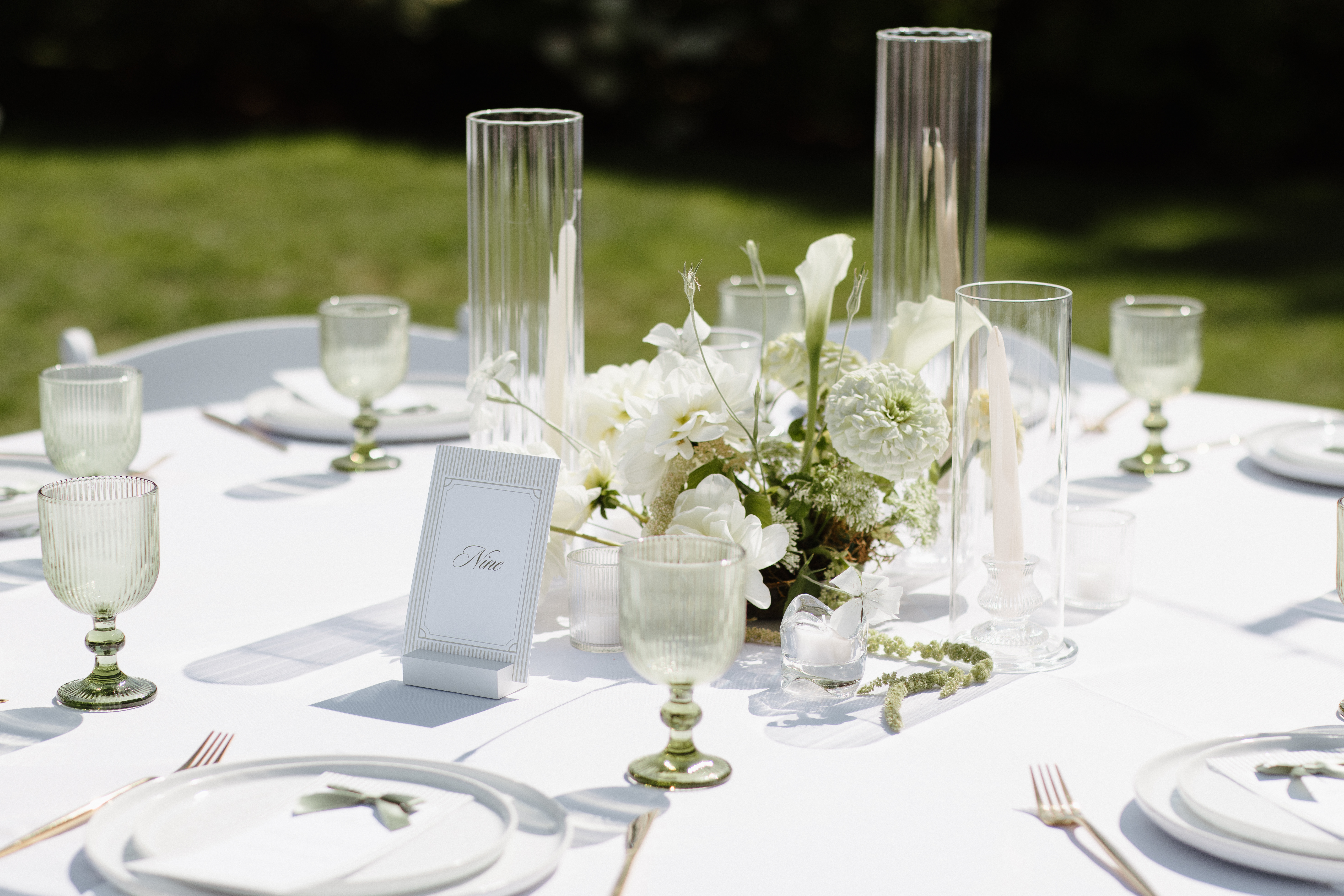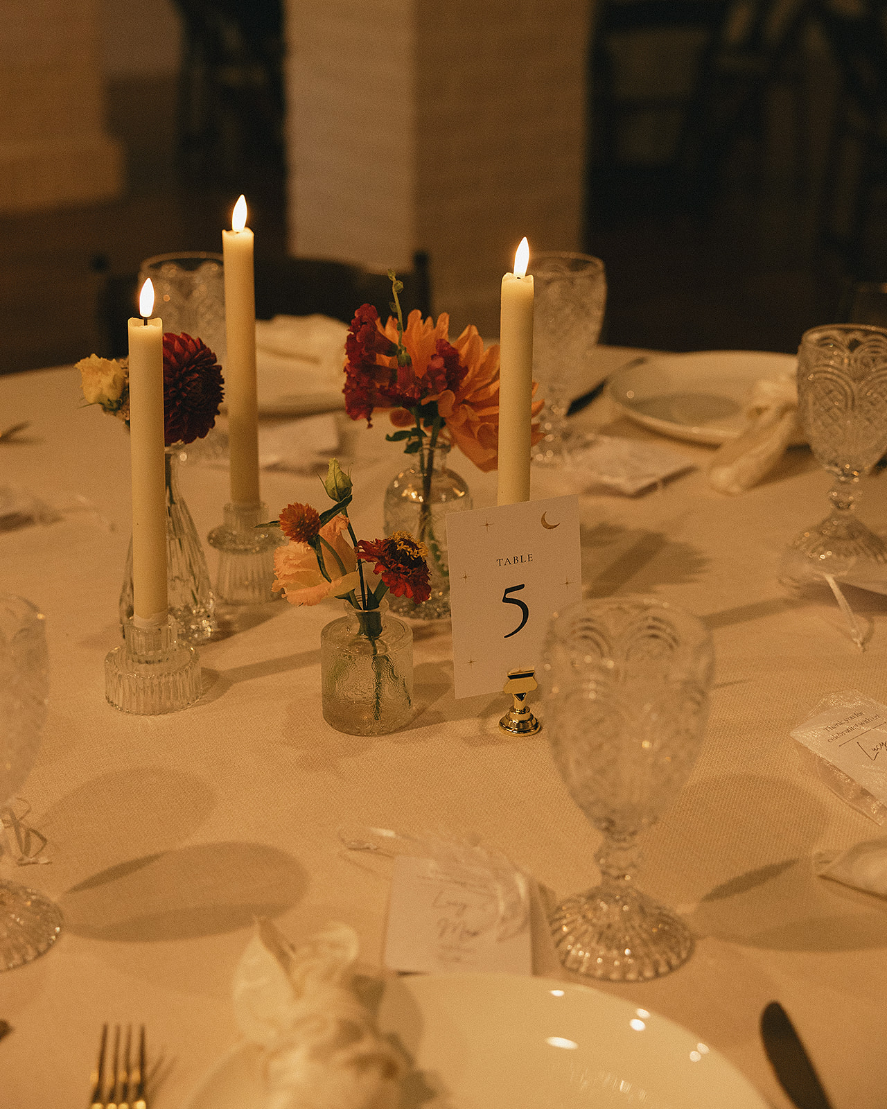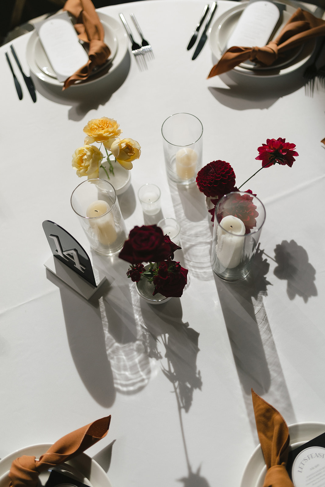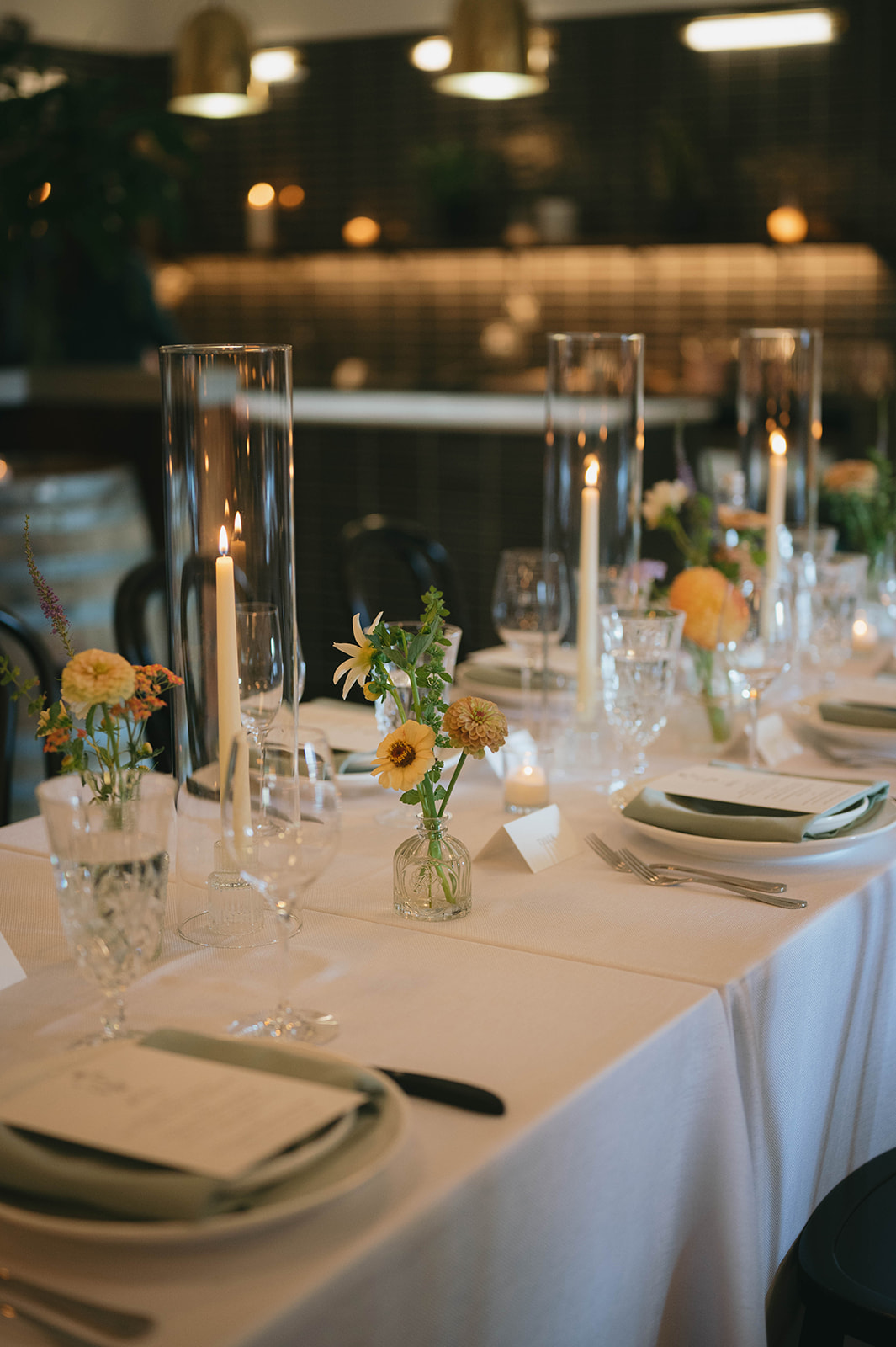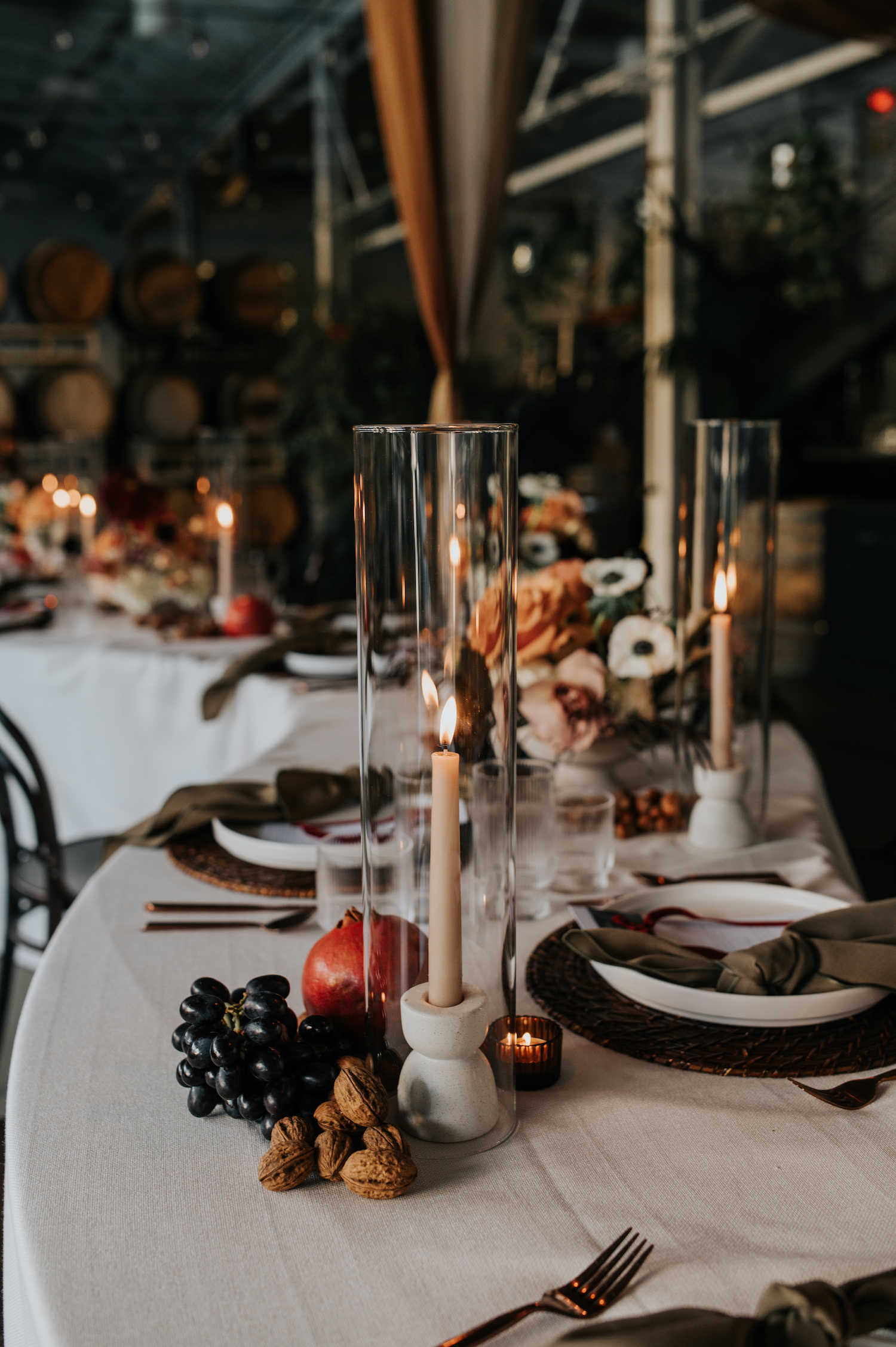 A trio bud vases or pin cups alongside candles create a simple, airy vibe to any table center. We recommend alternating this style with another centerpiece option for added depth. A small modern & airy tray surrounded by a trio of candles is also a beautiful option!