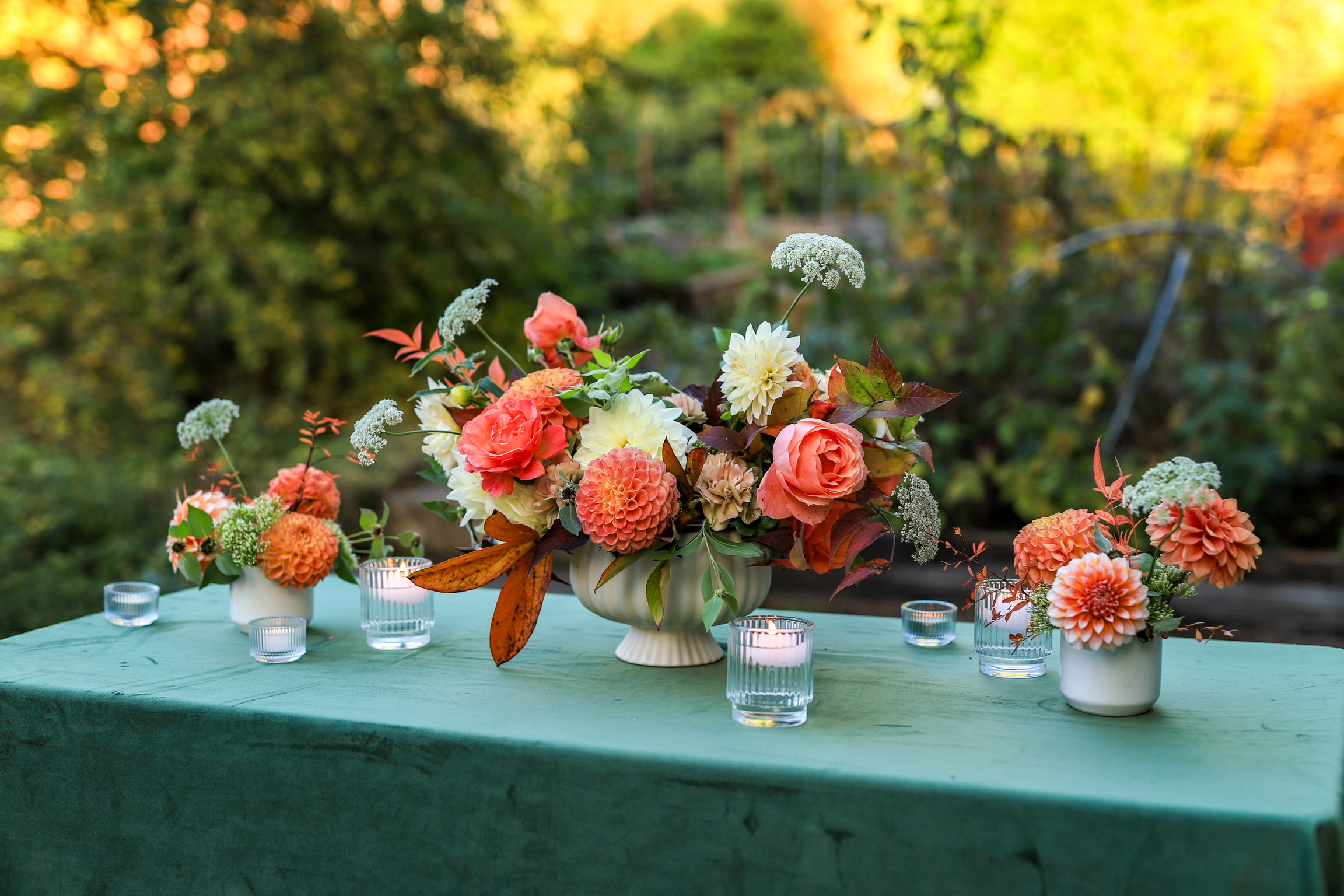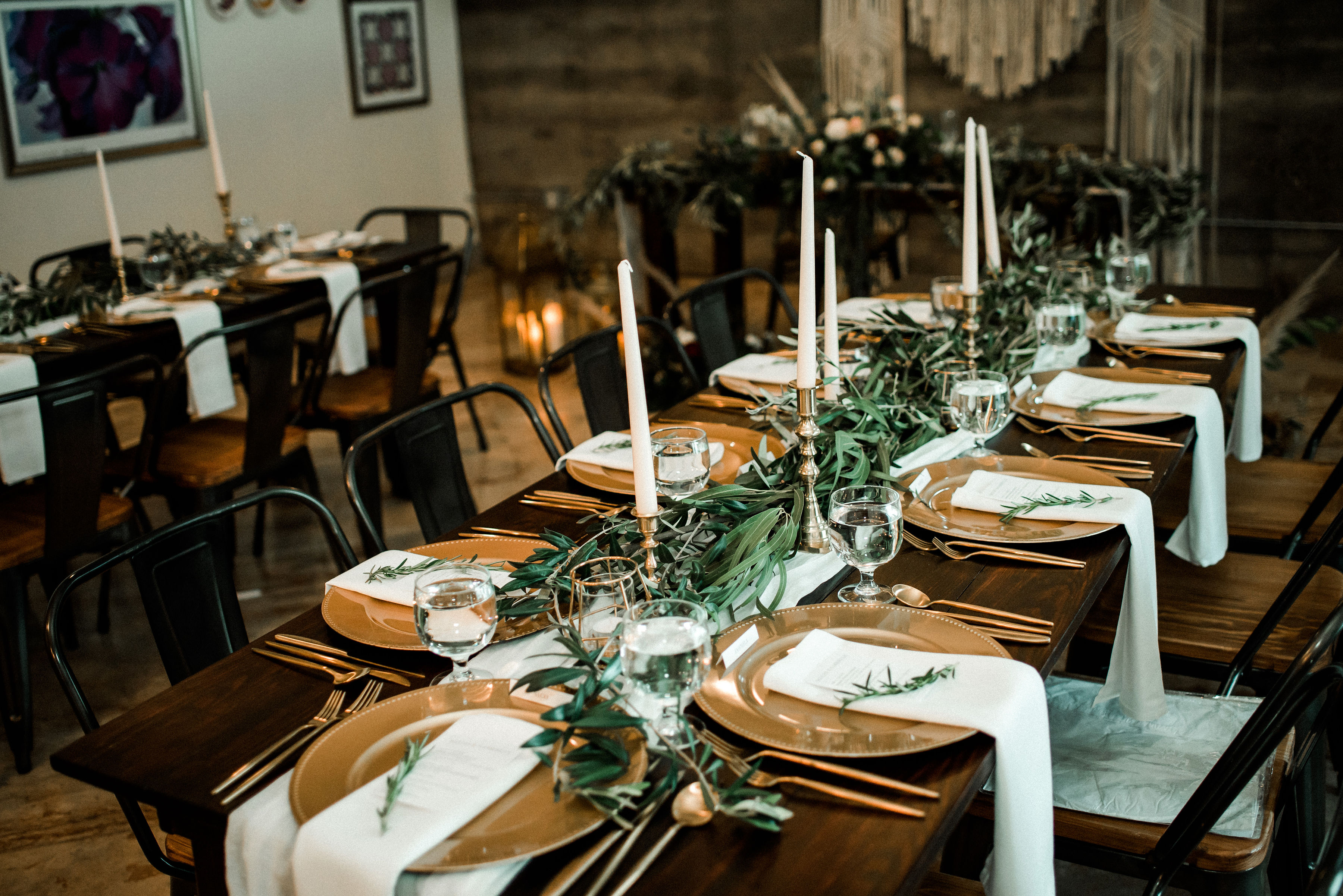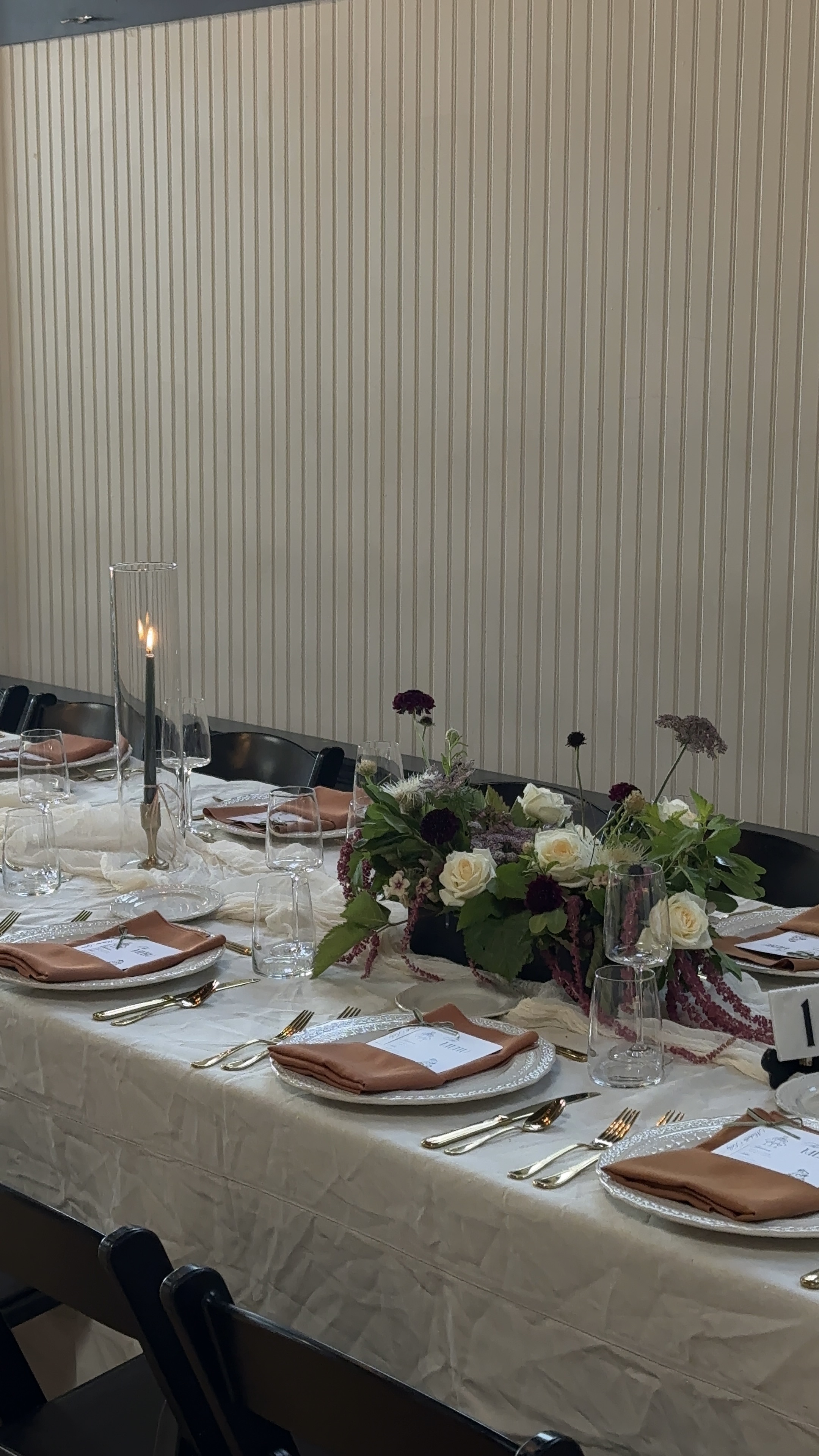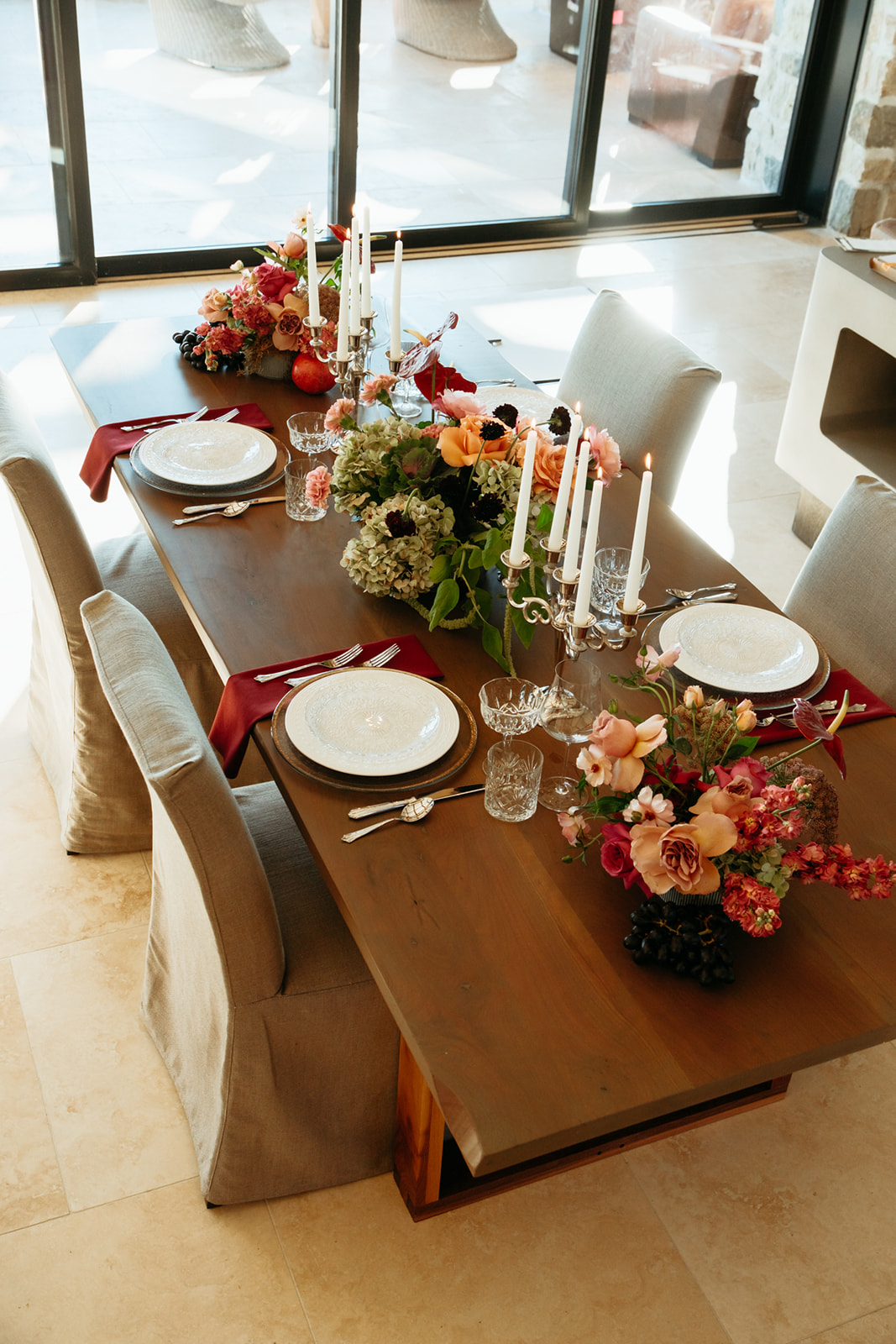 Garland is an easy way to fill your long table. Add candles for a warm and glow-y vibe. Tip: If you're opting for garland, keep in mind if someone will be seated at either end. We make garland in custom lengths based on your specific needs.