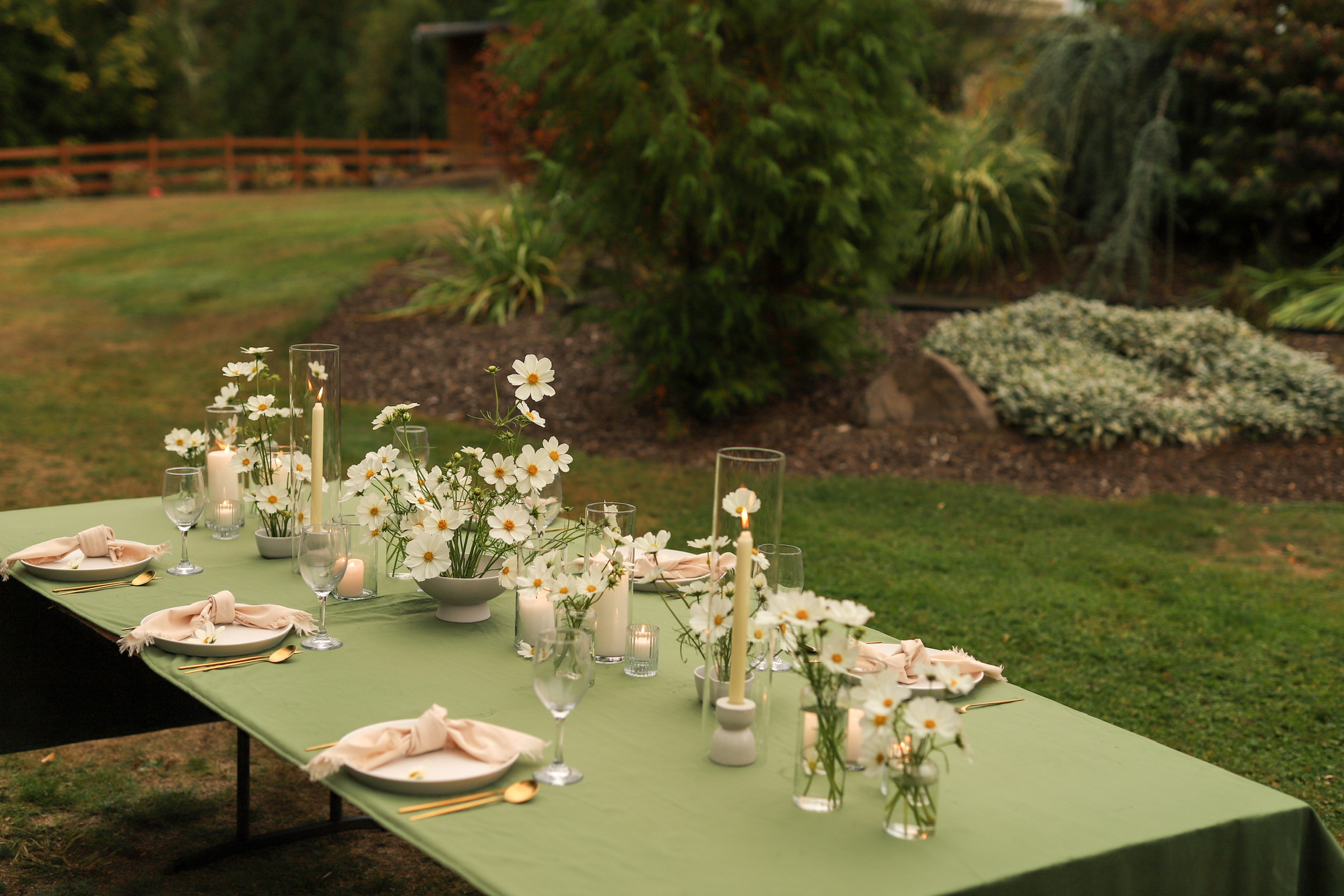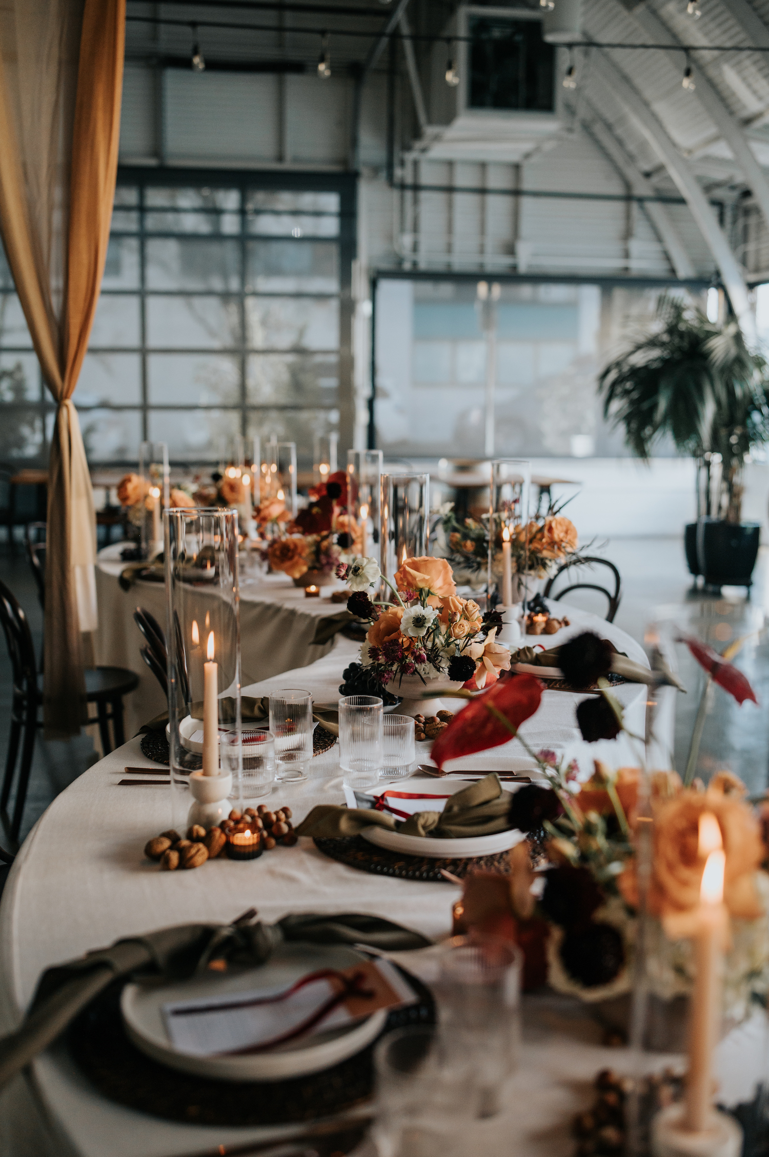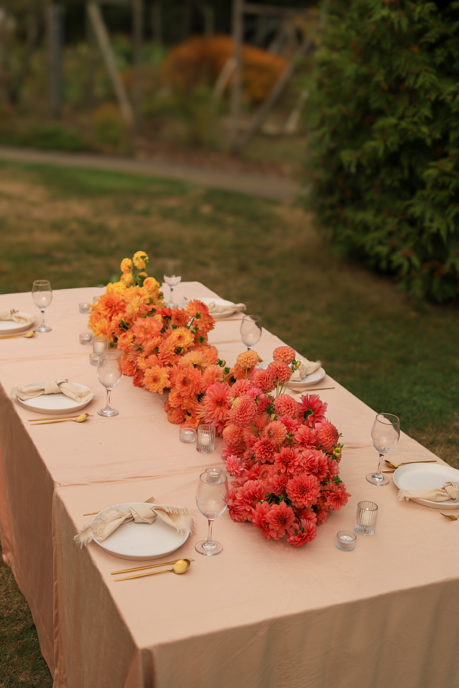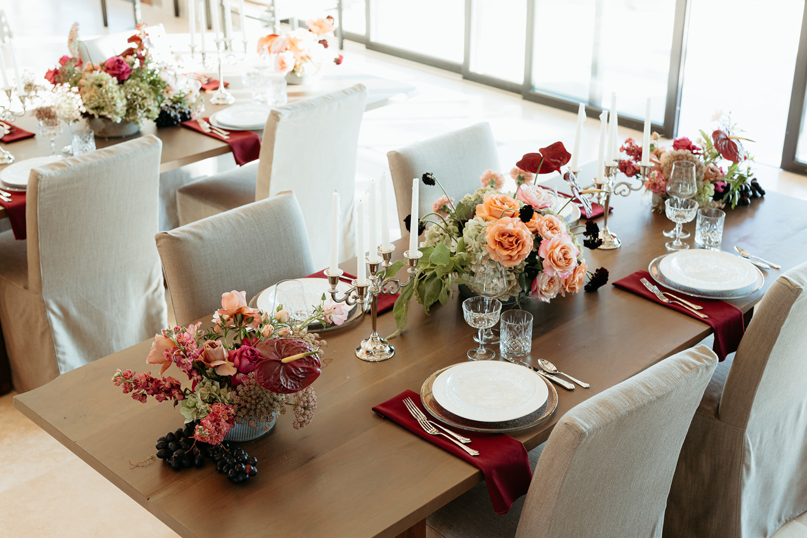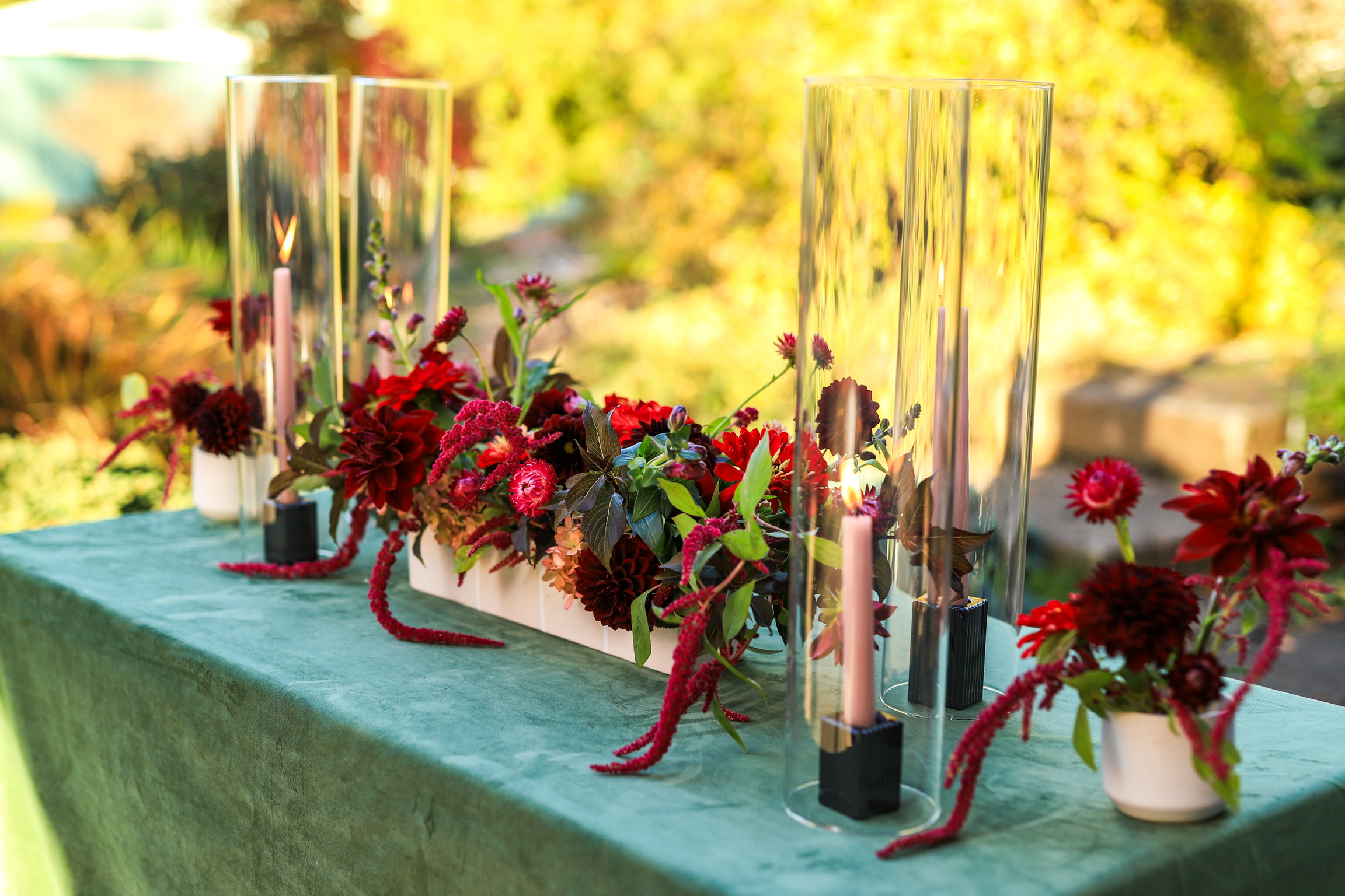 Garland is an easy way to fill your long table. Add candles for a warm and glow-y vibe. Tip: If you're opting for garland, keep in mind if someone will be seated at either end. We make garland in custom lengths based on your specific needs.