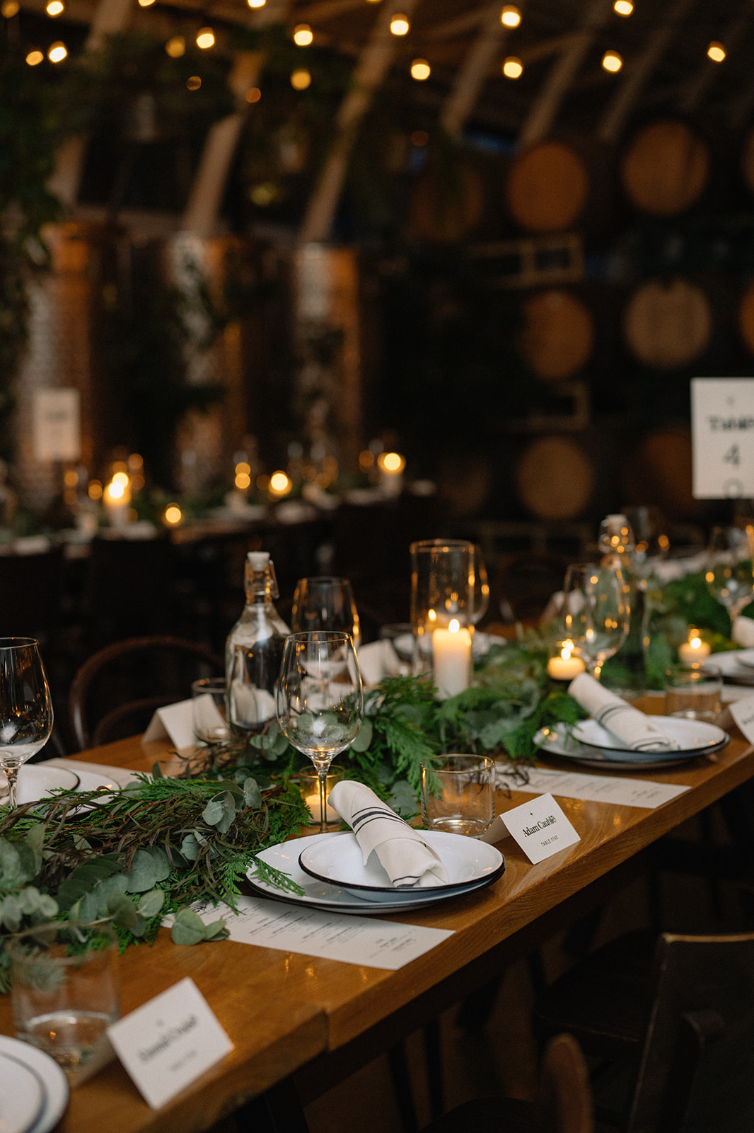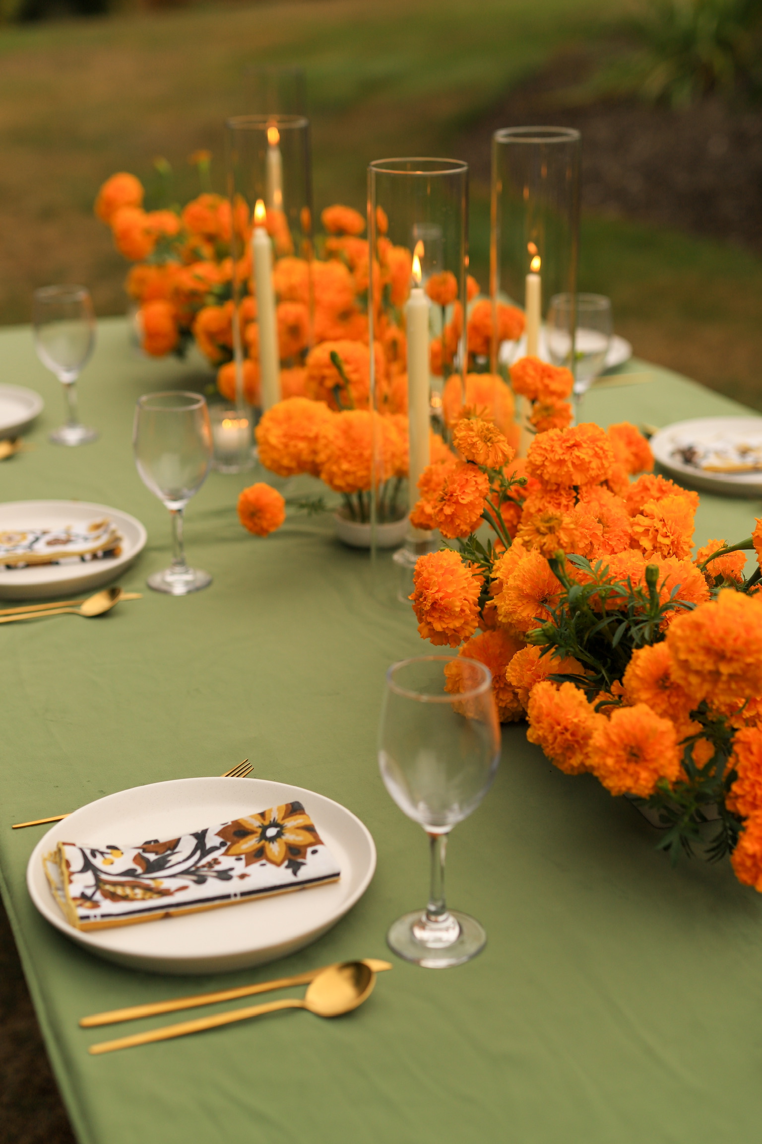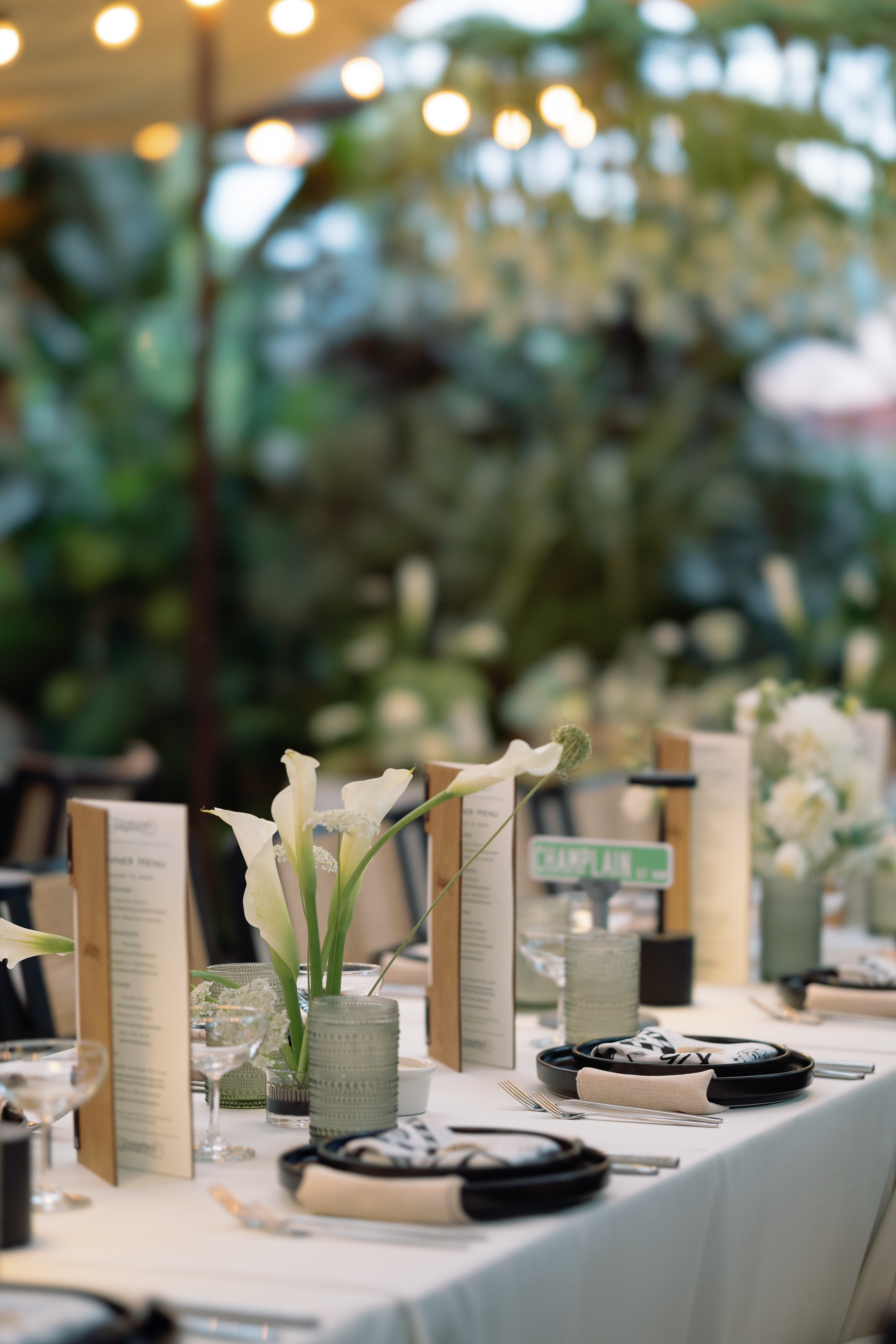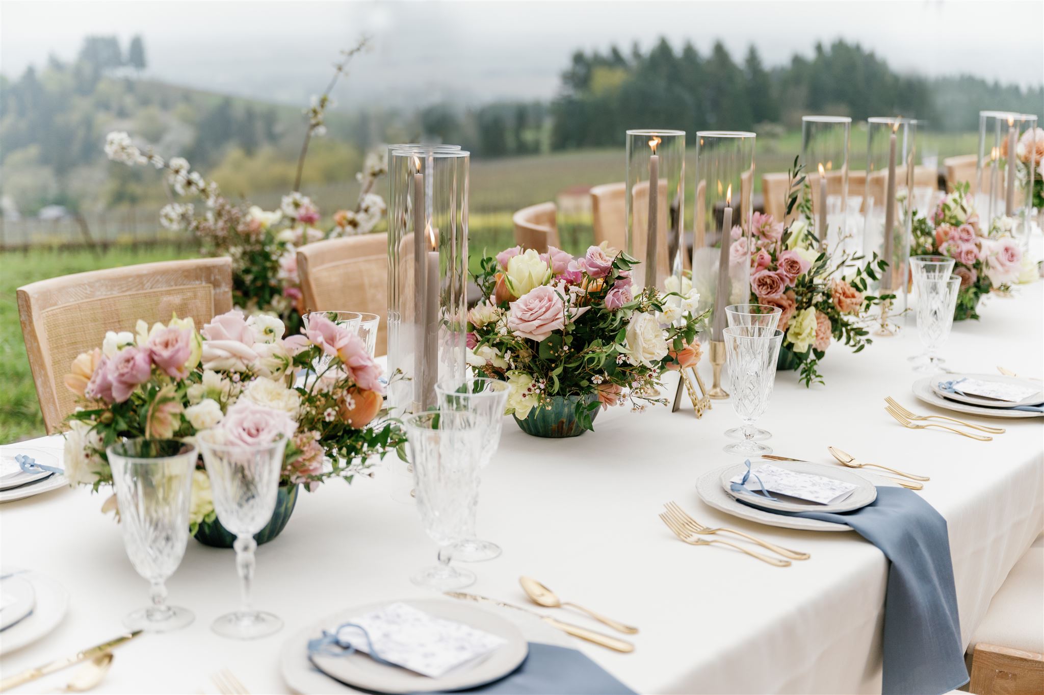 Garland is an easy way to fill your long table. Add candles for a warm and glow-y vibe. Tip: If you're opting for garland, keep in mind if someone will be seated at either end. We make garland in custom lengths based on your specific needs.