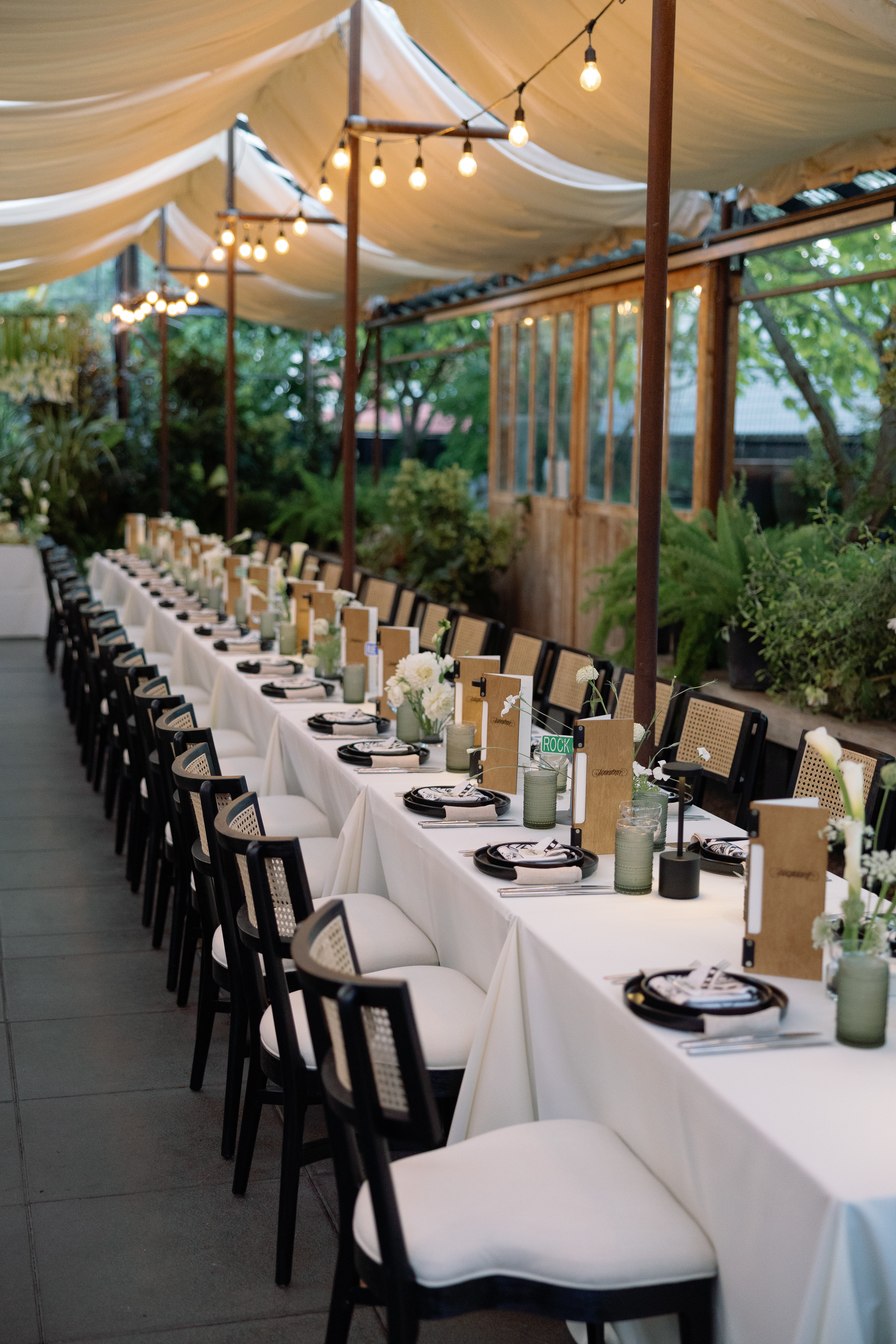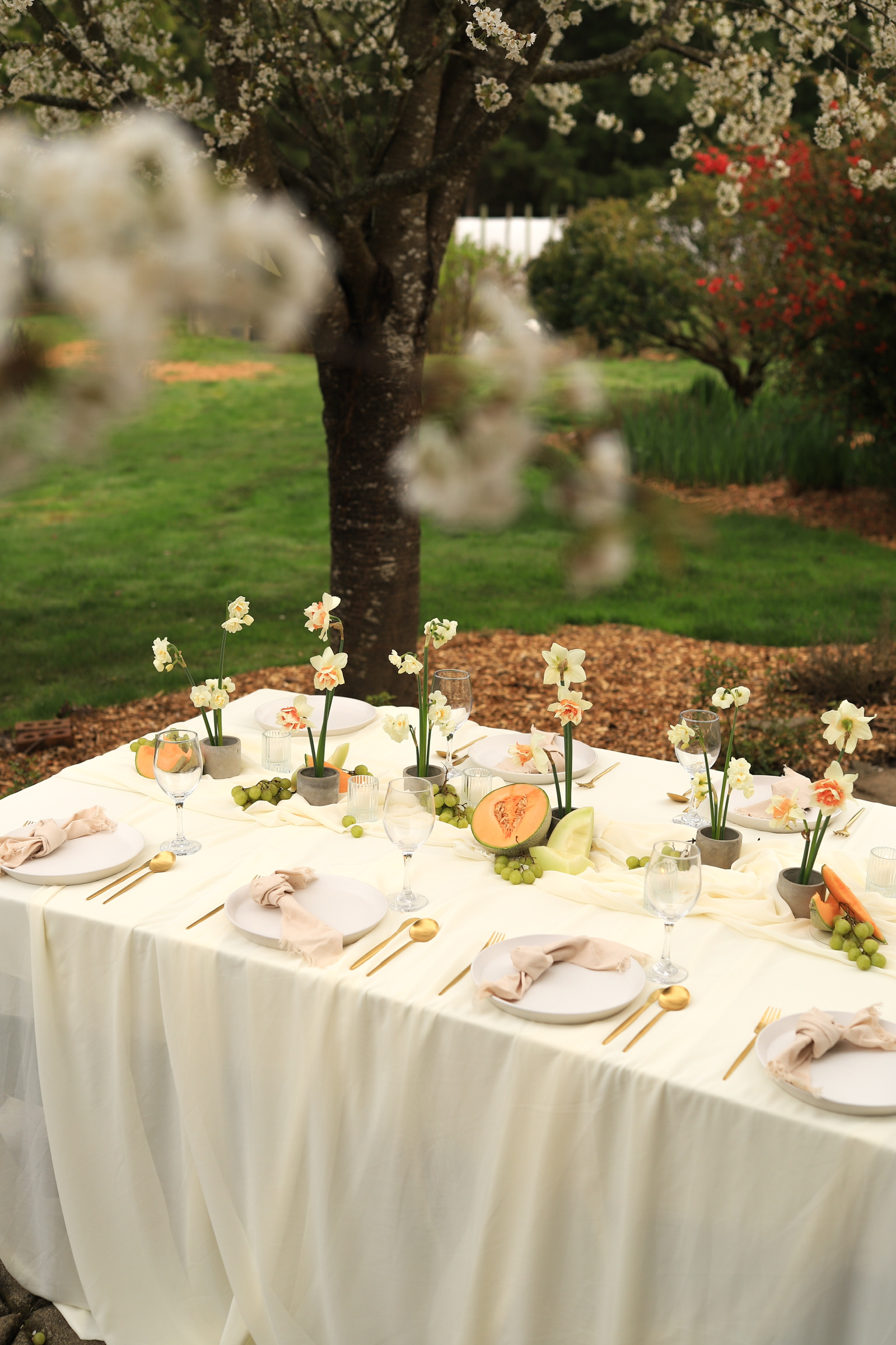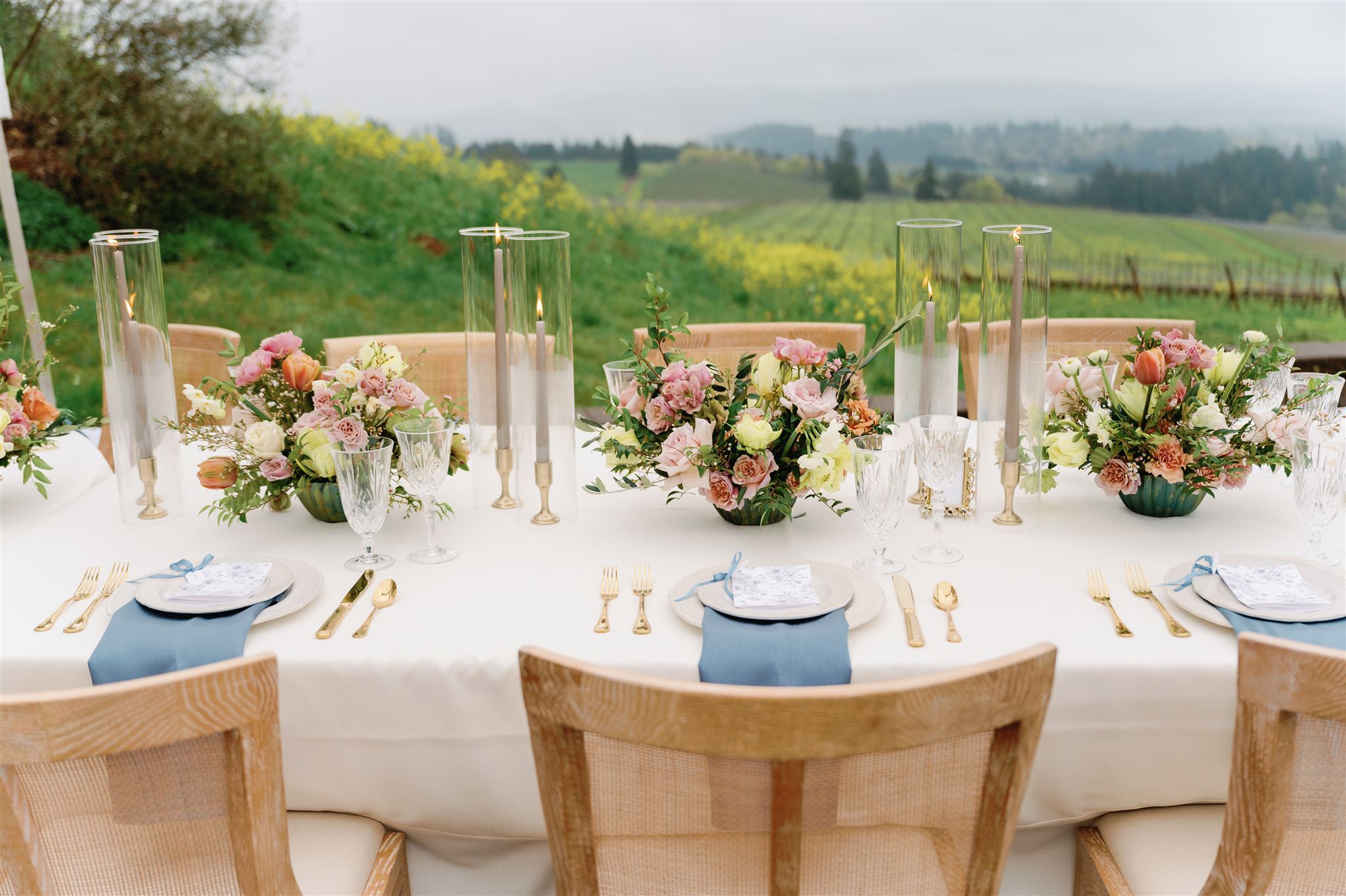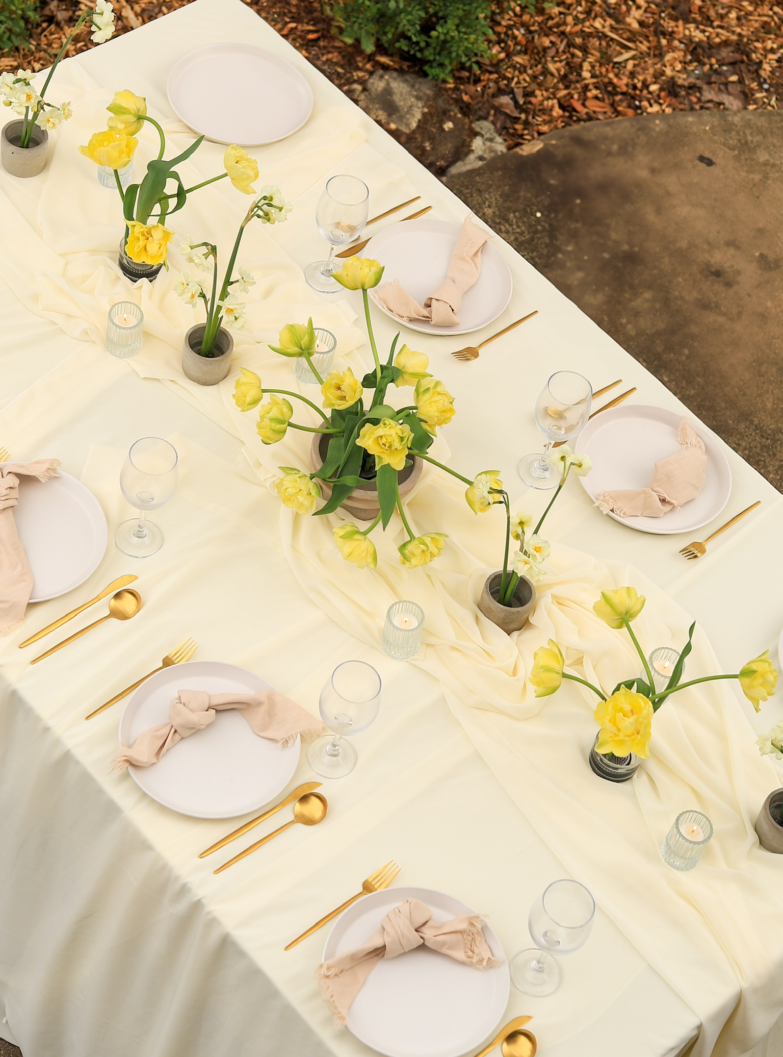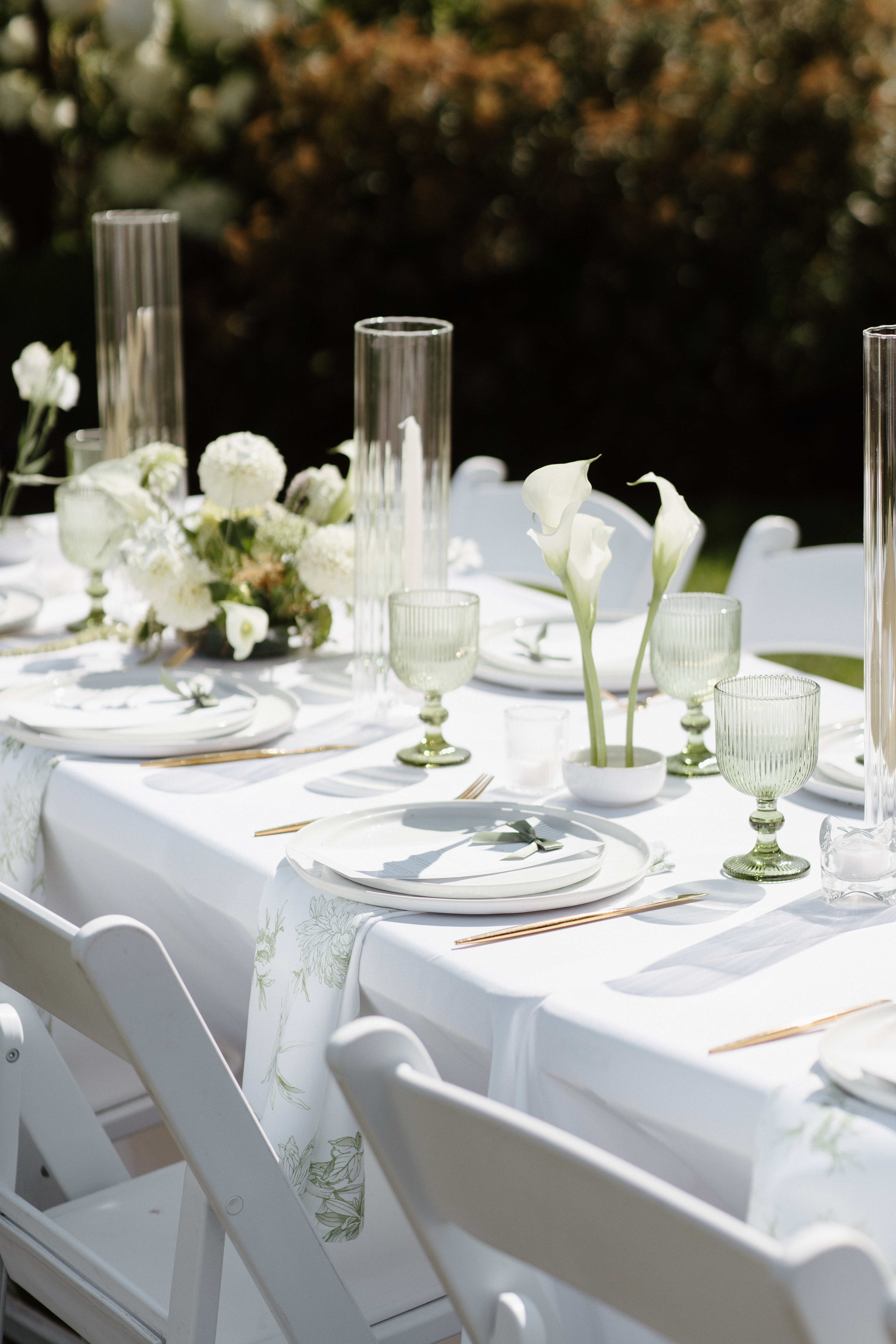 Garland is an easy way to fill your long table. Add candles for a warm and glow-y vibe. Tip: If you're opting for garland, keep in mind if someone will be seated at either end. We make garland in custom lengths based on your specific needs.