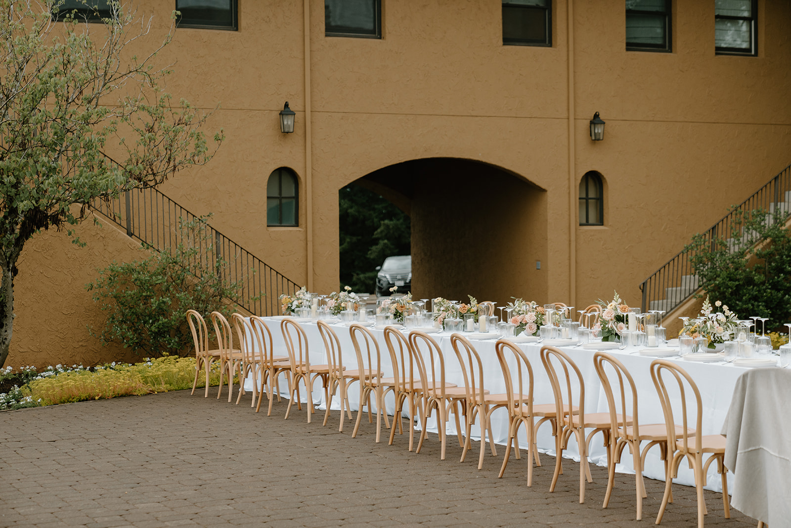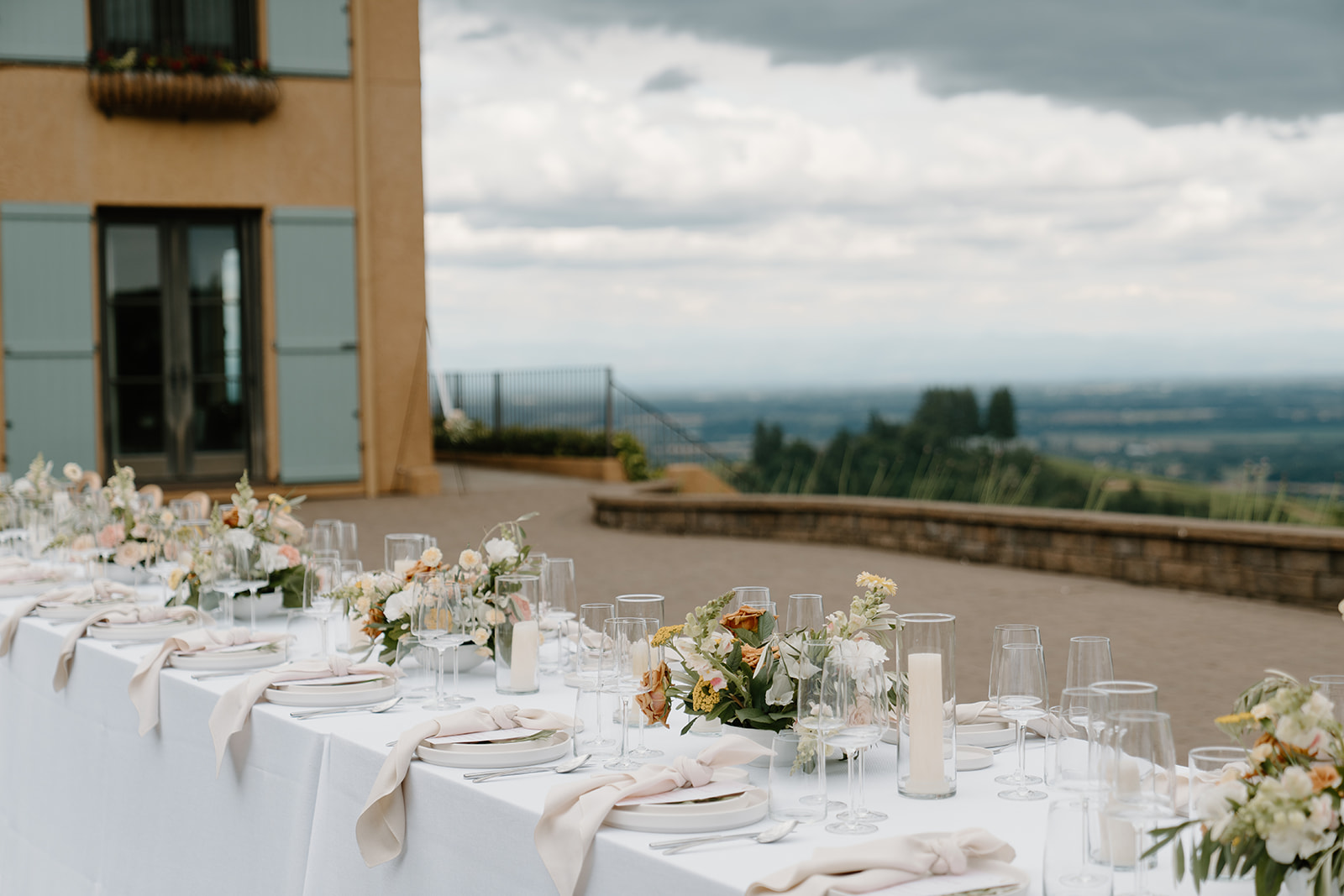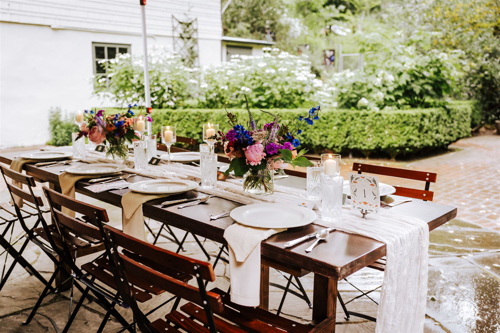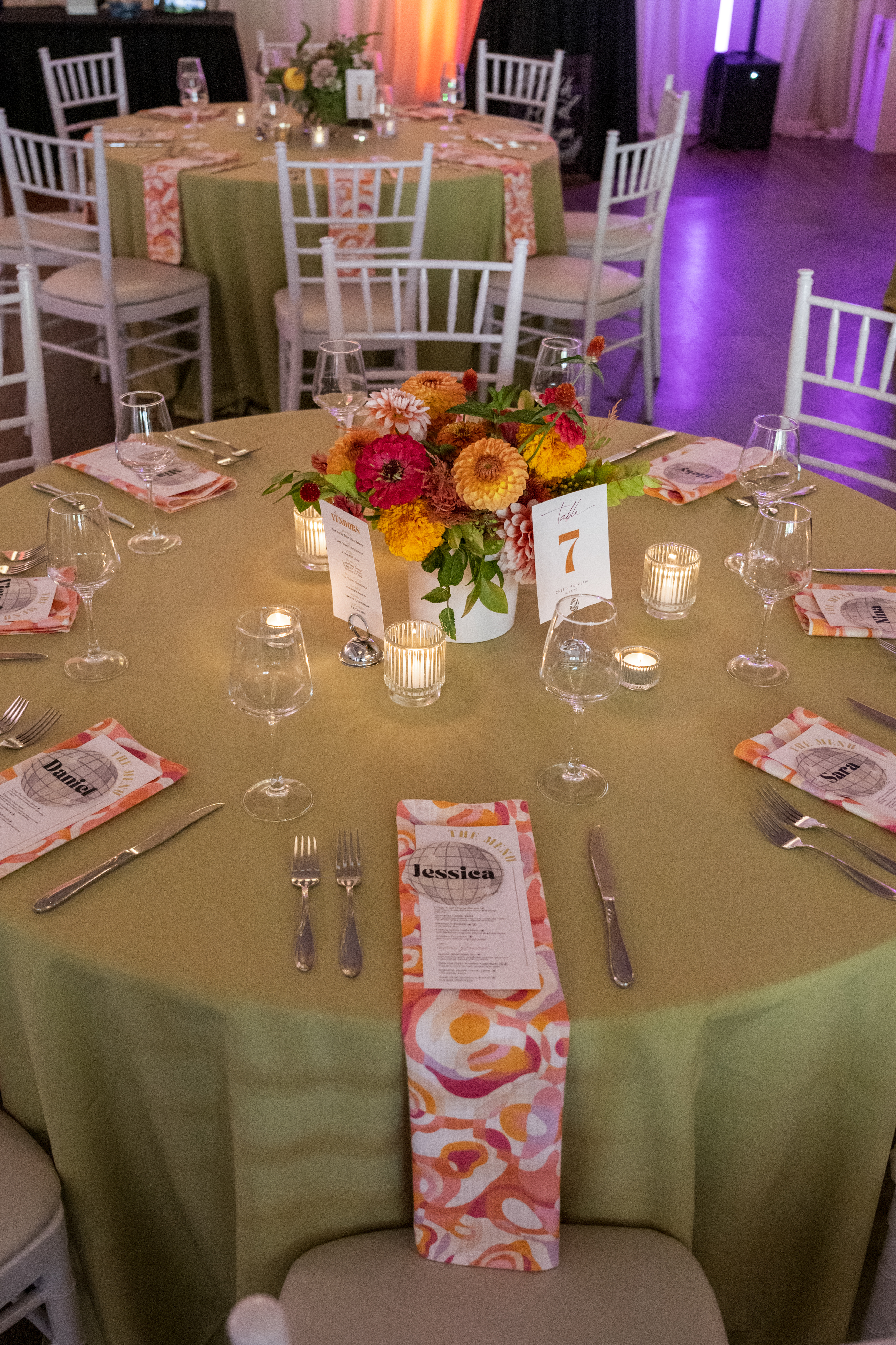 Garland is an easy way to fill your long table. Add candles for a warm and glow-y vibe. Tip: If you're opting for garland, keep in mind if someone will be seated at either end. We make garland in custom lengths based on your specific needs.