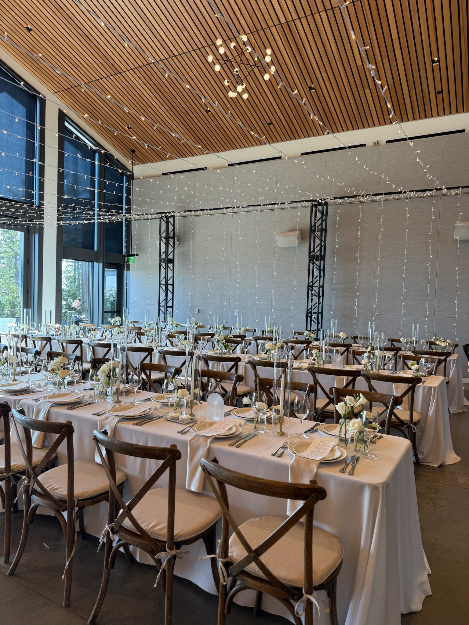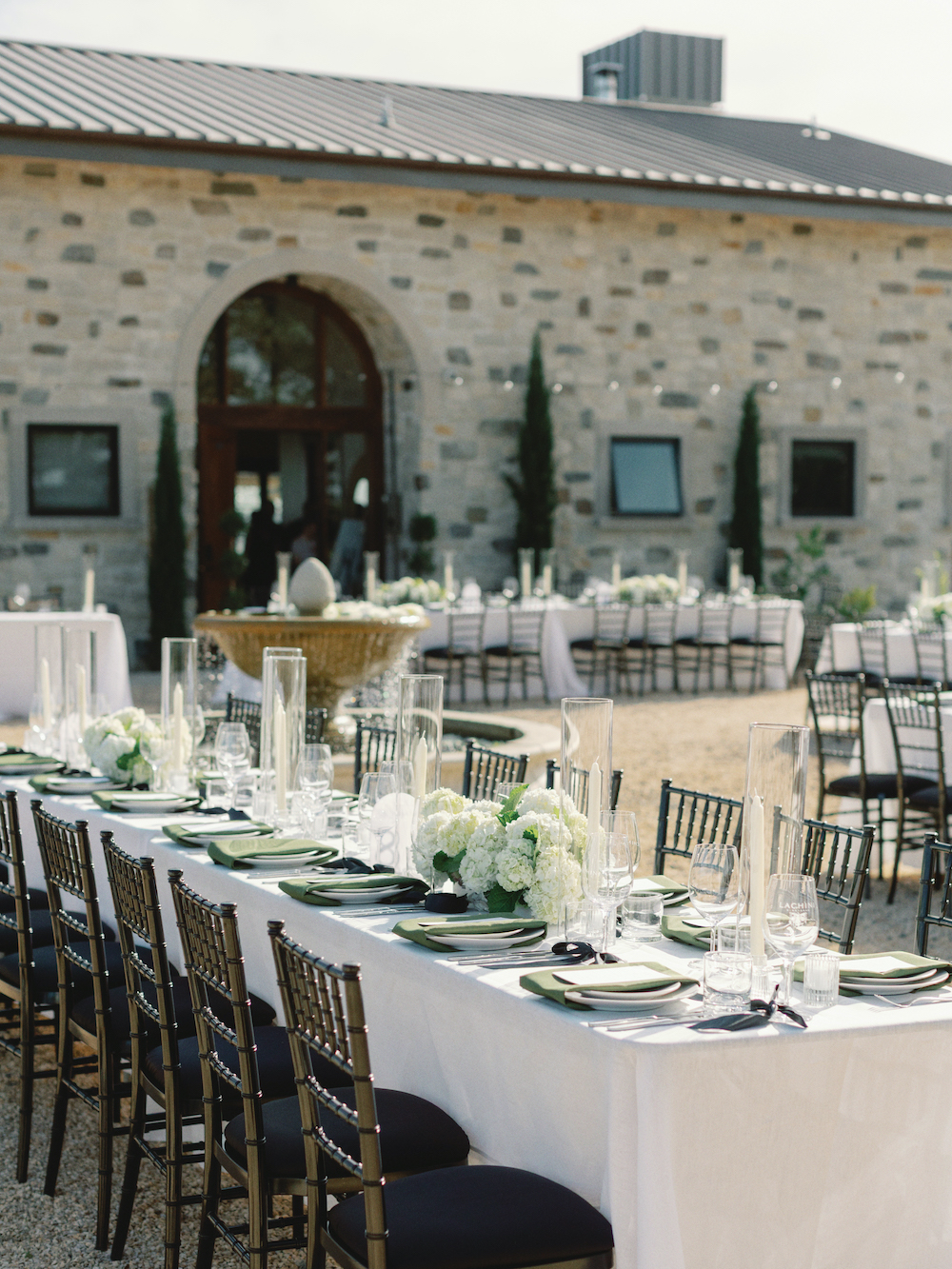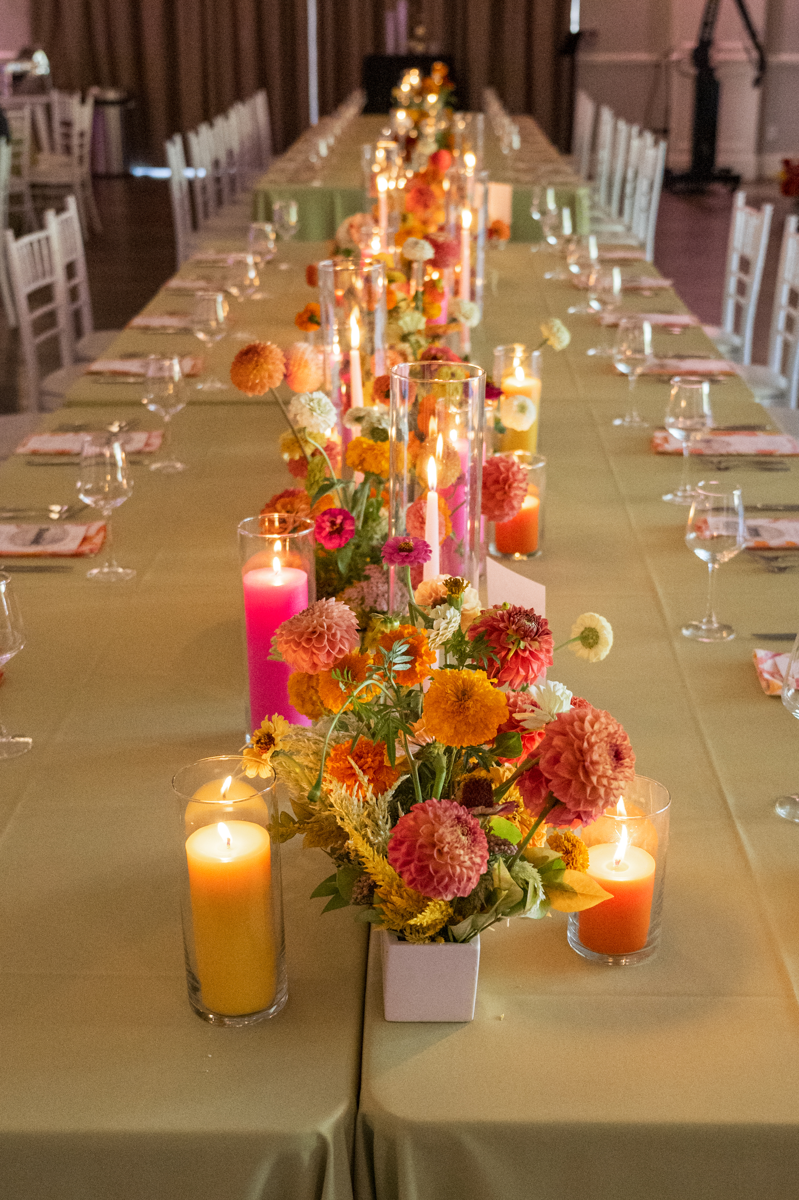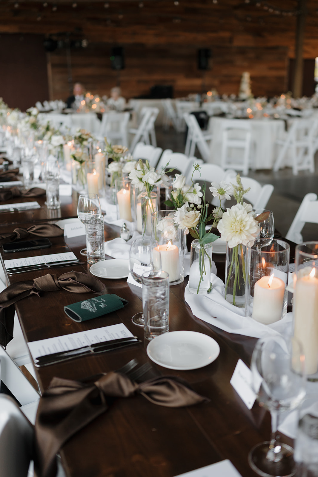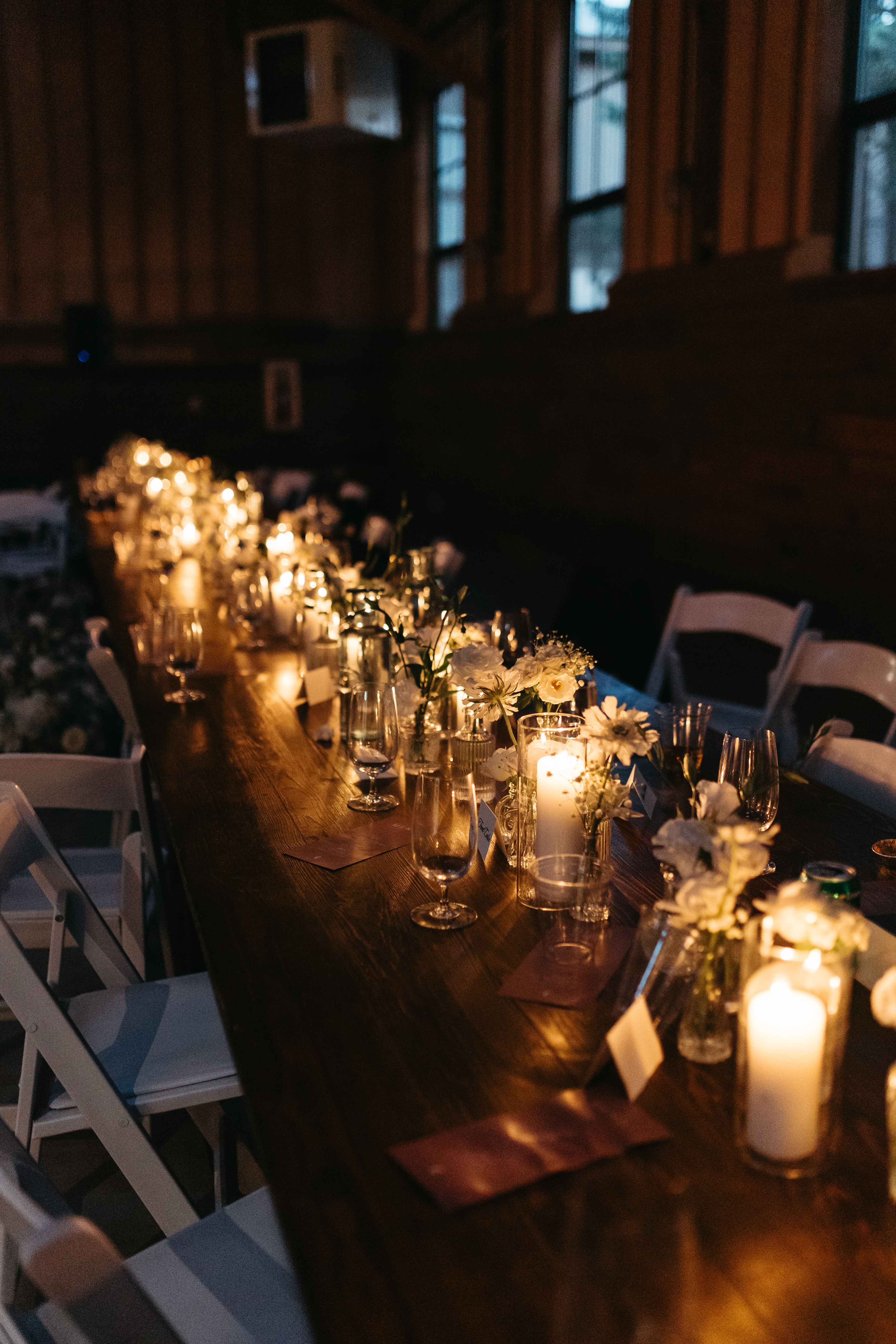 Long tables provide an opportunity to add a variety of centerpieces. They look great with a mix of styles and candles.