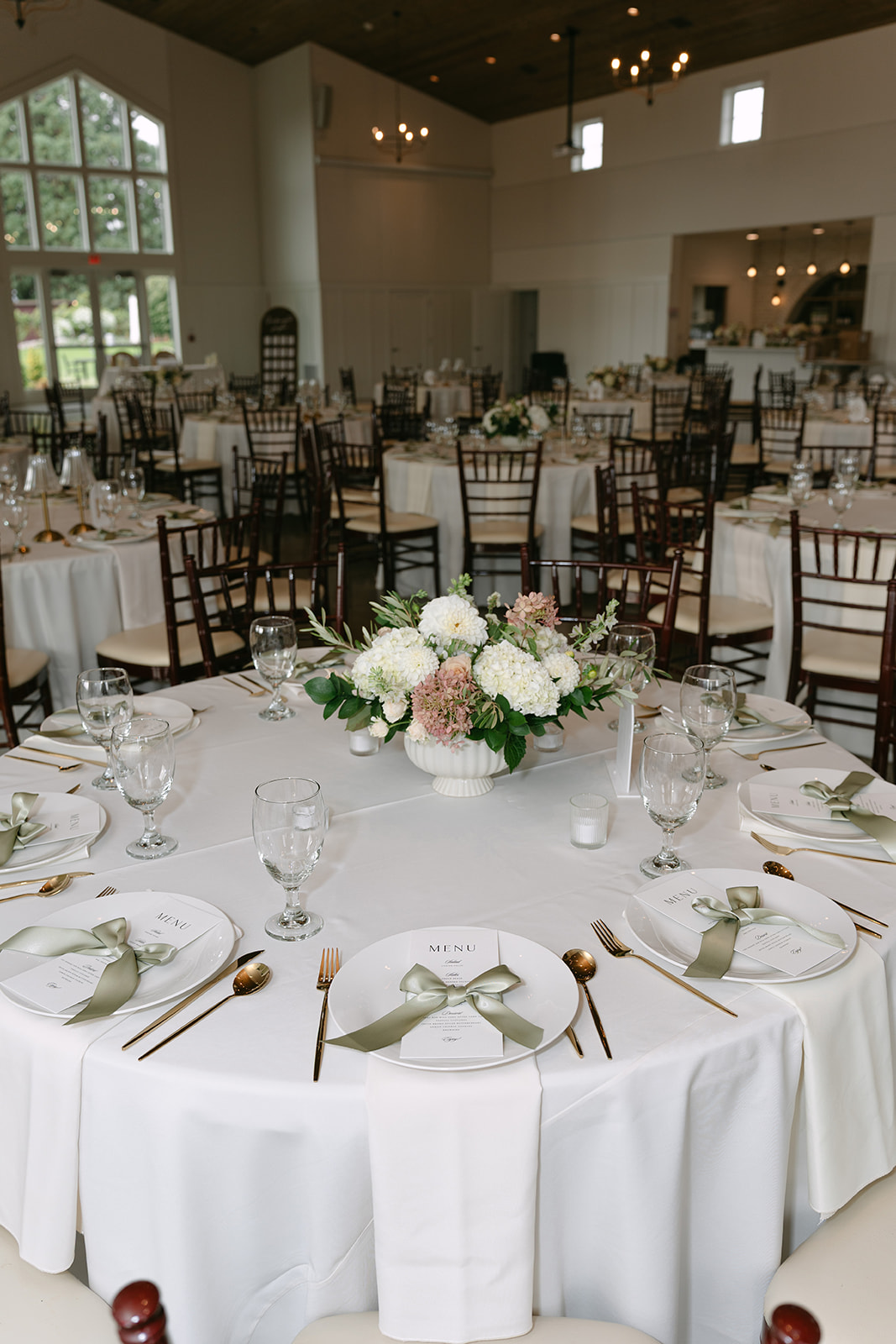Why We Love It: While we always keep in mind the height of centerpieces for ease of conversation, this option is the lowest and fullest for a round table. Works beautifully on 60” or 72” round.