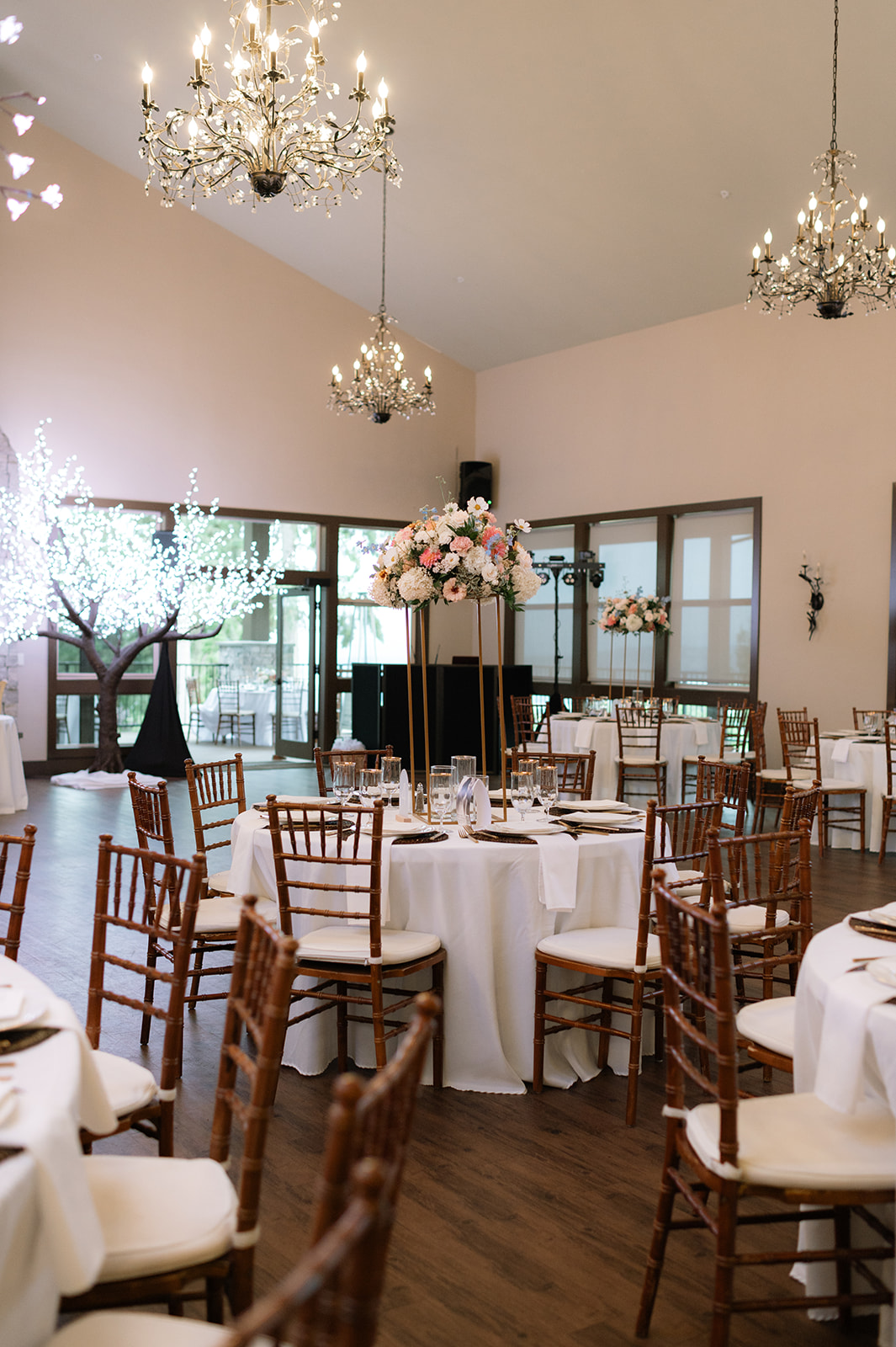 Medium arrangements, compotes, low & rounds, elevated arrangements, and bud vase trios all fit a round table nicely. Consider adding candles to any of your centerpiece options for a little extra warmth.